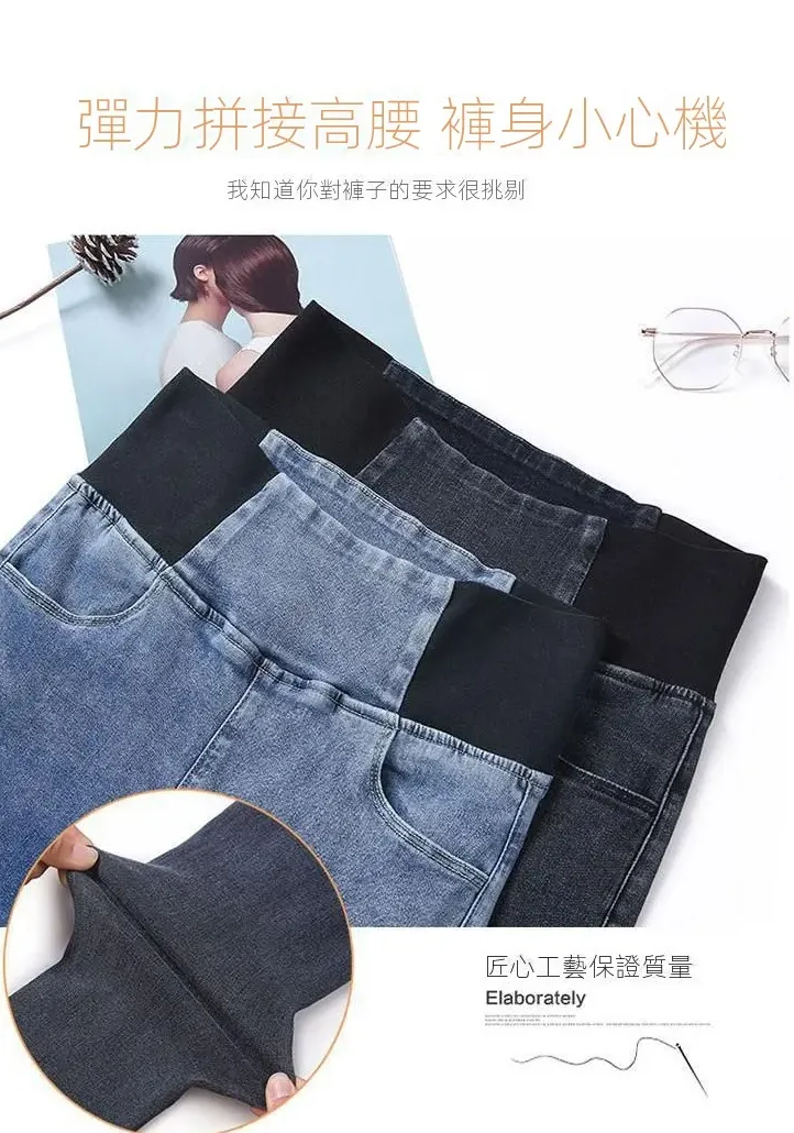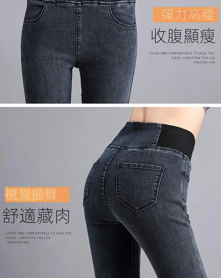 高腰牛仔长裤女2022春秋新款弹力加大码胖mm修身小脚裤松紧腰黑色
