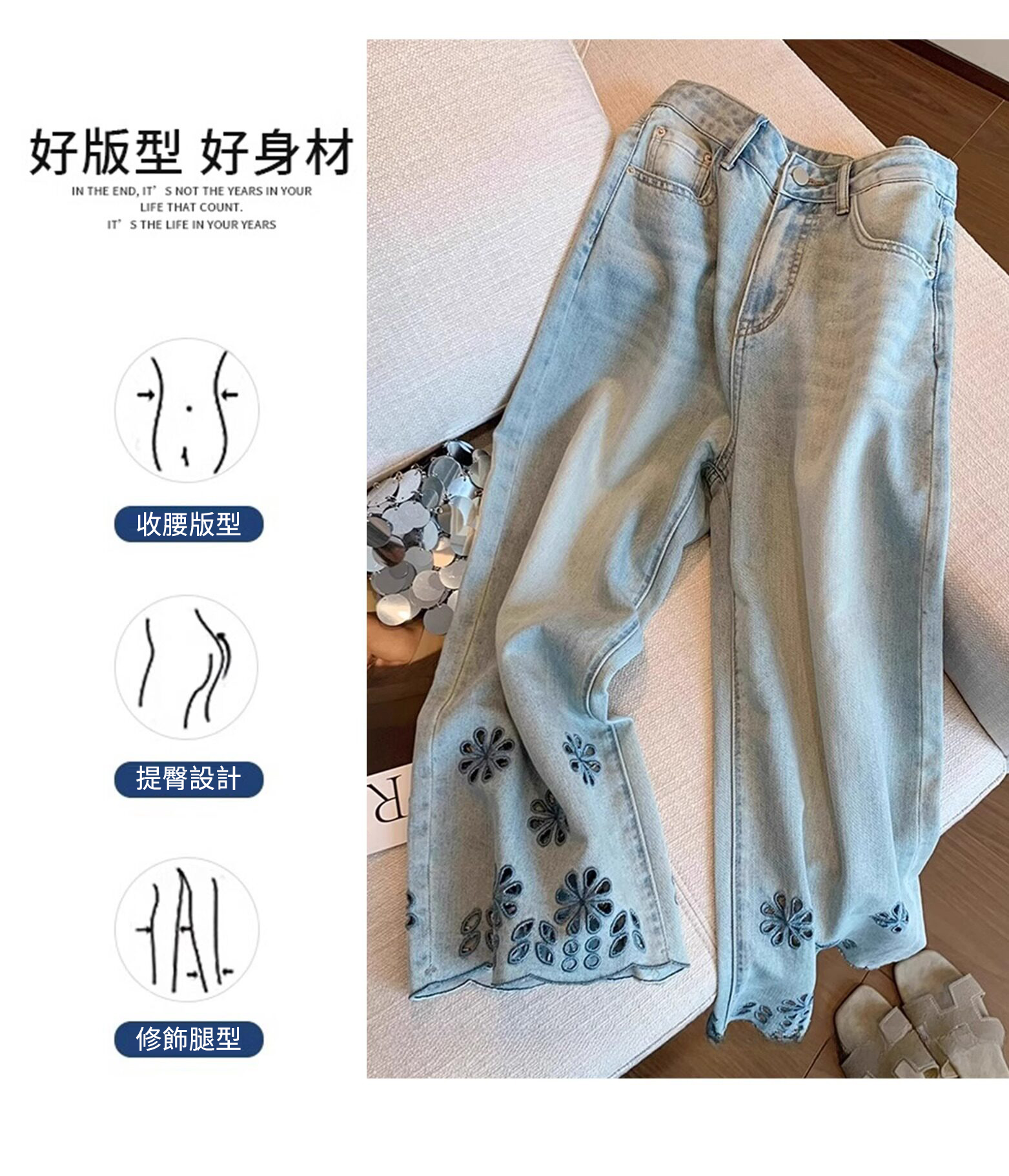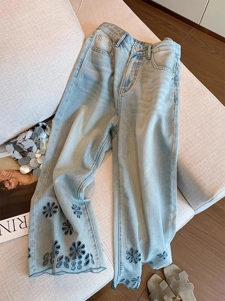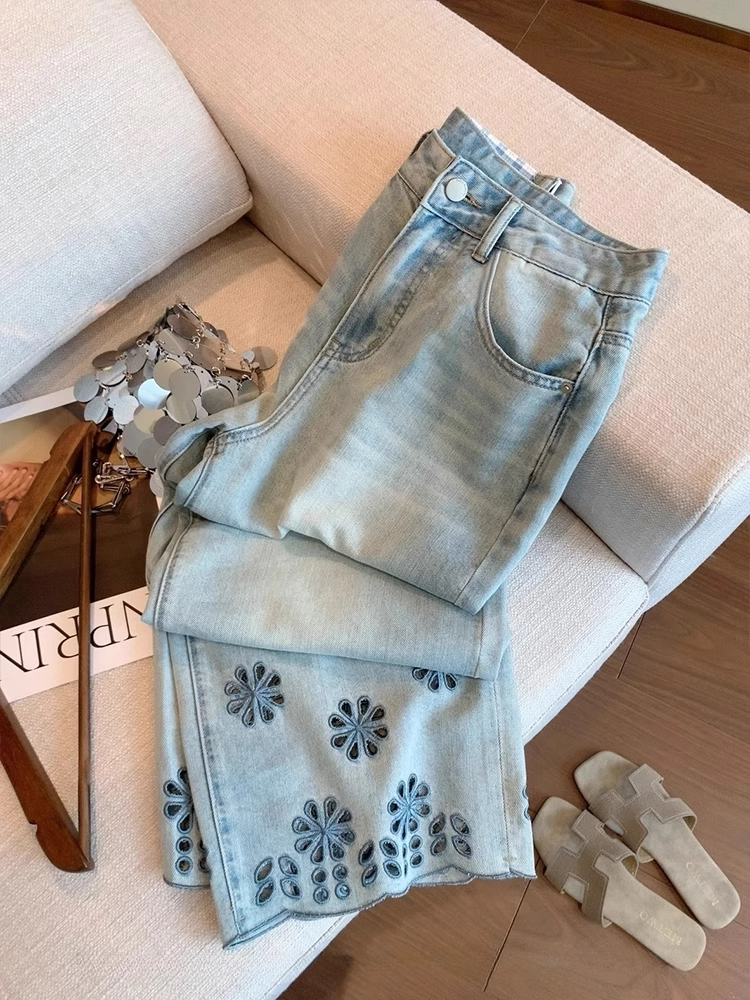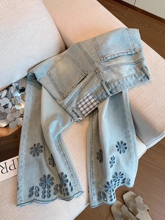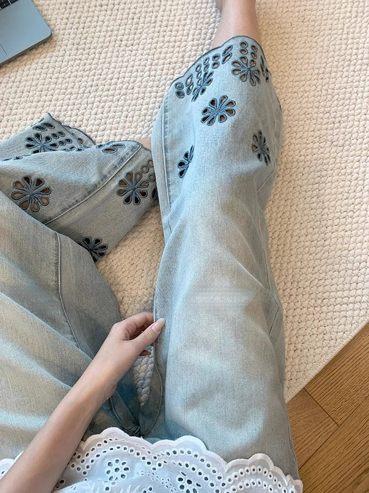 花邊鏤空刺繡設計感薄款高腰直筒九分牛仔褲
