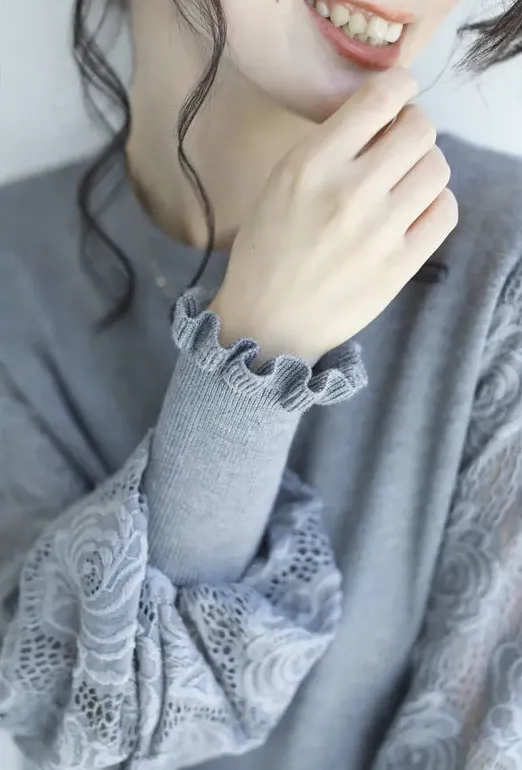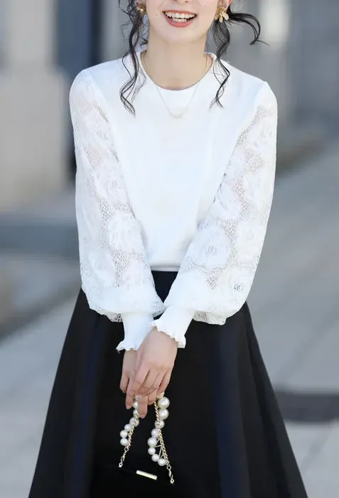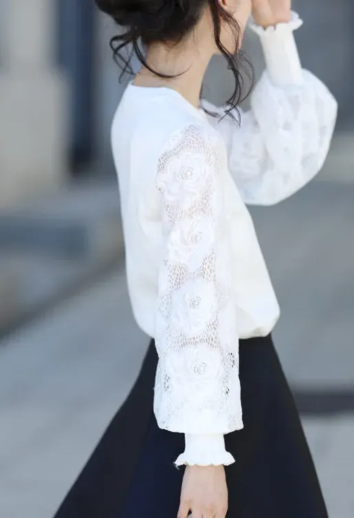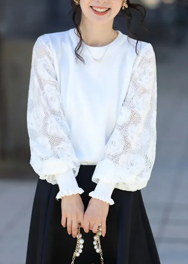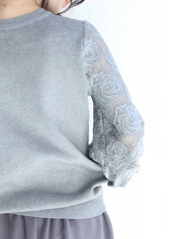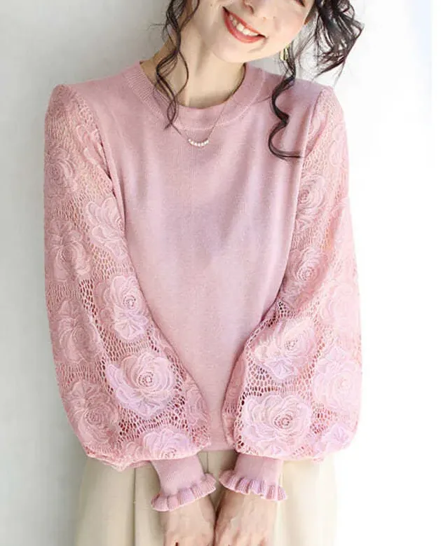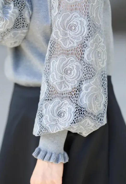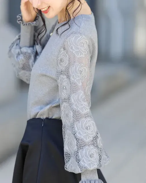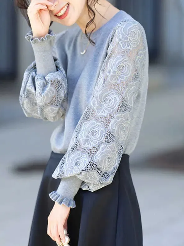 法式氣質蕾絲拼接燈籠袖圓領套頭毛衣針織衫