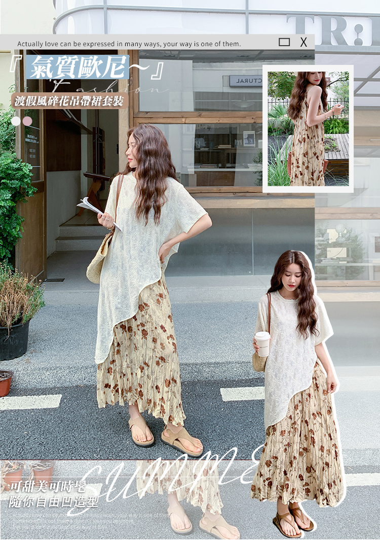 【單件/套裝】法式度假風氛圍感不規則蕾絲罩衫+吊帶碎花裙兩件套