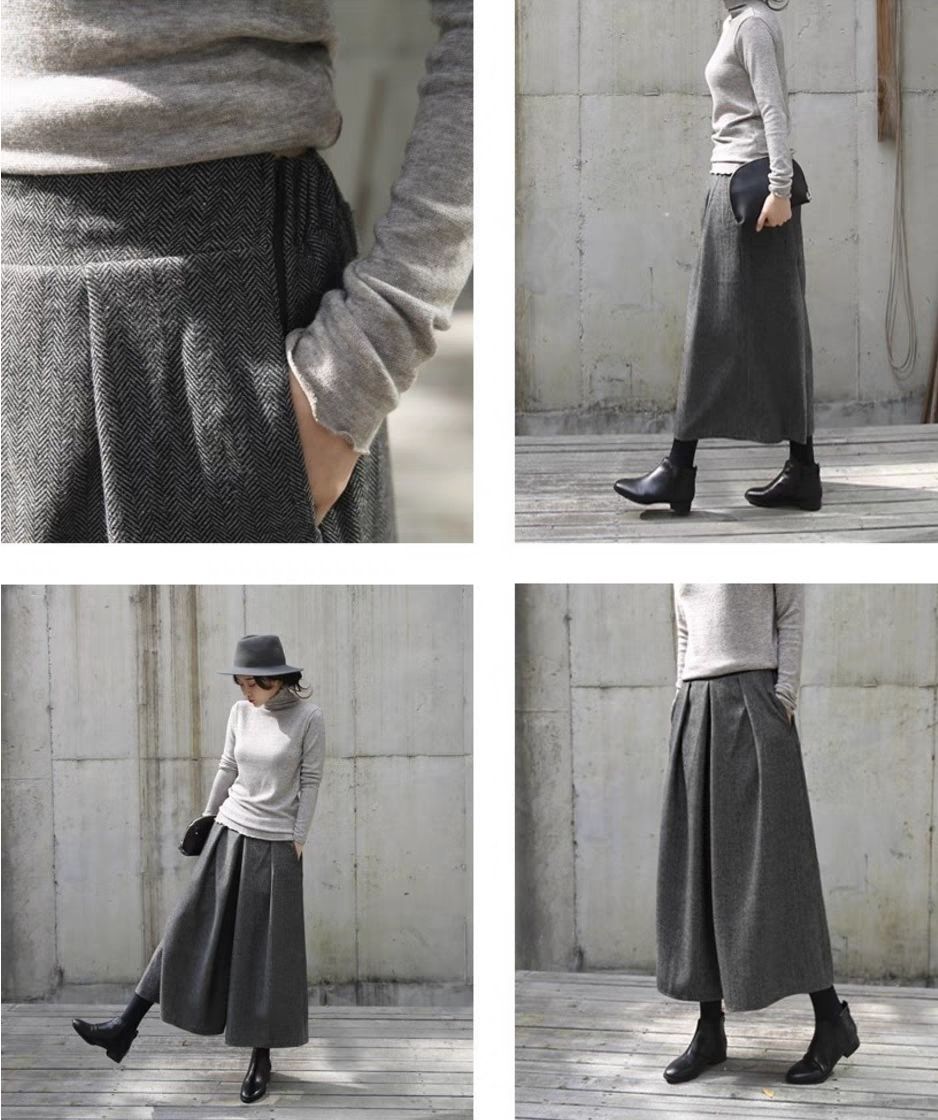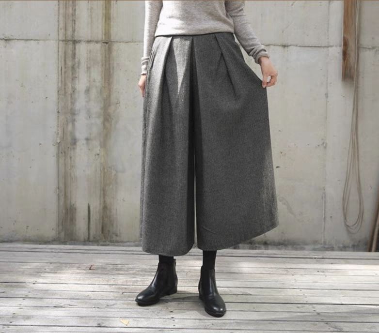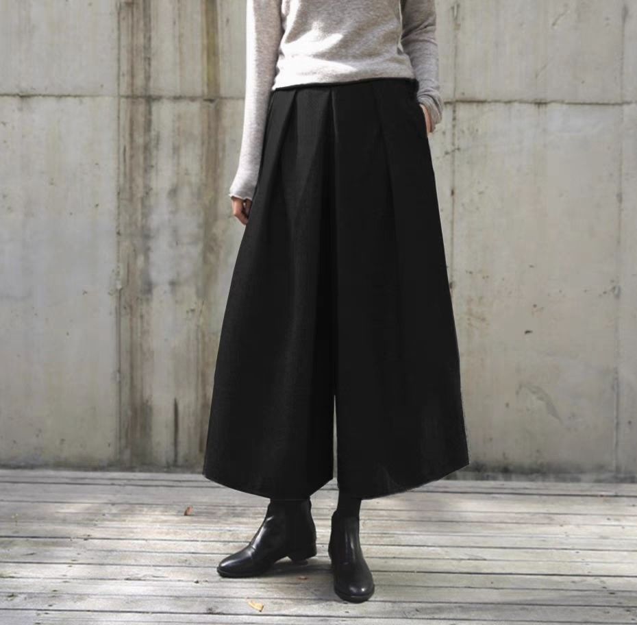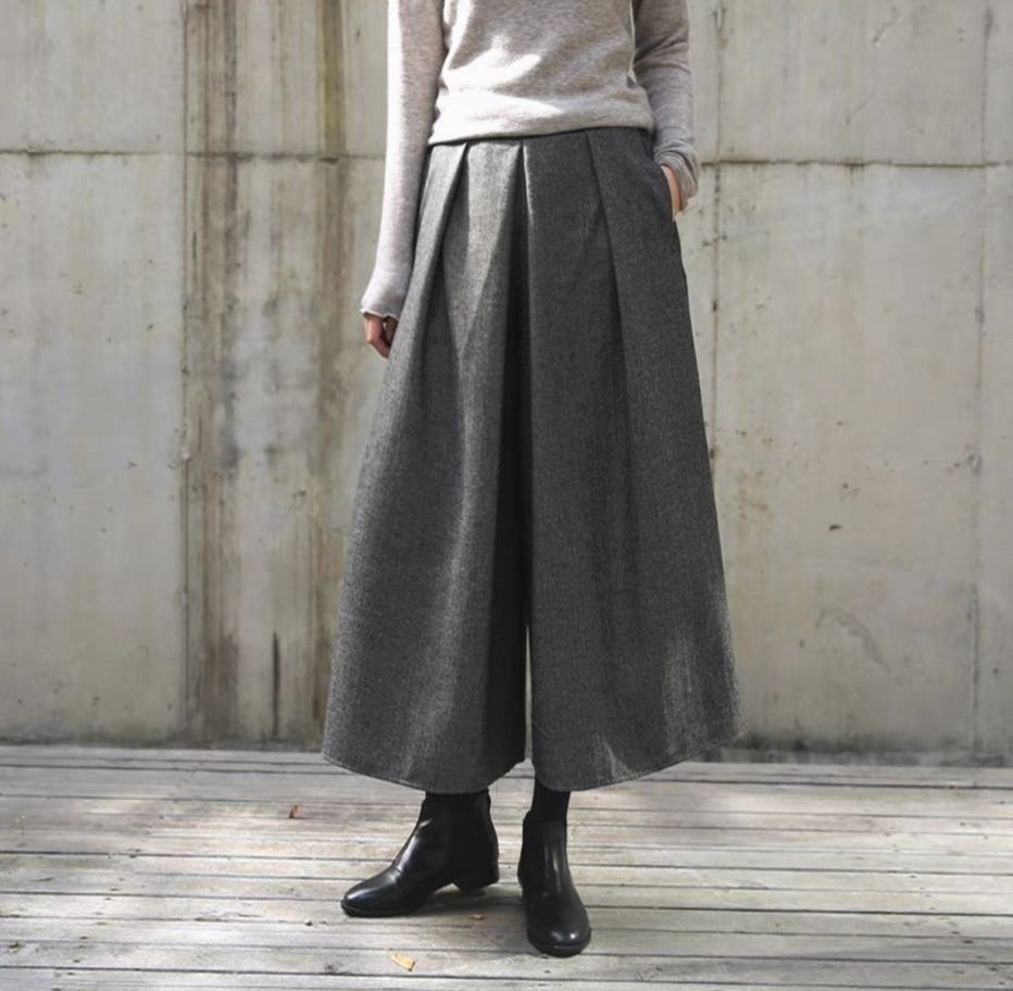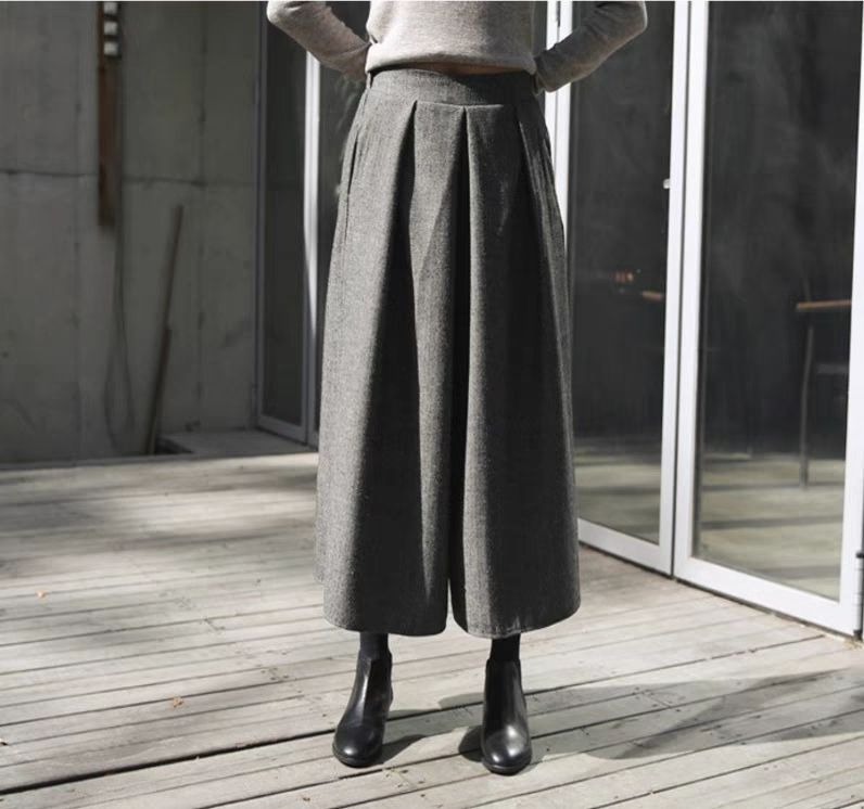 鬆緊腰裙褲九分褲毛呢褲子顯瘦a型寬鬆闊腿褲裝