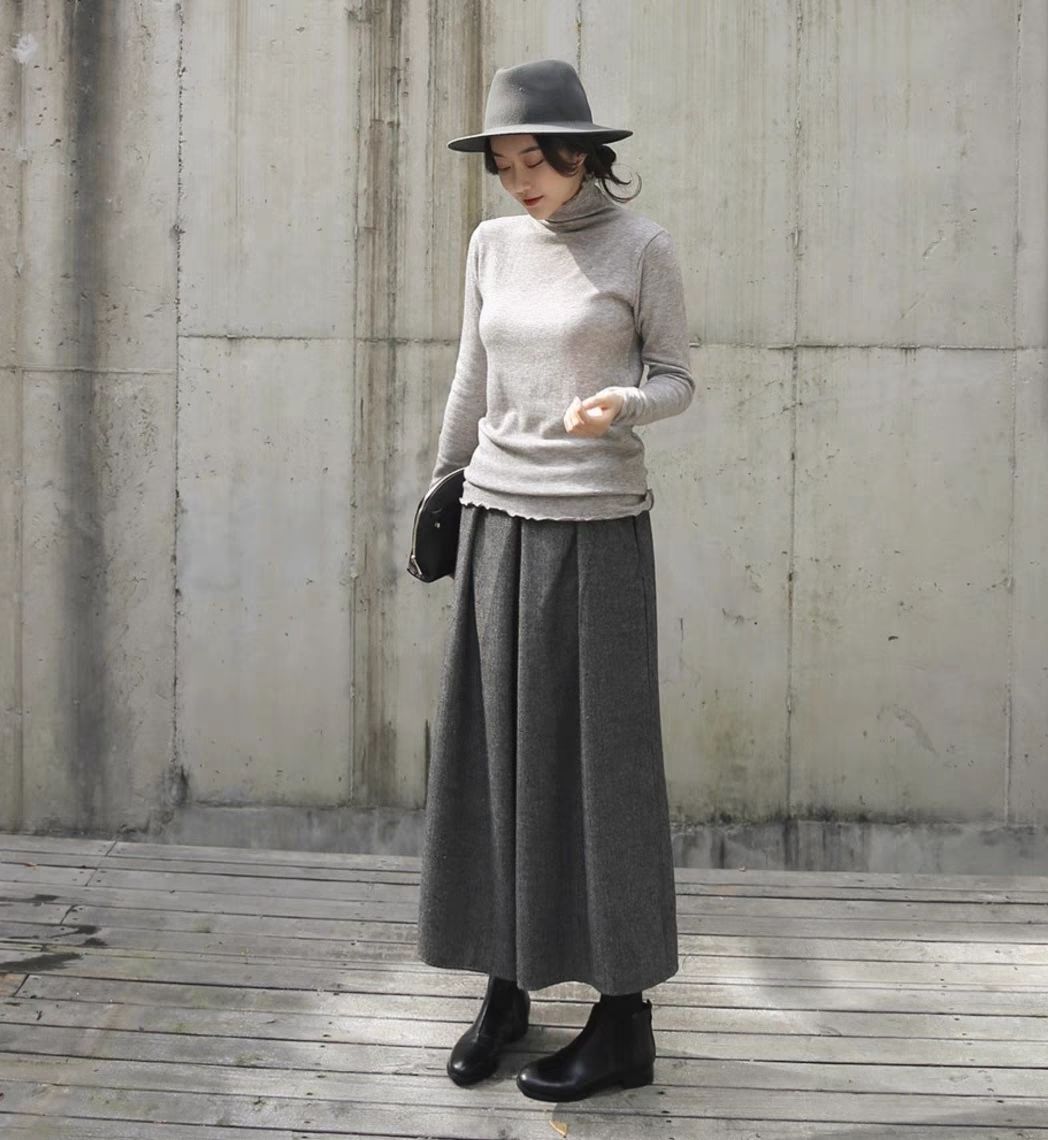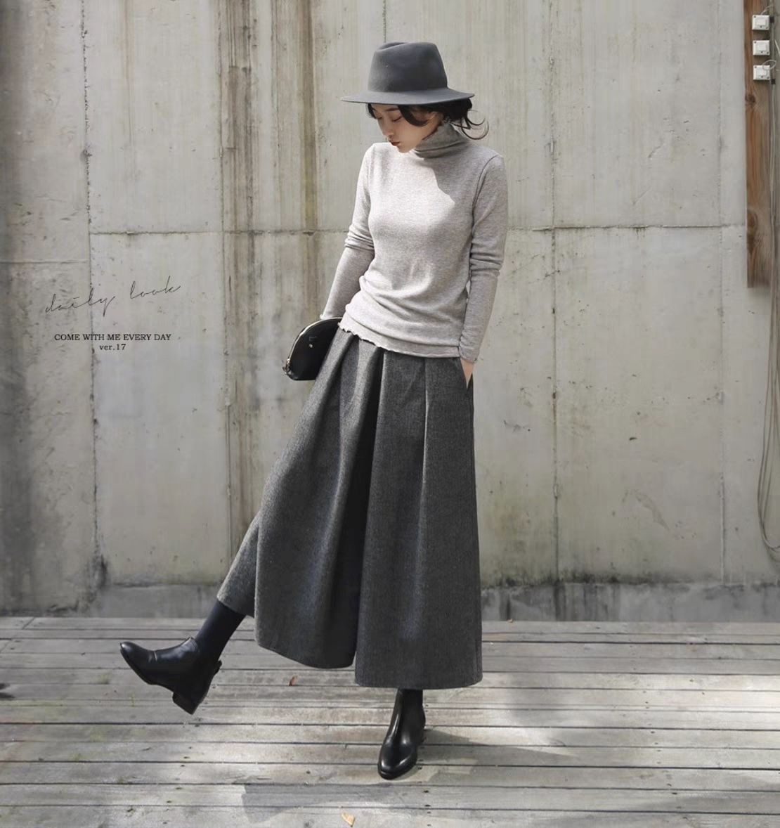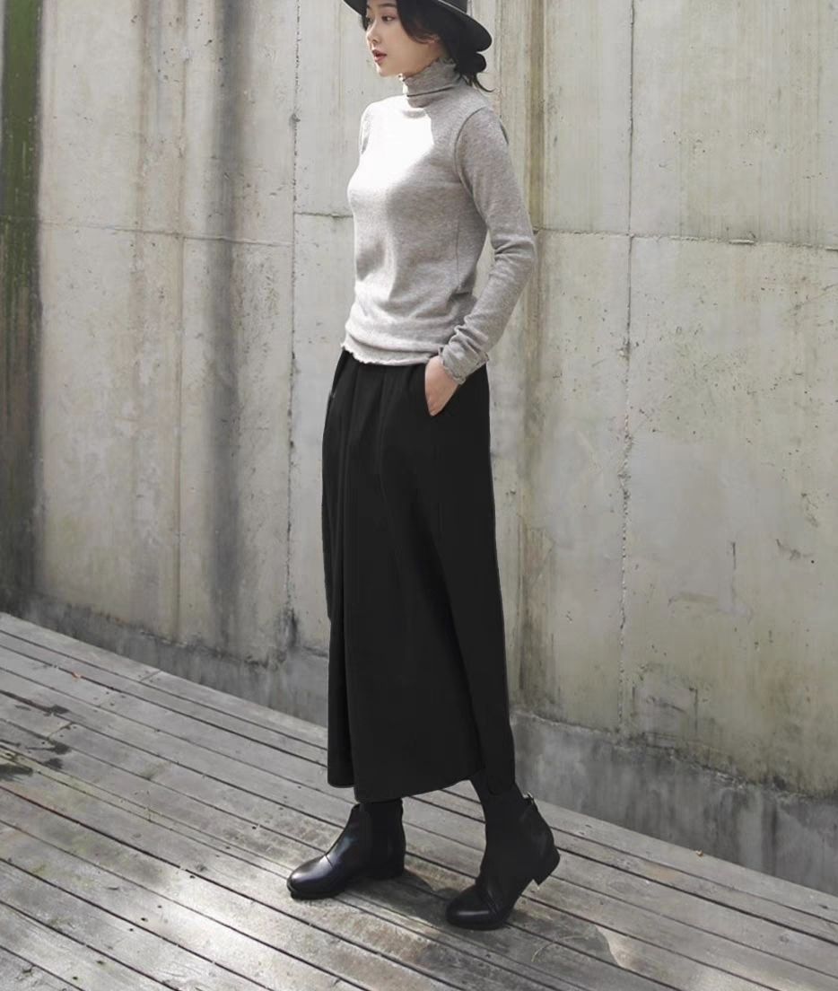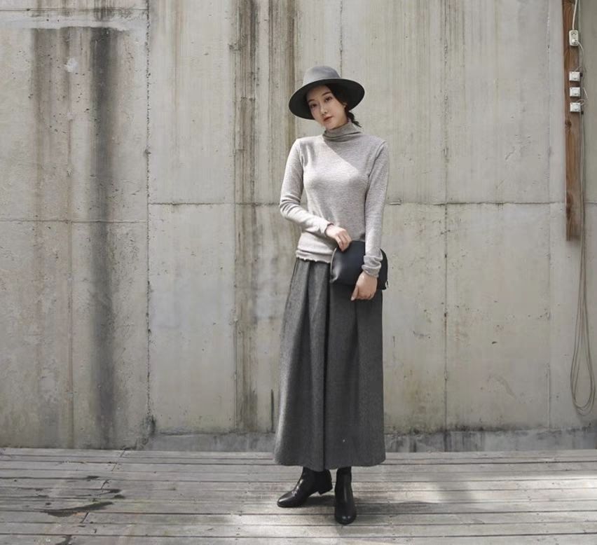 鬆緊腰裙褲九分褲毛呢褲子顯瘦a型寬鬆闊腿褲裝