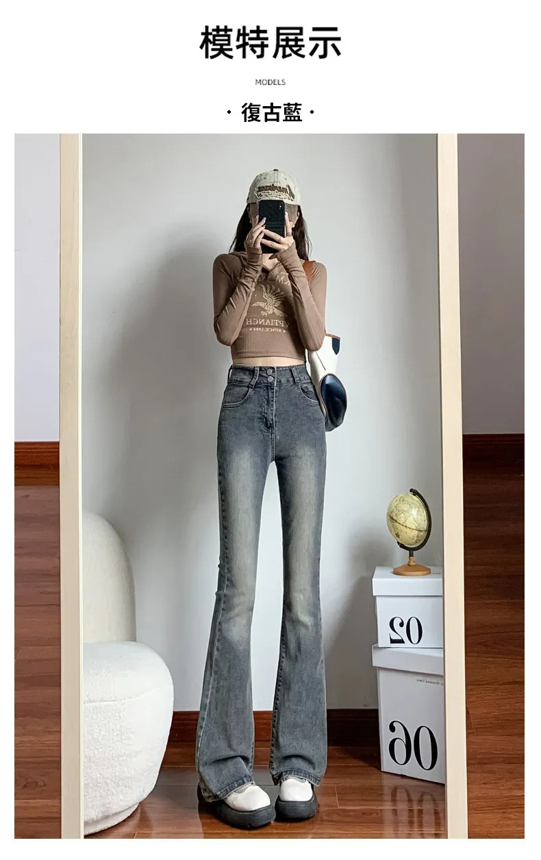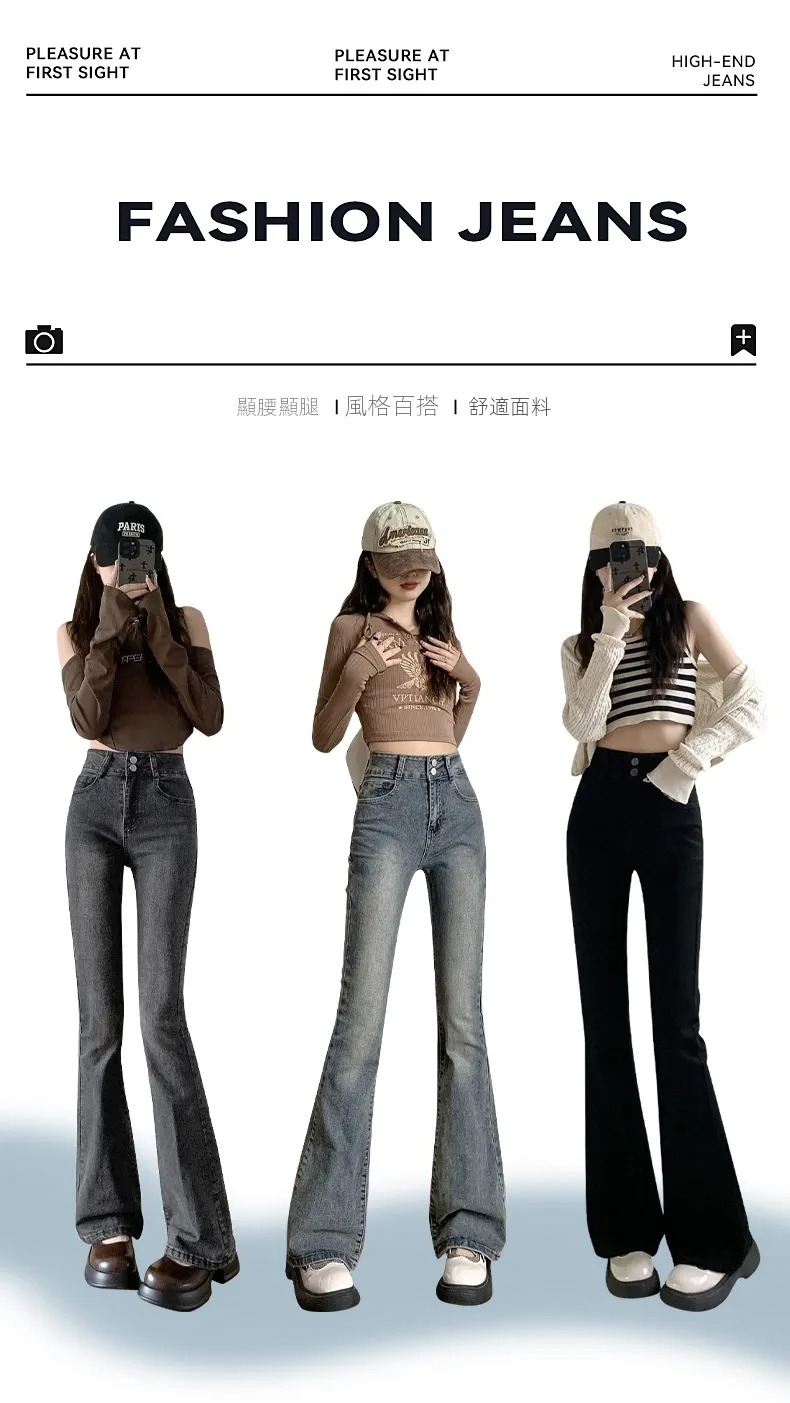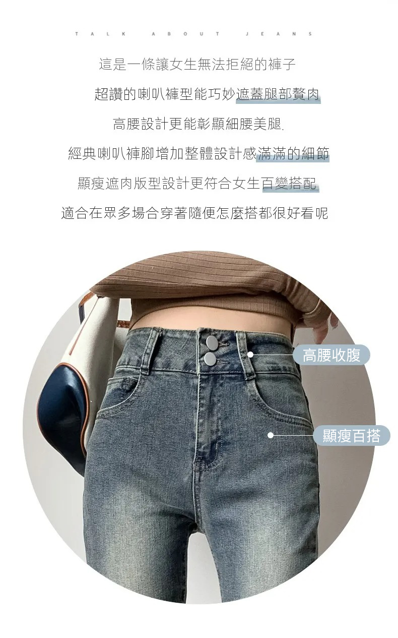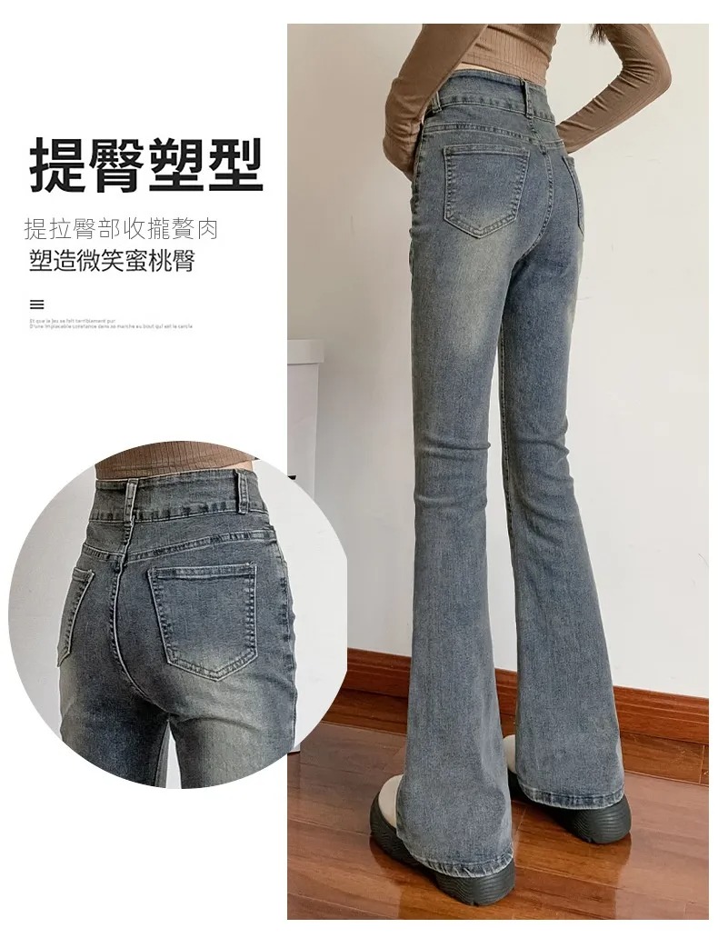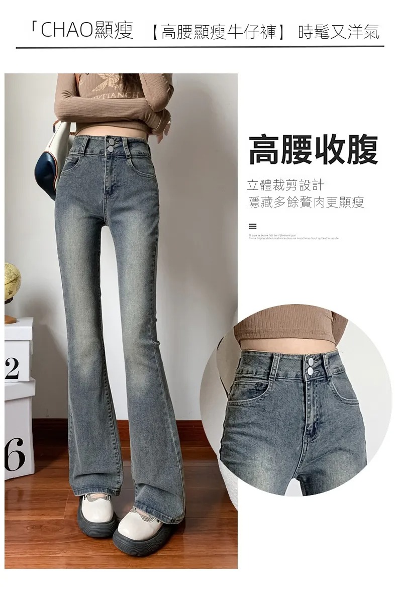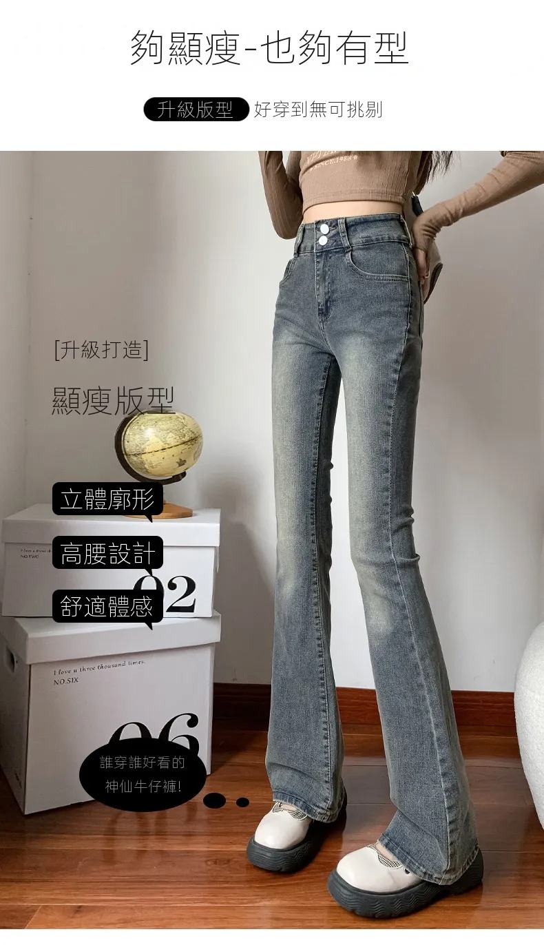 美式百搭舒適顯瘦高腰馬蹄微喇叭牛仔褲