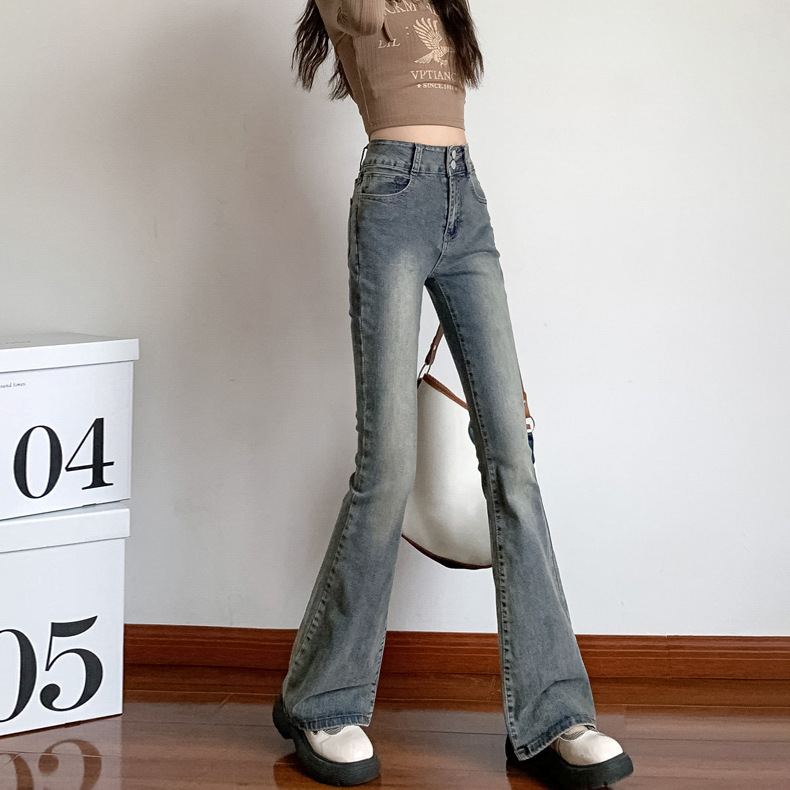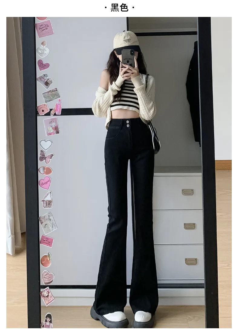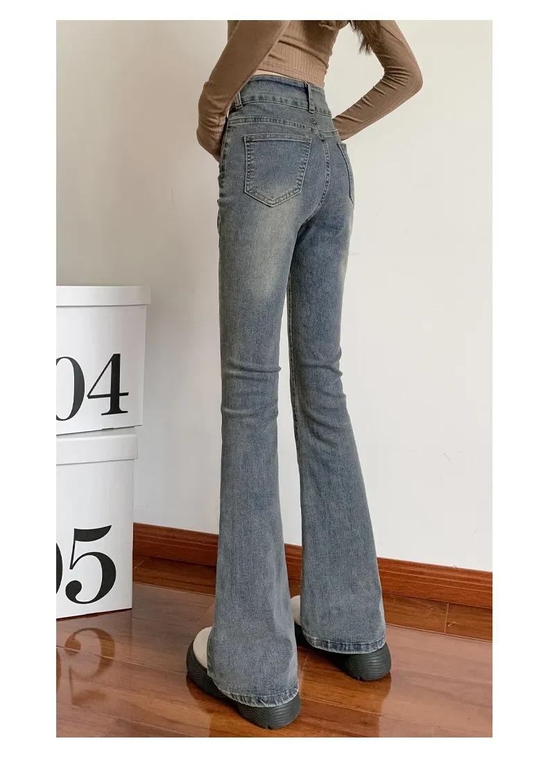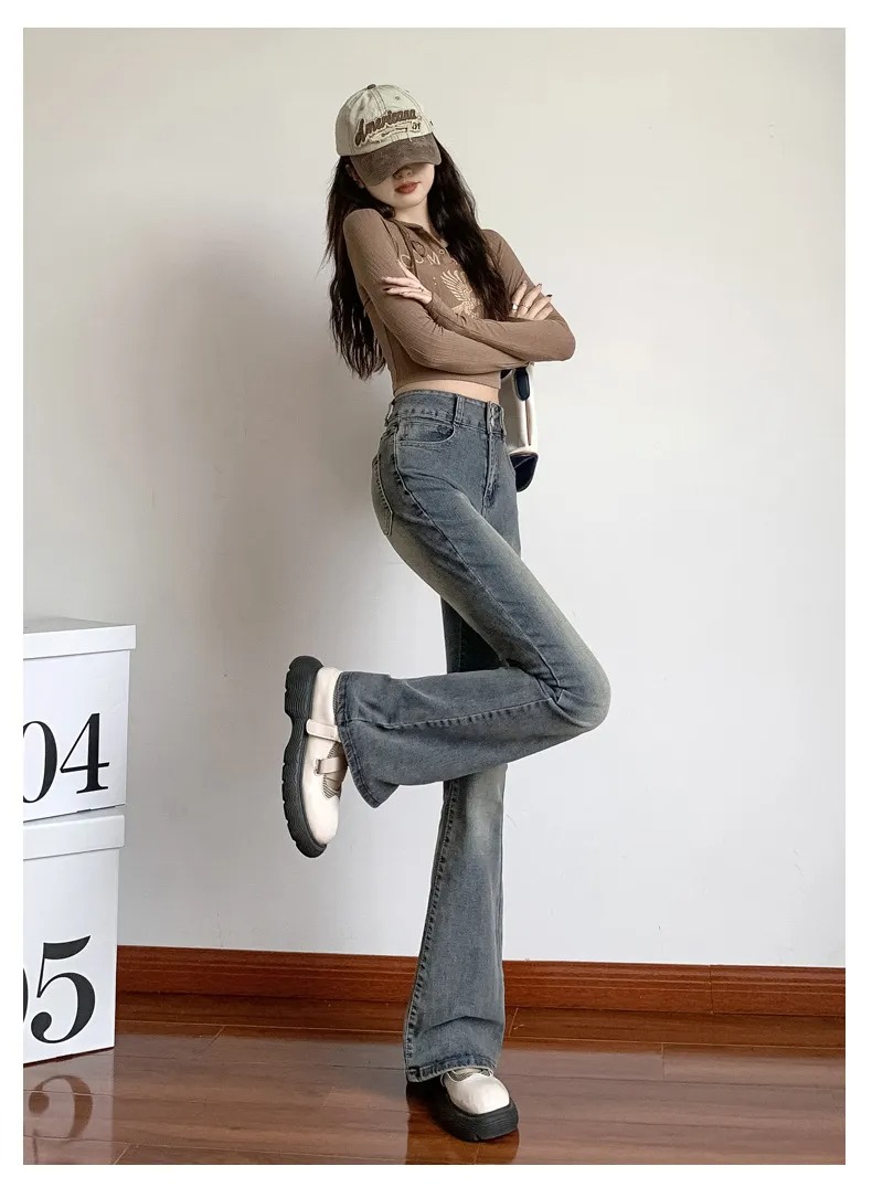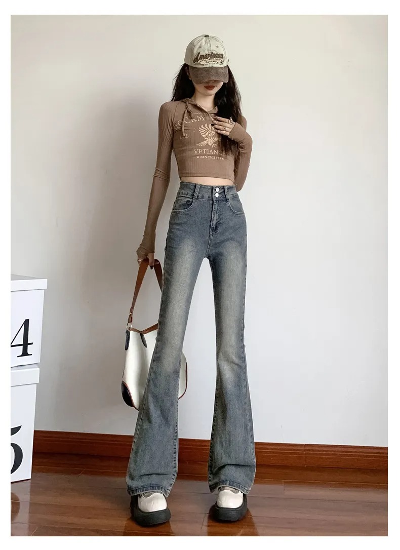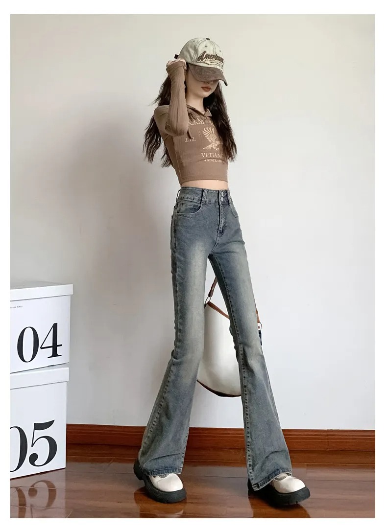 美式百搭舒適顯瘦高腰馬蹄微喇叭牛仔褲