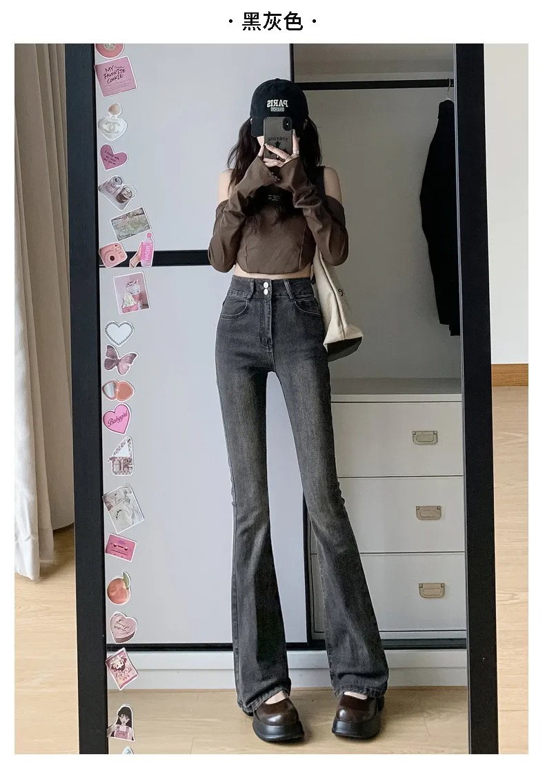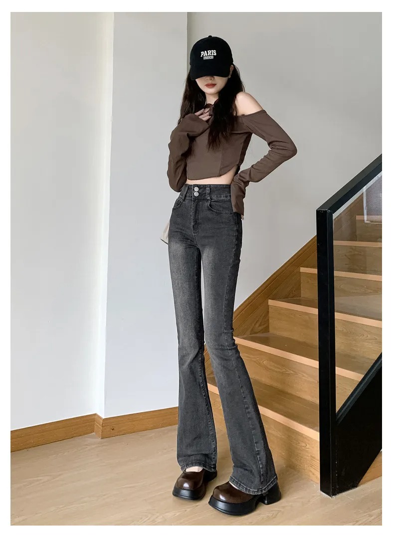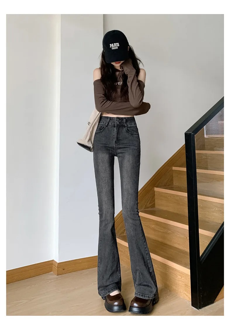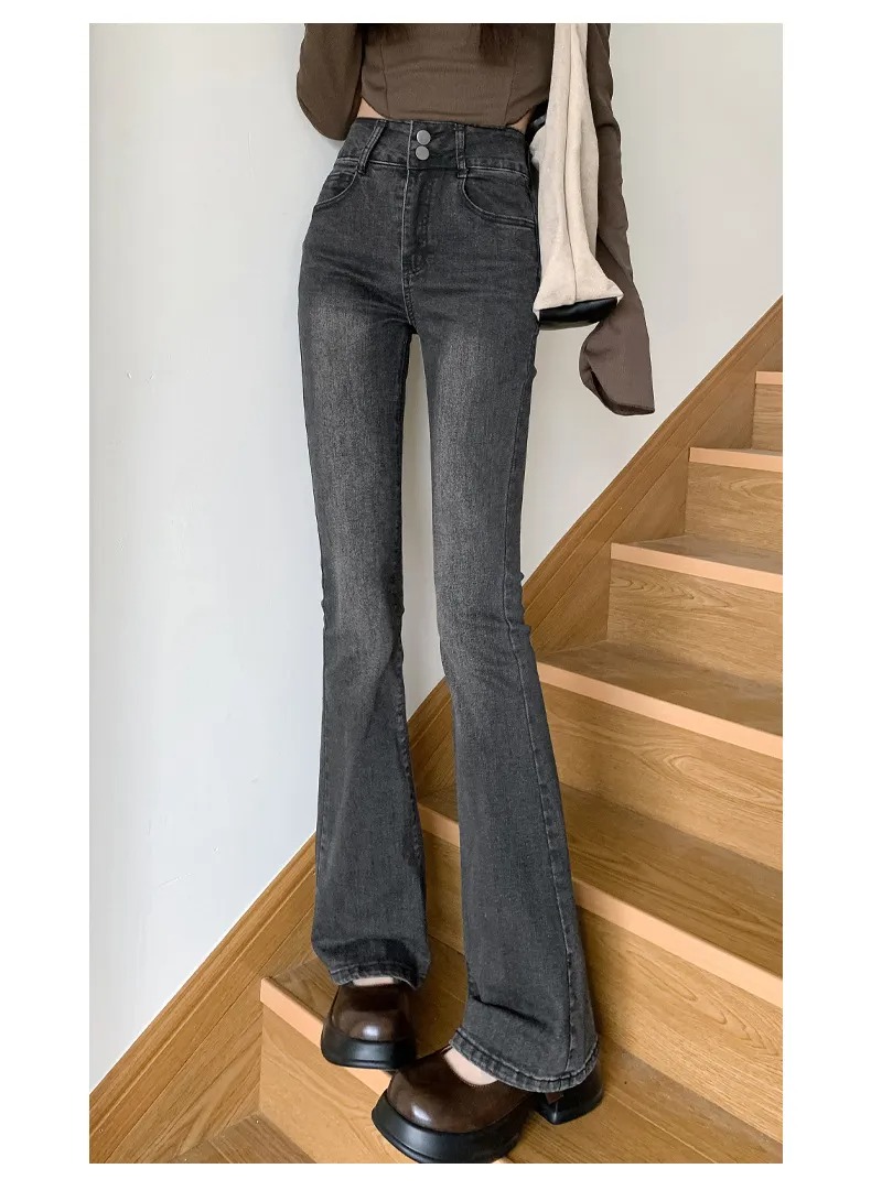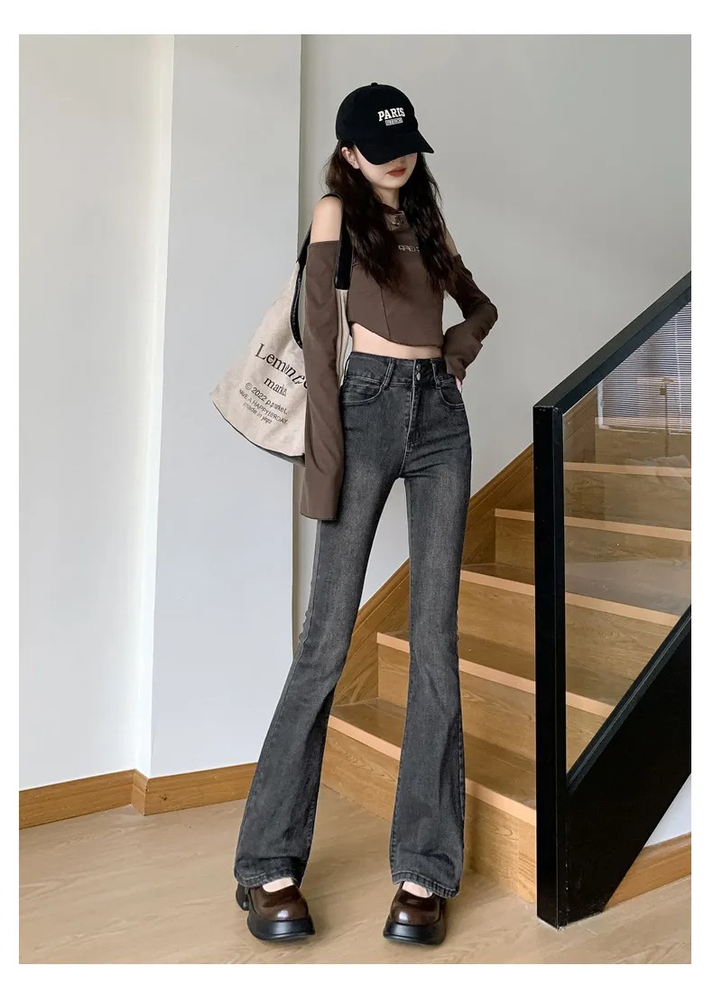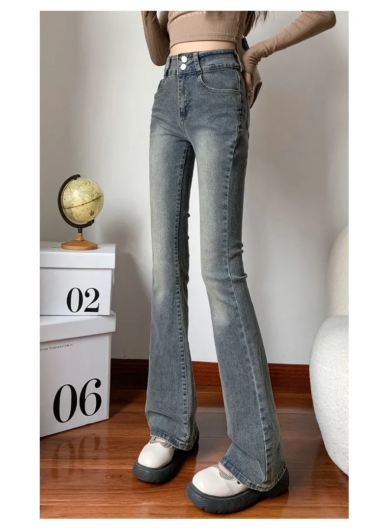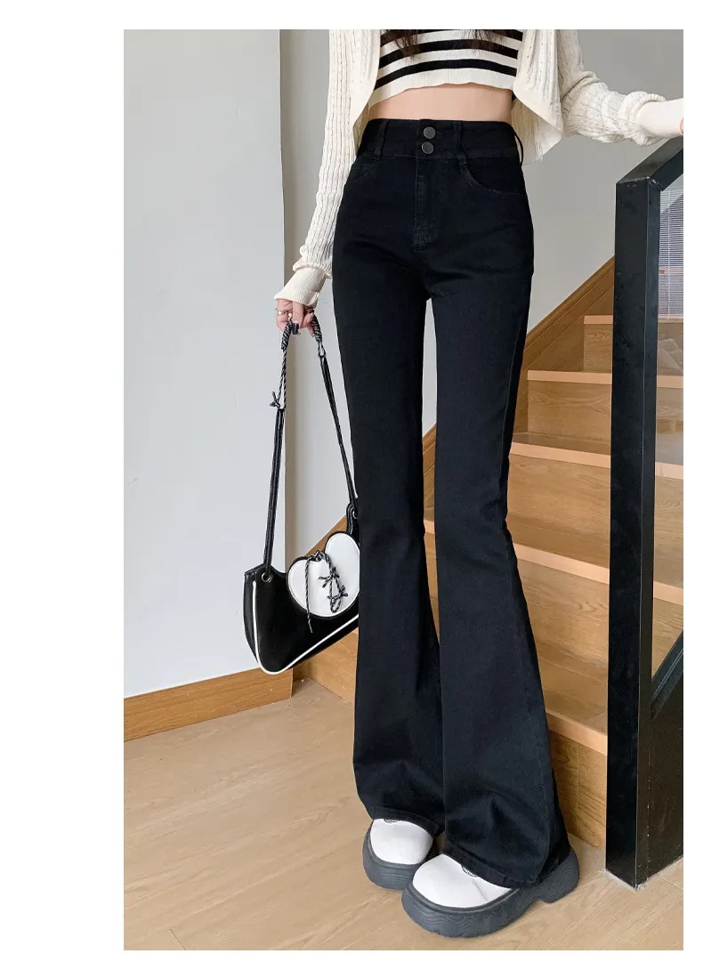 美式百搭舒適顯瘦高腰馬蹄微喇叭牛仔褲