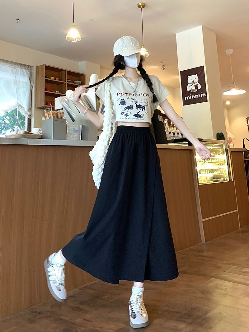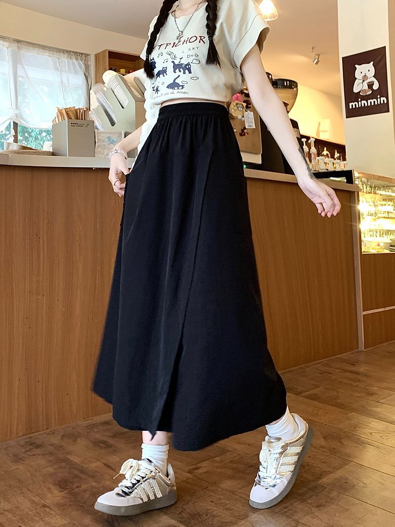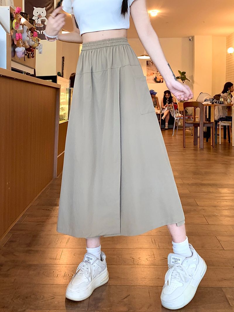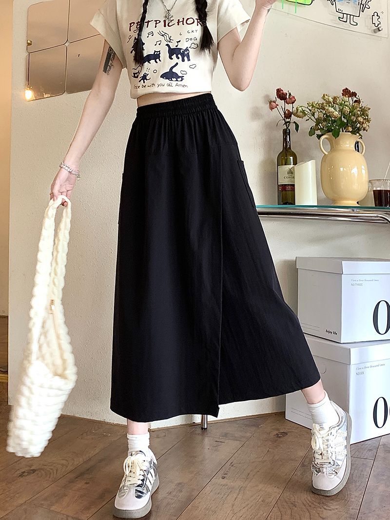 高腰寬鬆休閒九分直筒闊腿設計感拼接褲裙-Cicimode