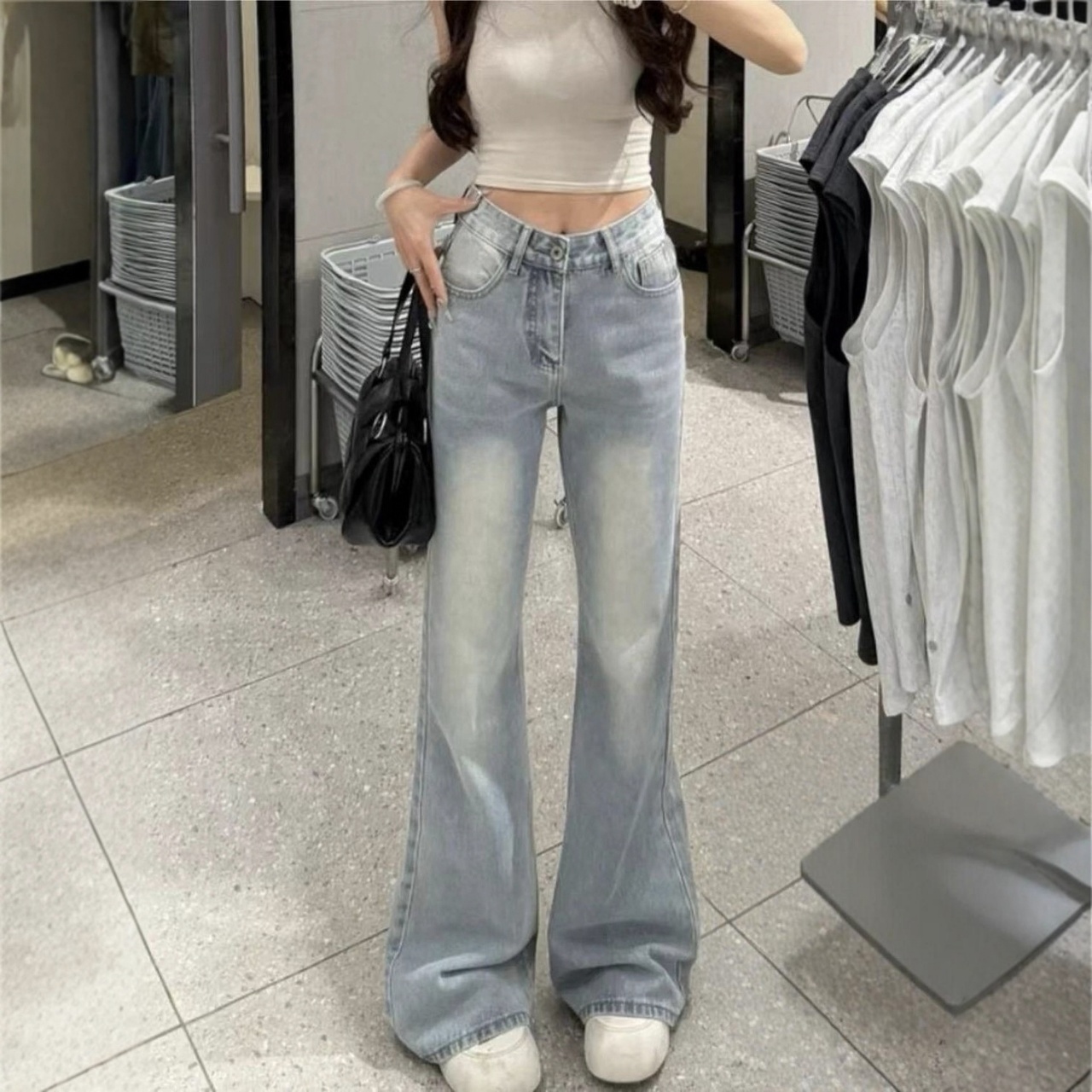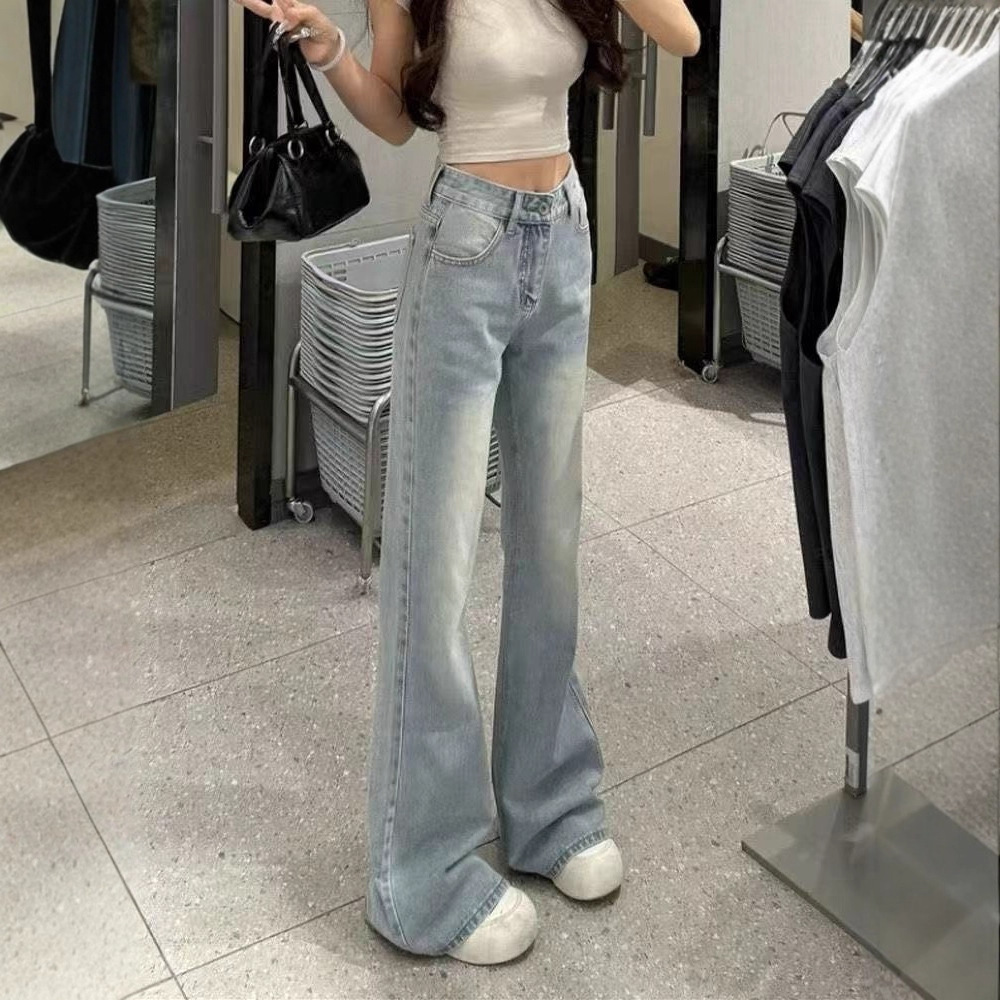 美式復古刷毛加厚高腰顯瘦微喇拖地牛仔褲