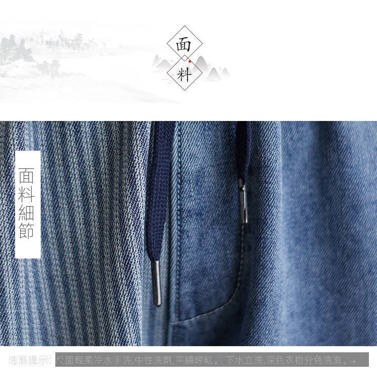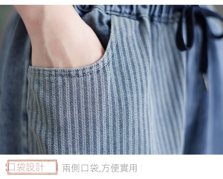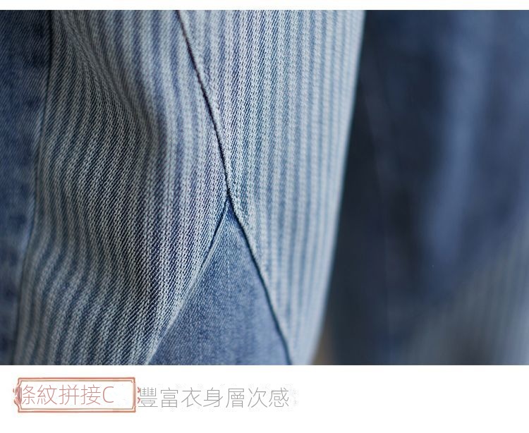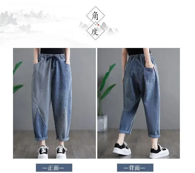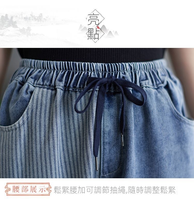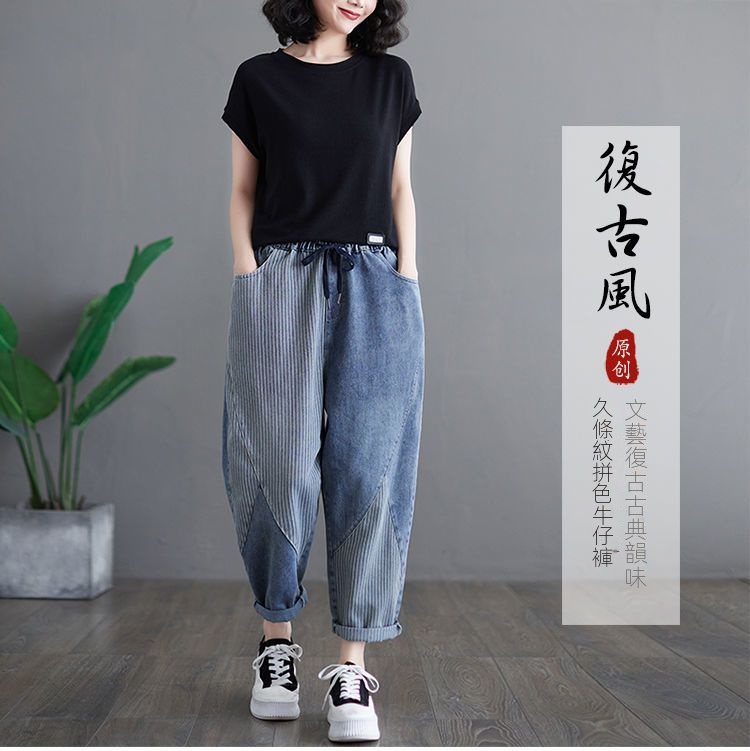 文藝豎條紋拼接大碼寬鬆百搭高腰顯瘦哈倫牛仔褲