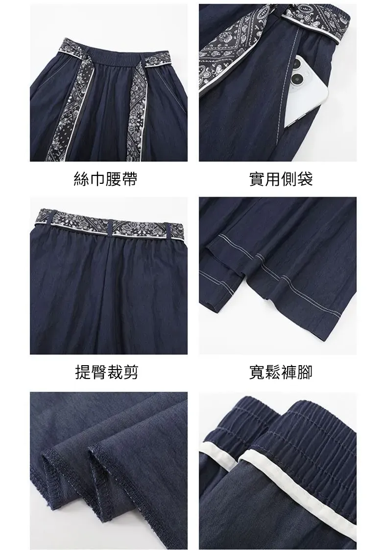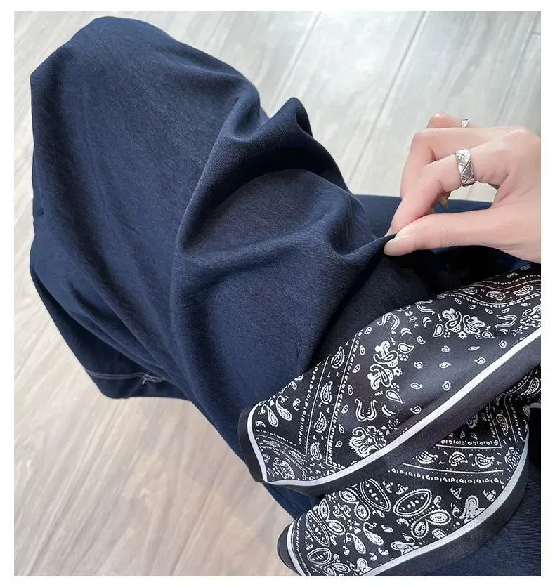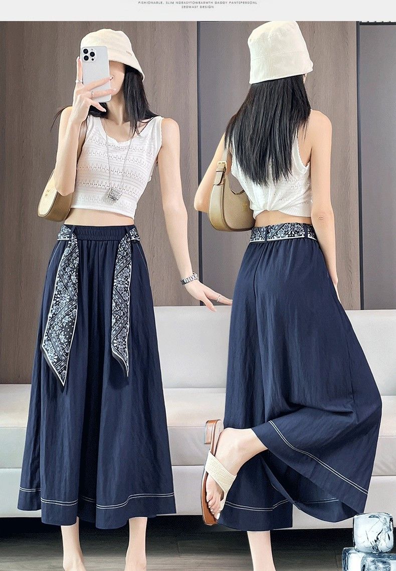 藏藍色冰絲薄款高腰顯瘦八分闊腿牛仔裙褲