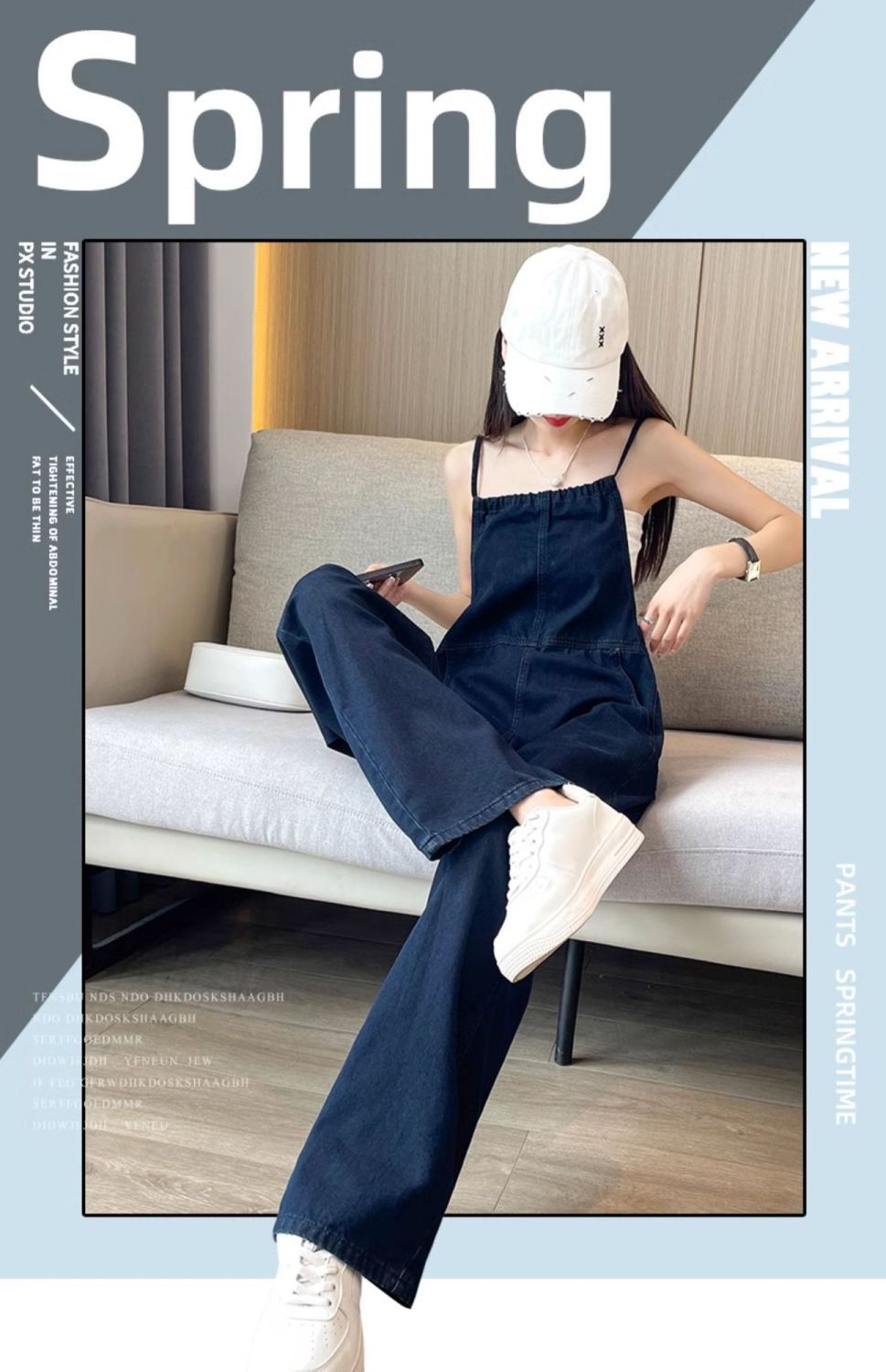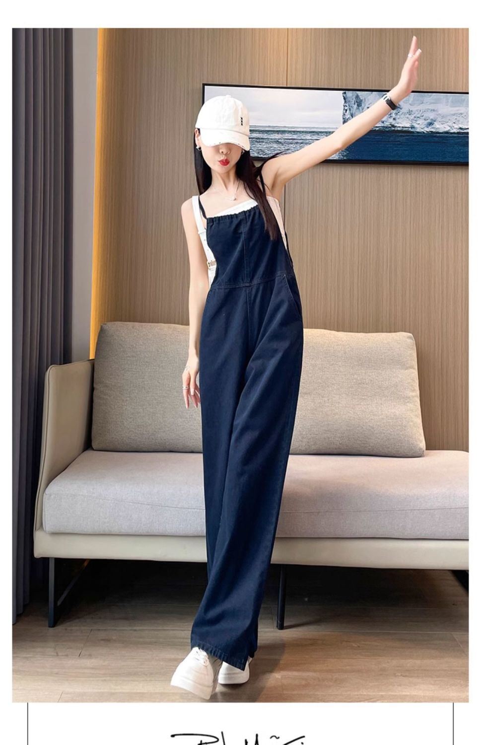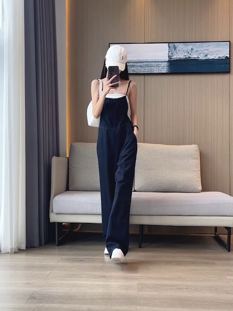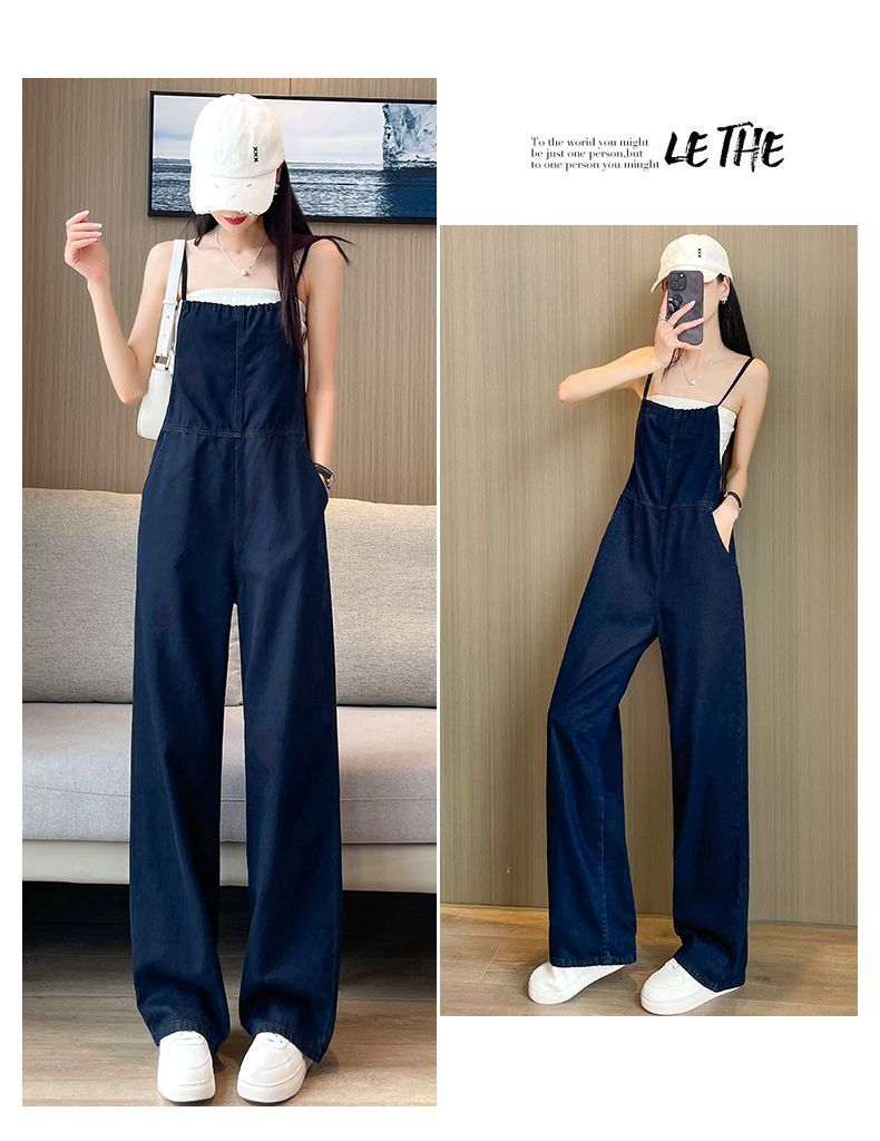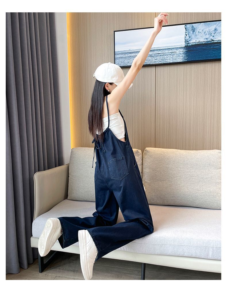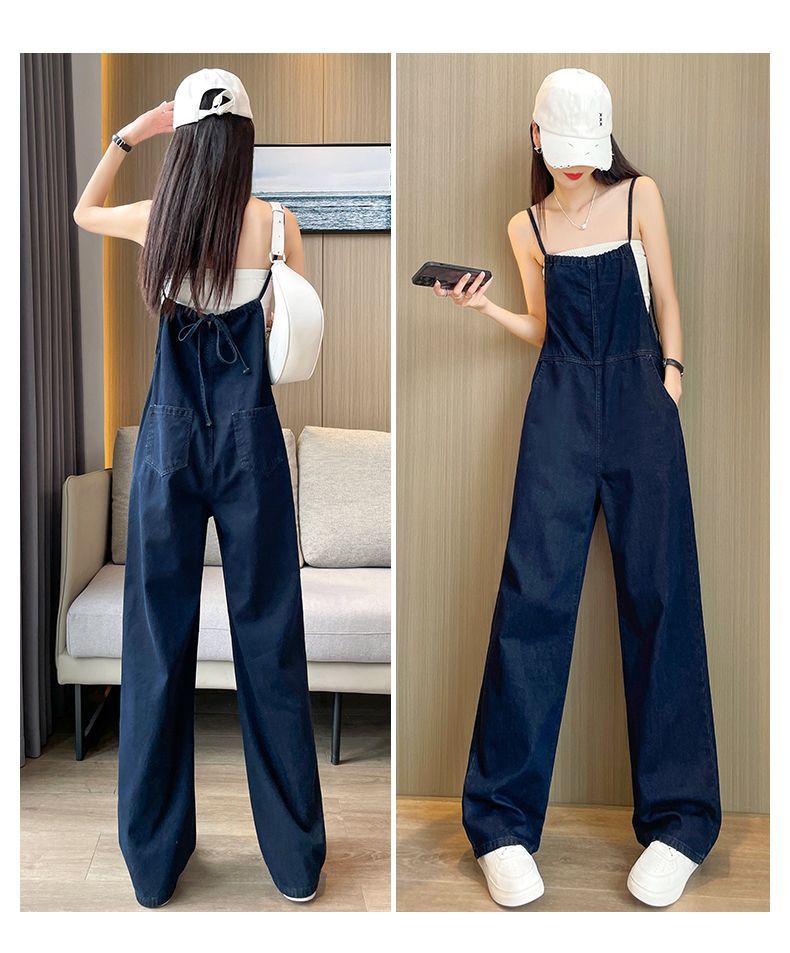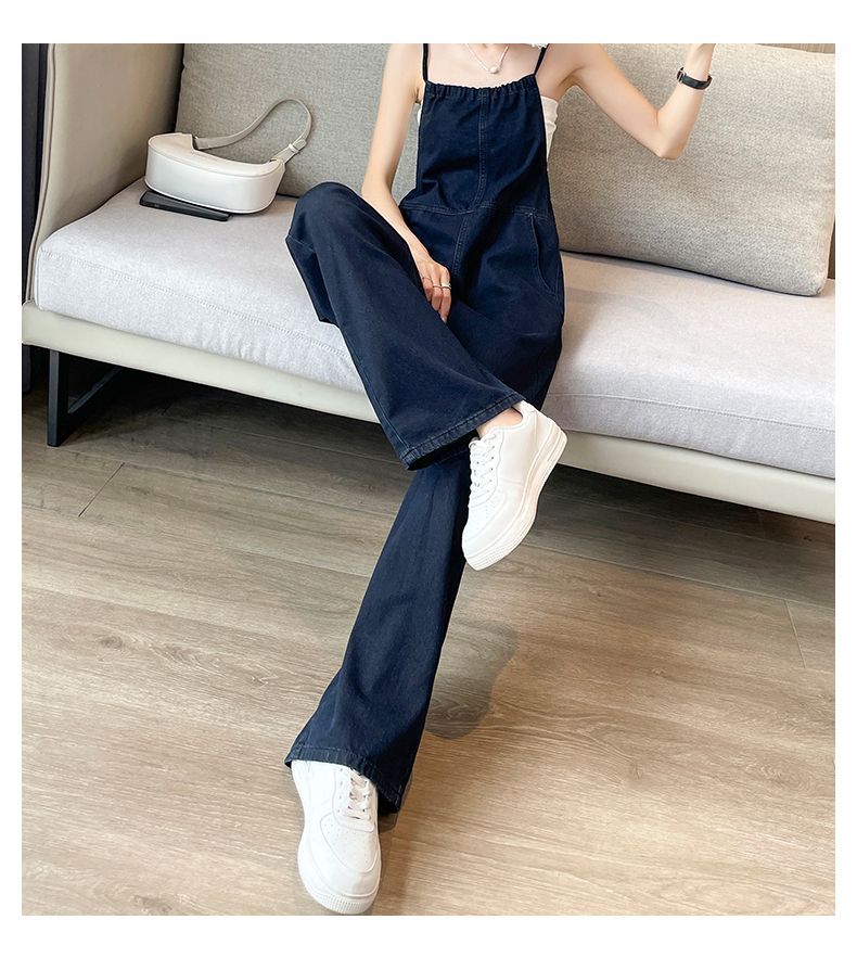 氣質吊帶顯瘦闊腿薄款高腰連體牛仔背帶褲