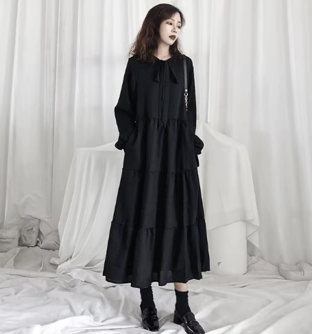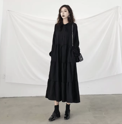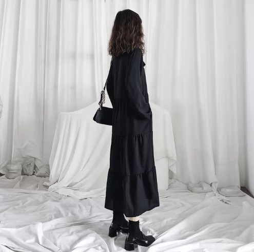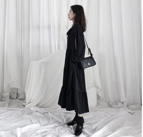 法式溫柔風寬鬆氣質復古小黑裙雪紡連身裙