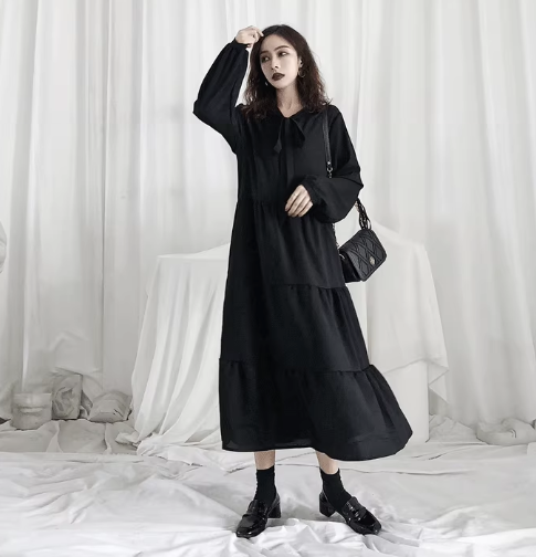 法式桔梗寬鬆氣質復古小黑裙溫柔風雪紡連衣裙