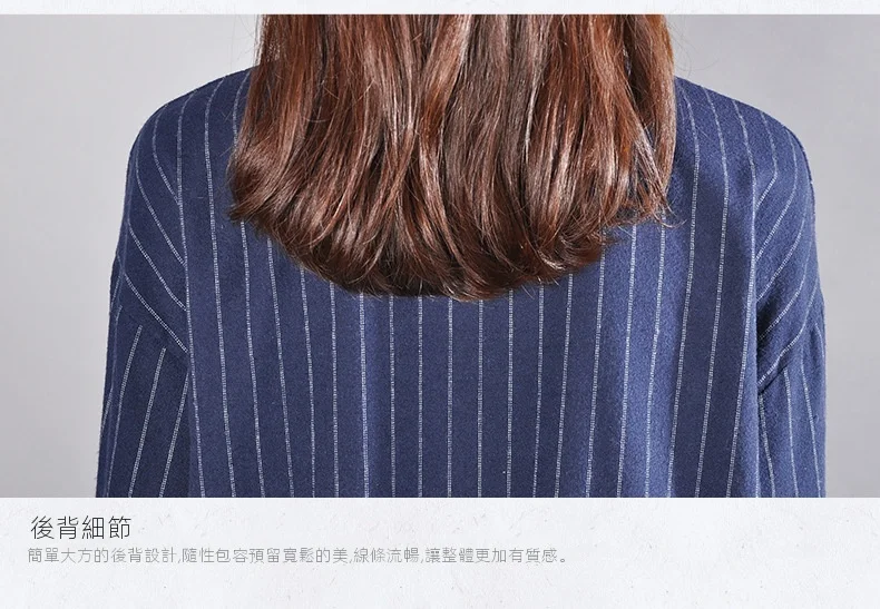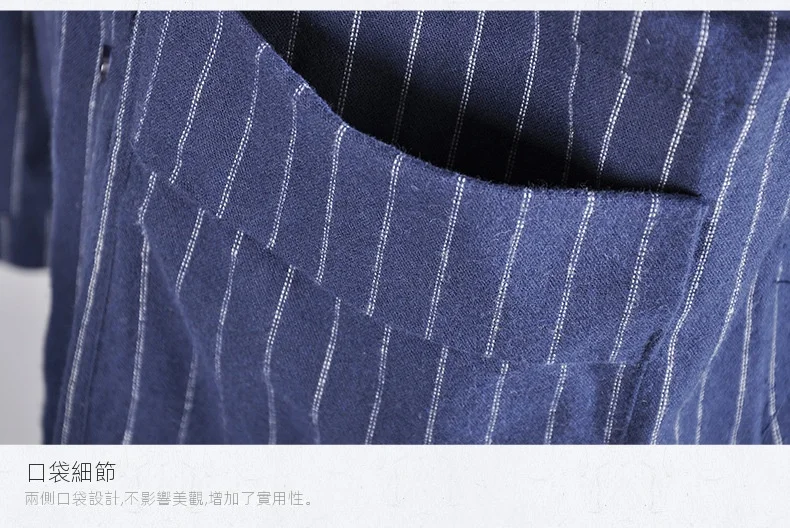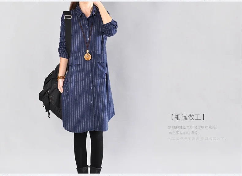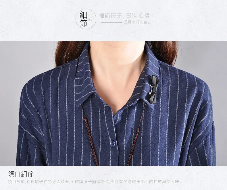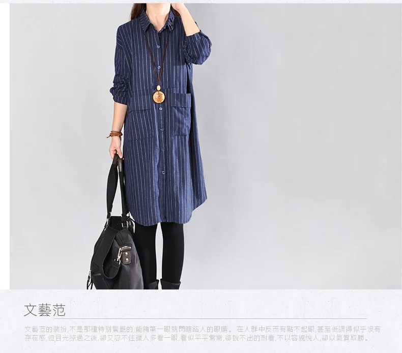 文藝寬鬆拼接條紋棉麻長袖襯衫連身裙