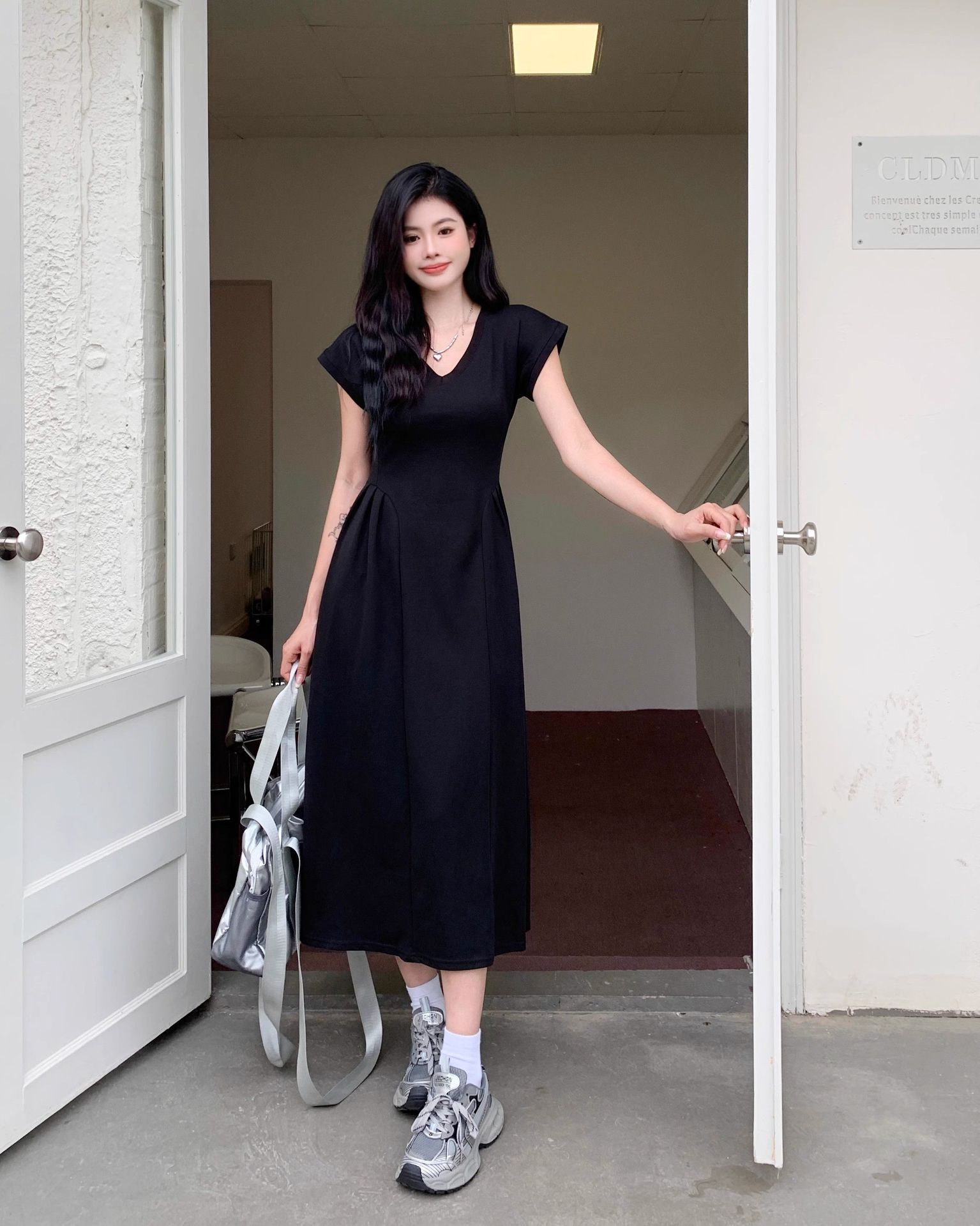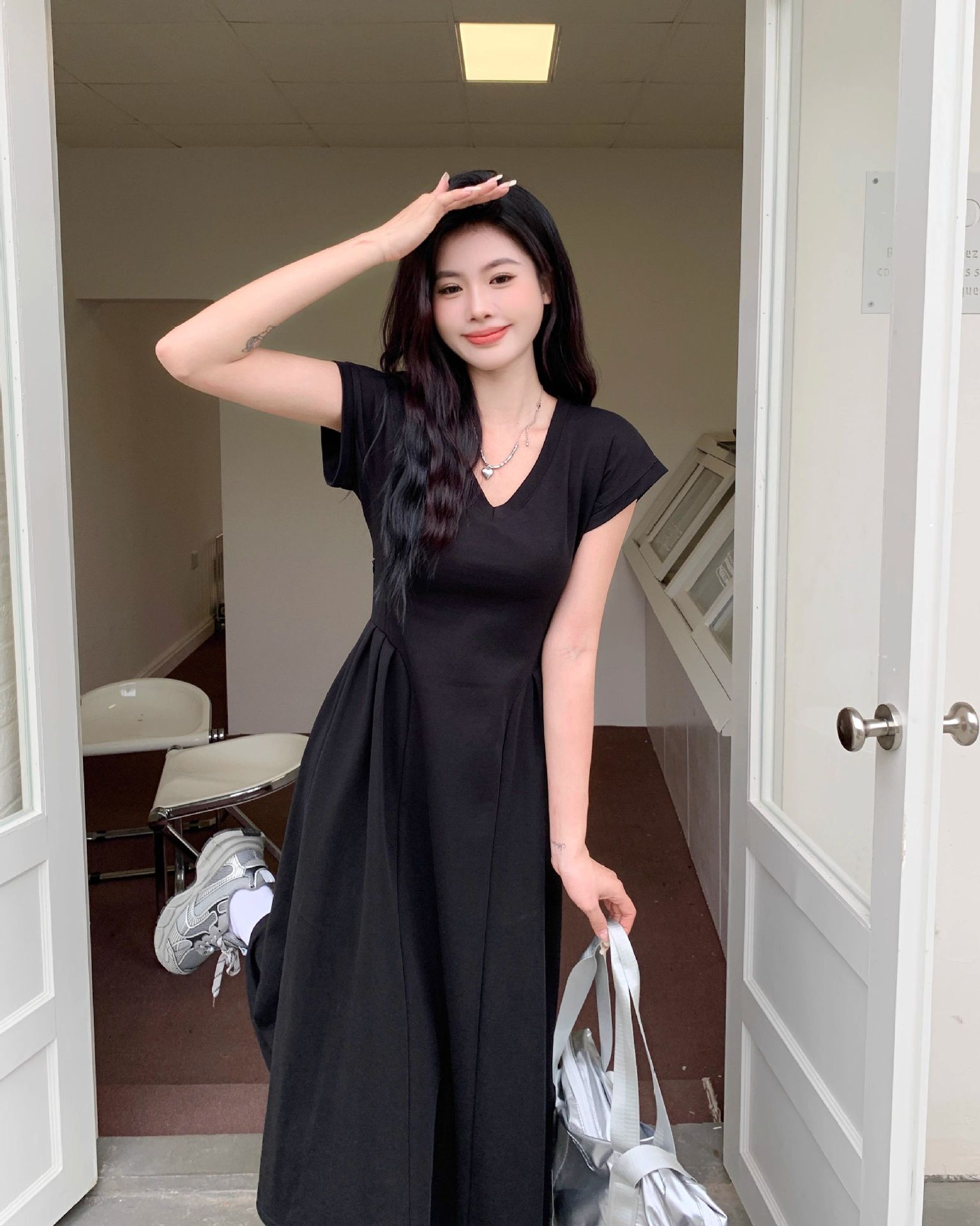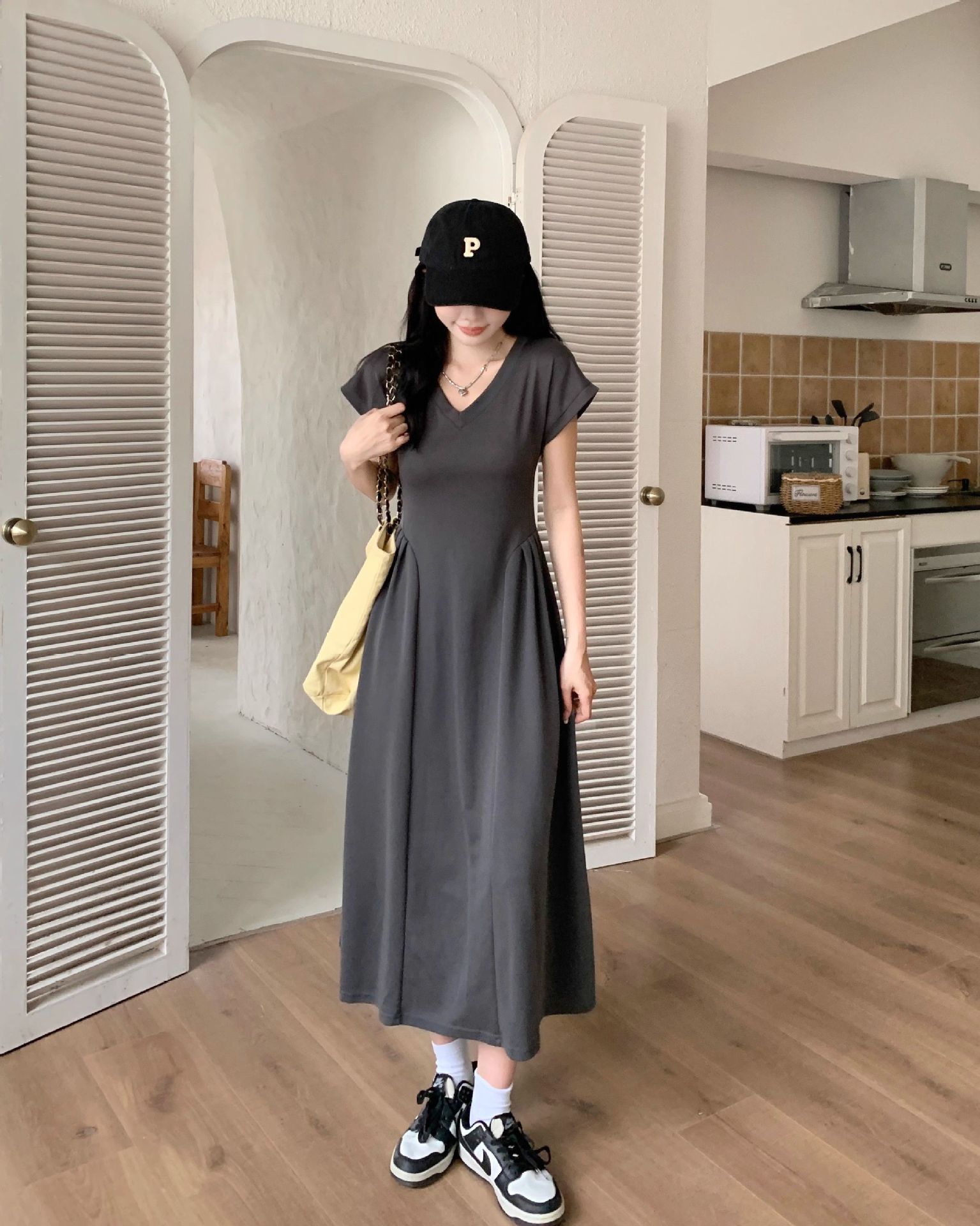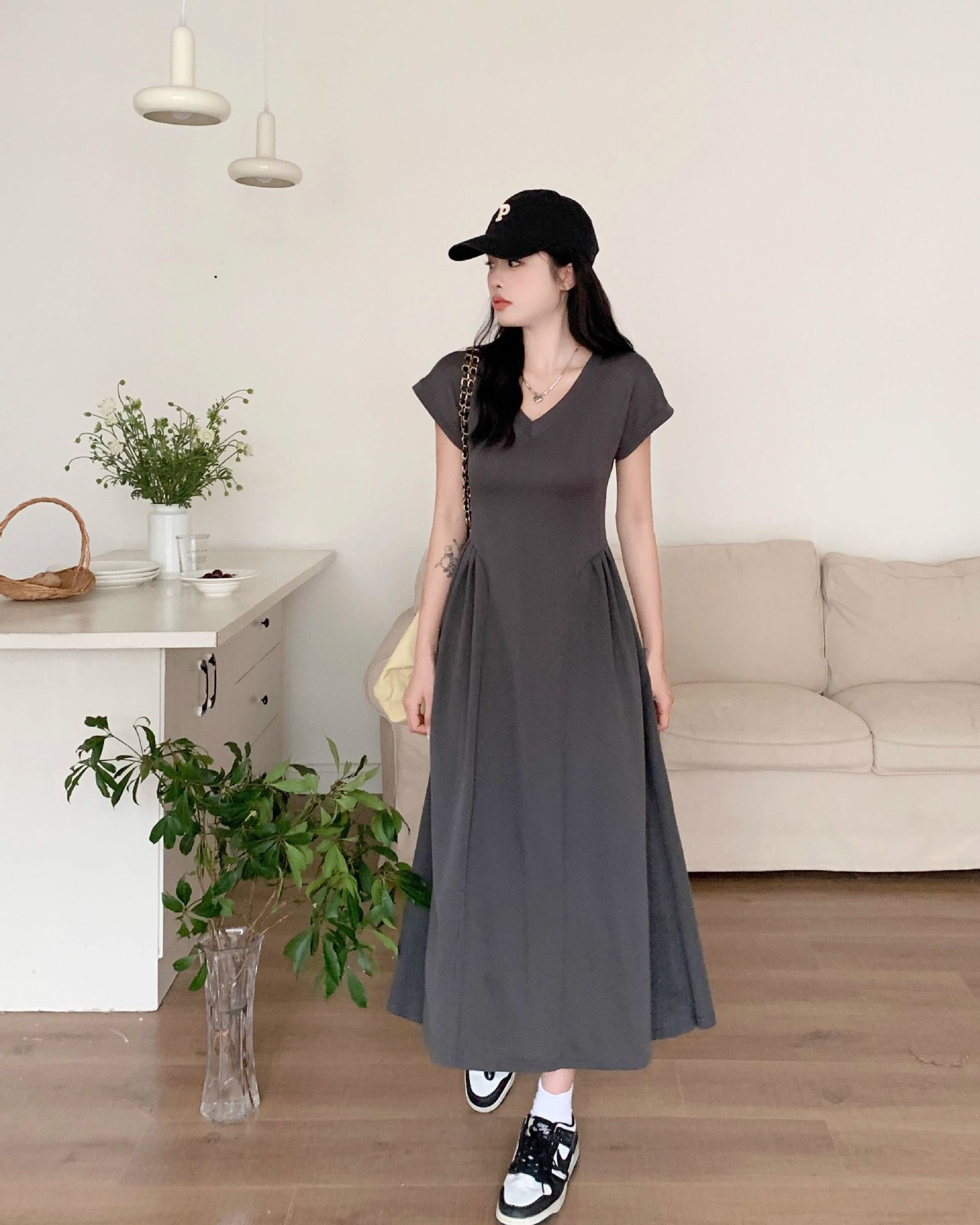 百搭純色簡約V領收腰氣質長款連身裙-Cicimode