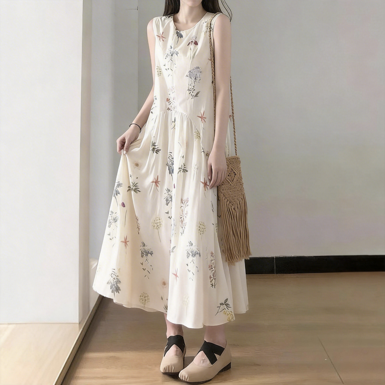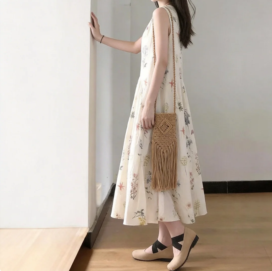 法式茶歇圓領碎花氣質寬鬆顯瘦無袖洋裝