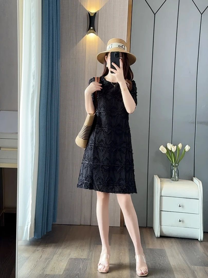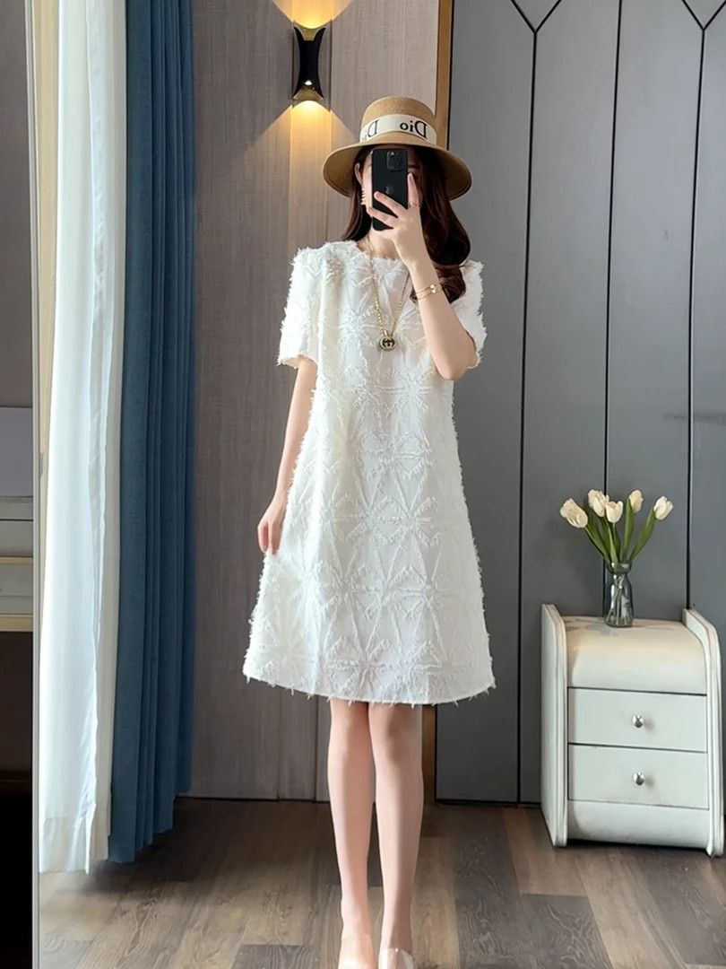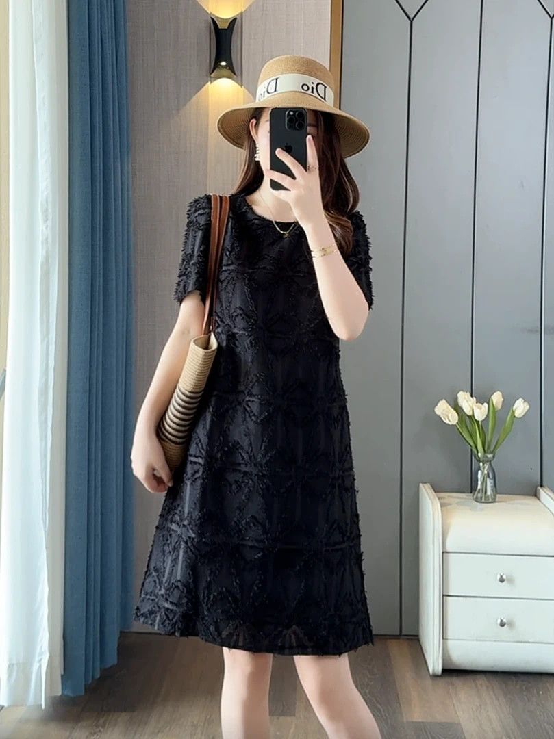 高級感刺繡提花加長版V領寬鬆大碼洋裝