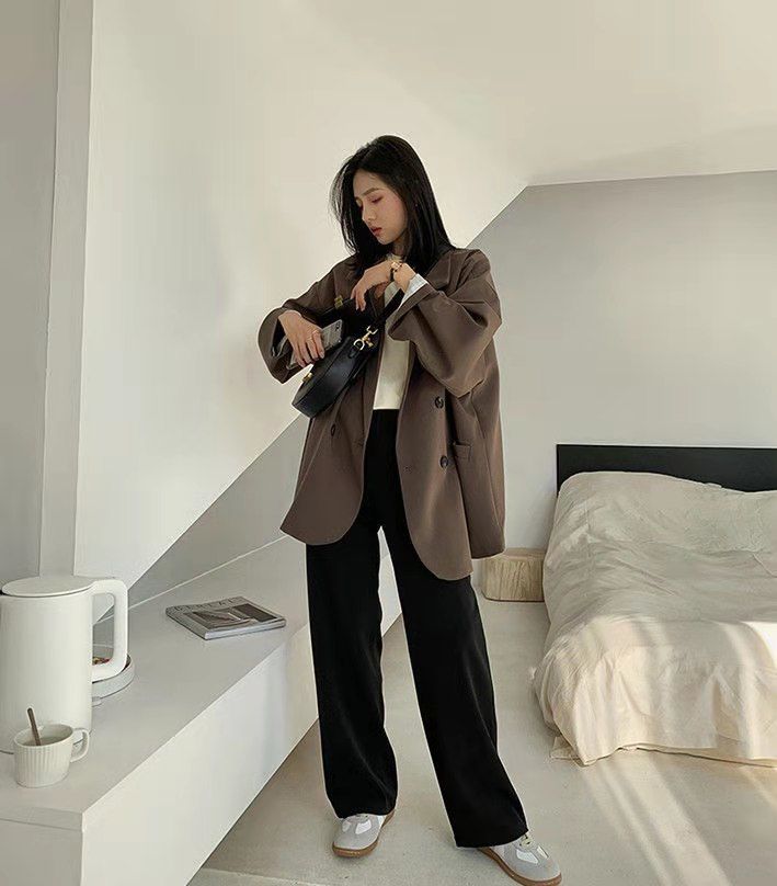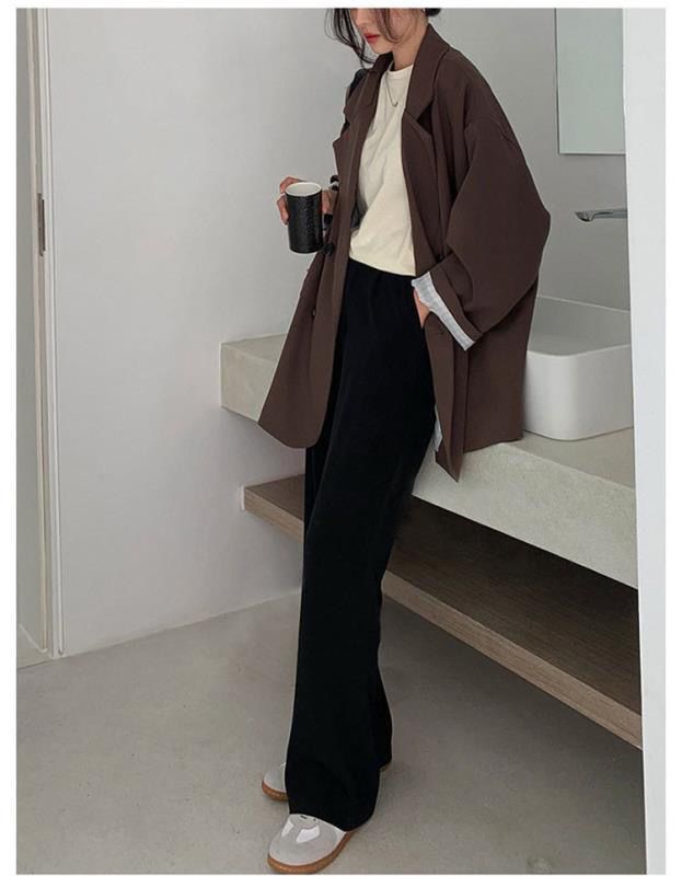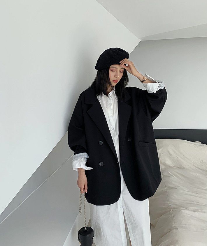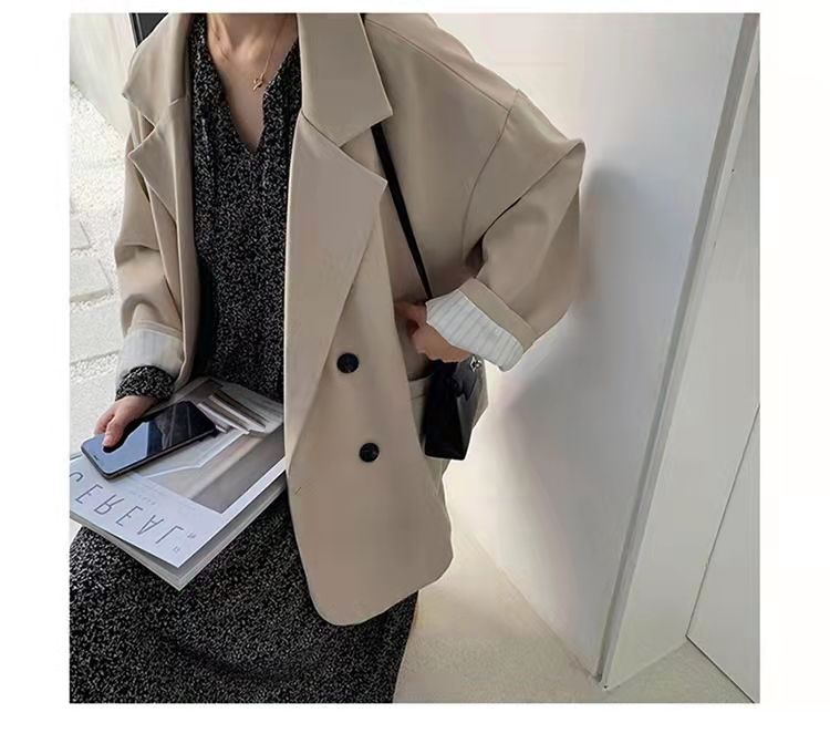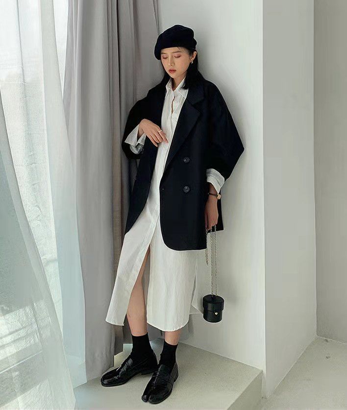 服裝版型:寬鬆衣門襟:雙排扣衣長/袖長:中長款/長袖風格:小眾特色/極簡服裝款式細節:拼接,紐扣,純色