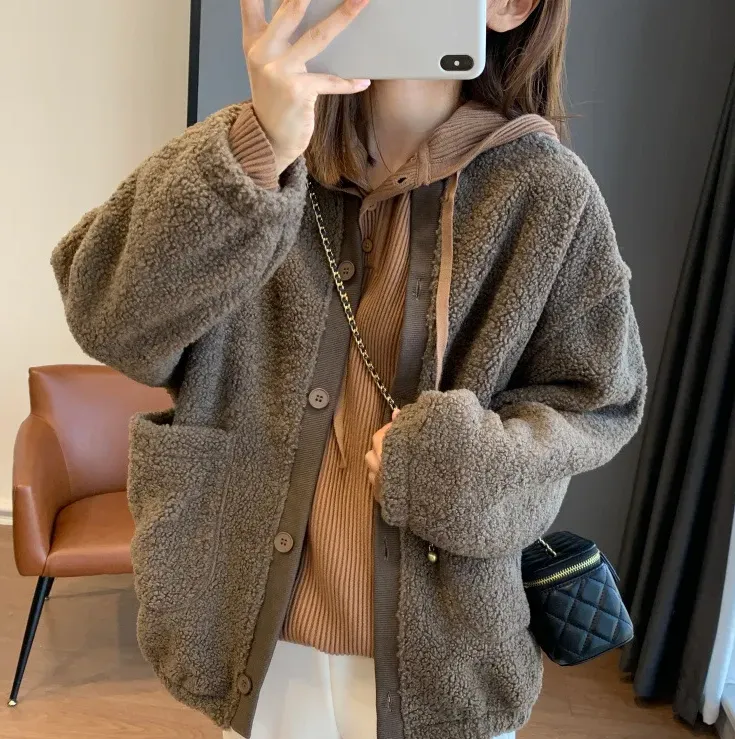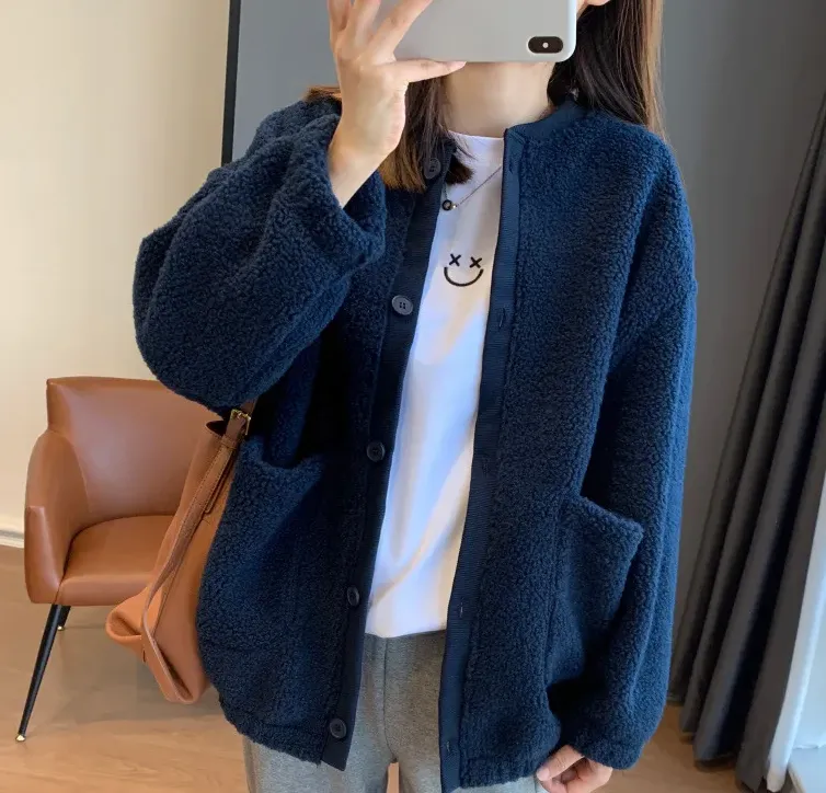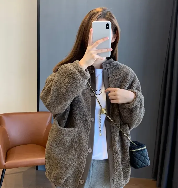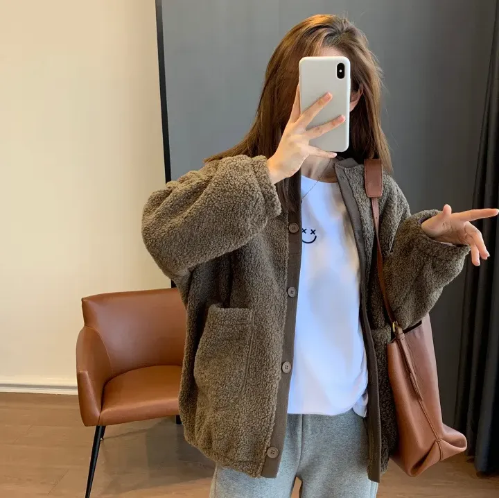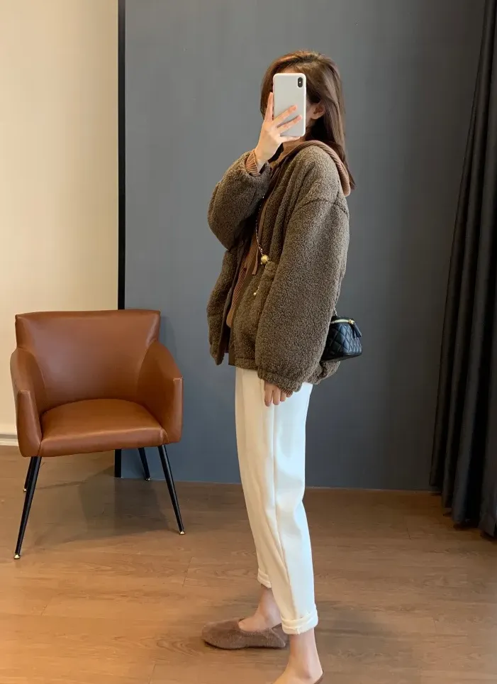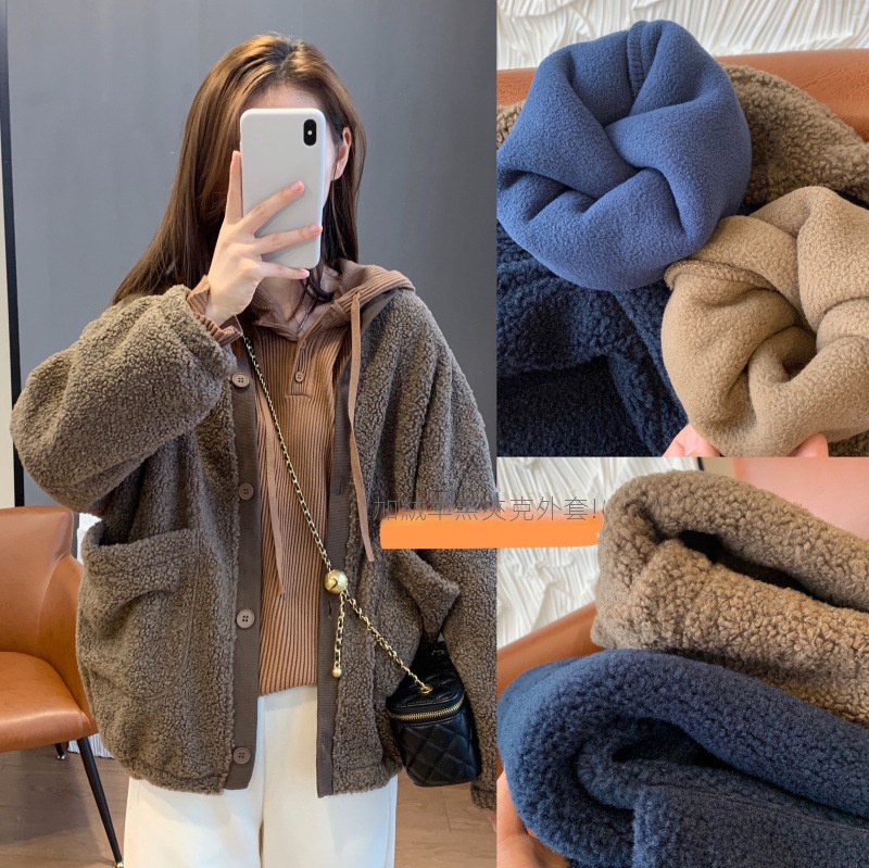時尚加絨棒球服寬鬆仿羊羔絨外套-Cicimode