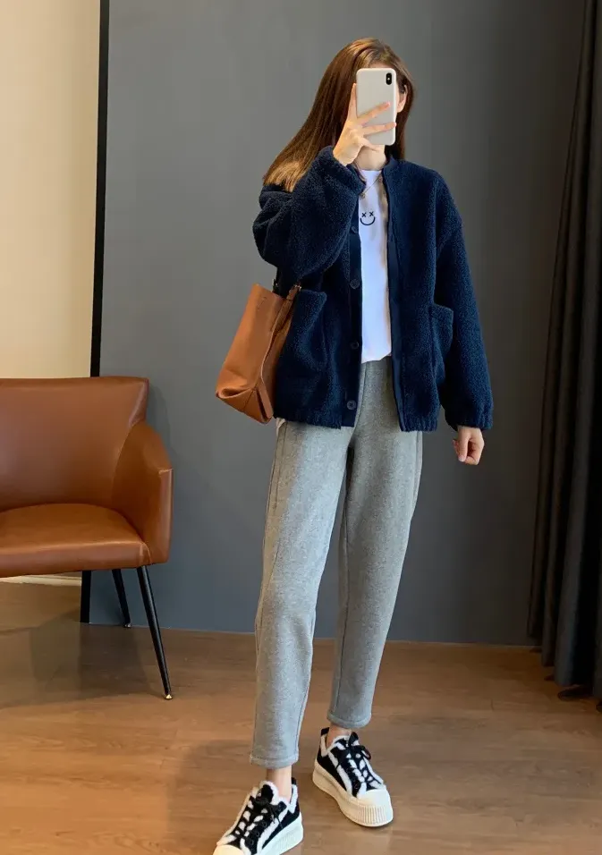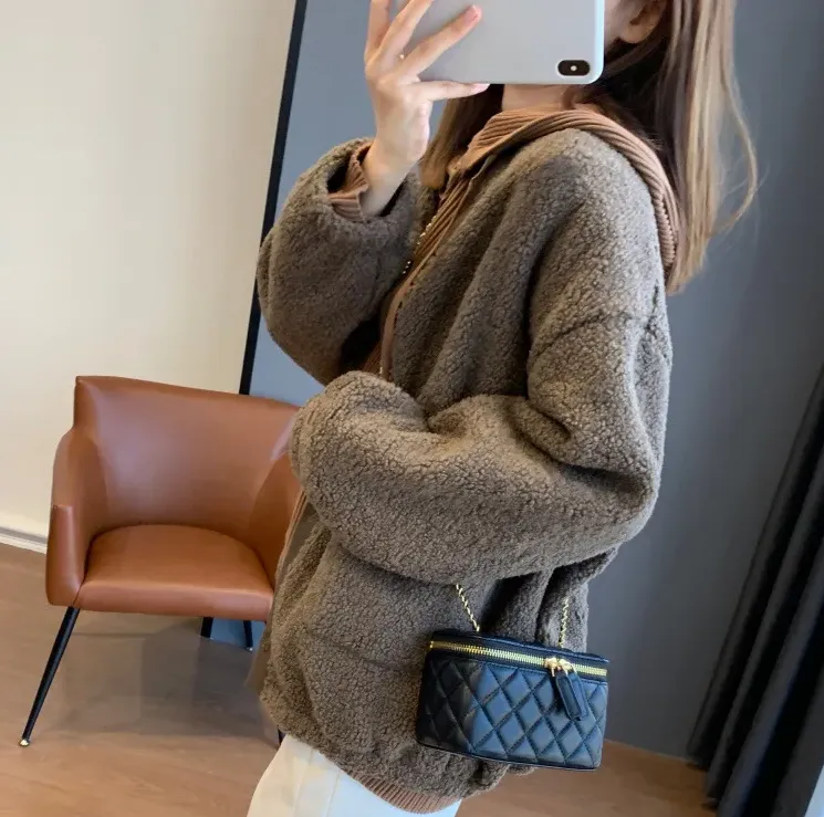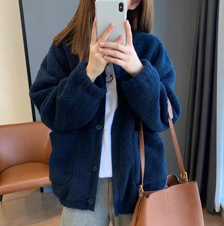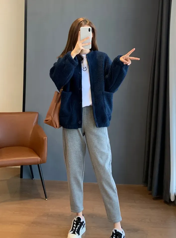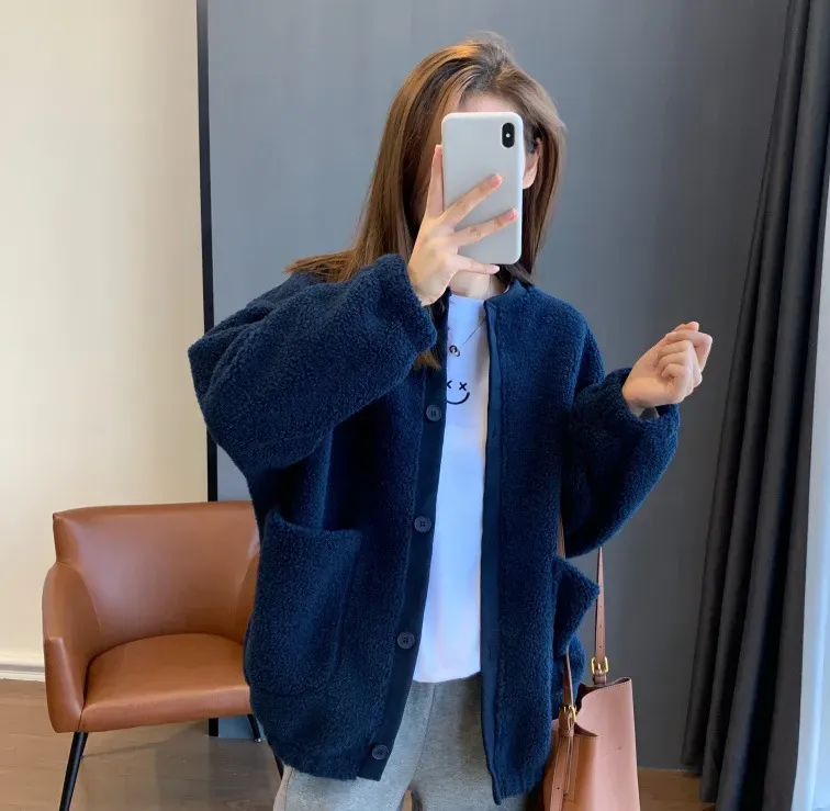 時尚加絨棒球服寬鬆仿羊羔絨外套-Cicimode