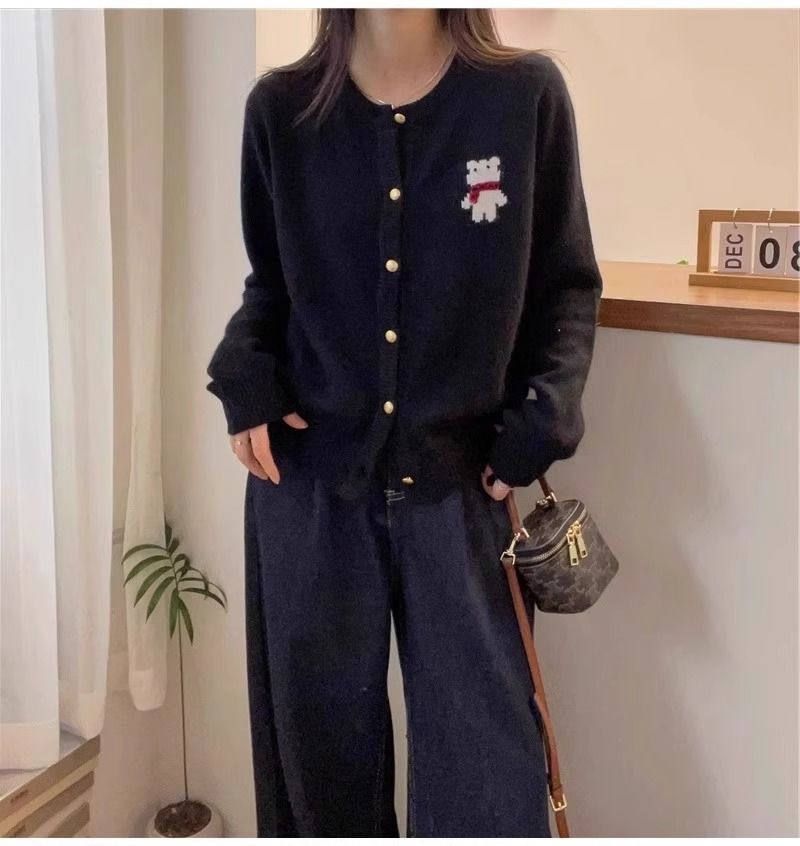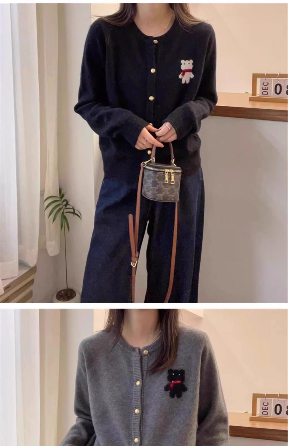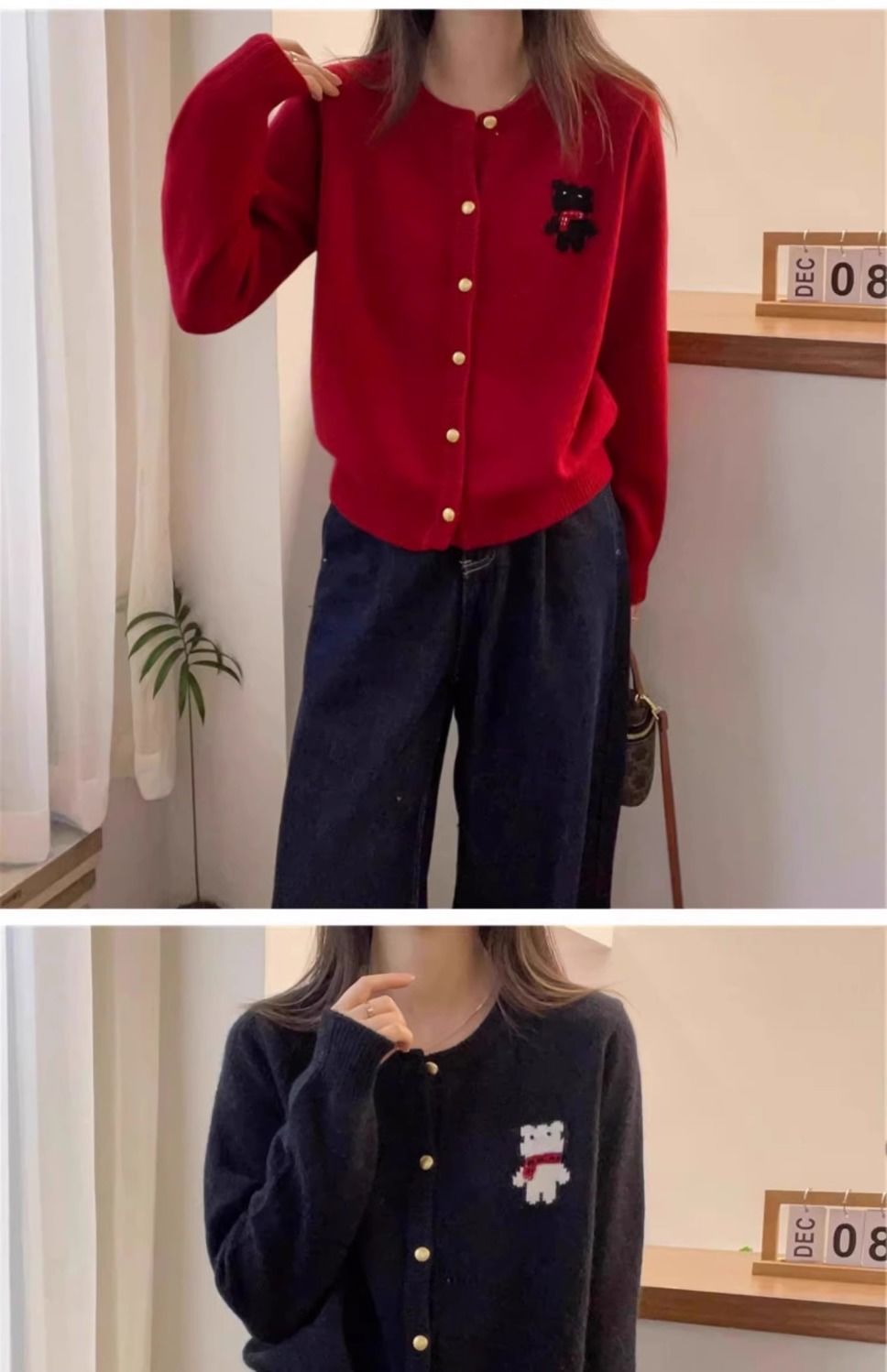 韓版百搭圓領紅色毛衣外套小熊針織開衫