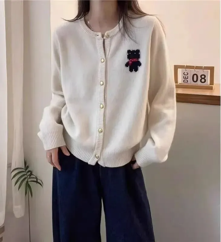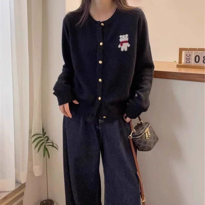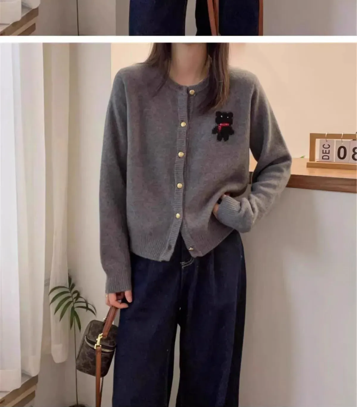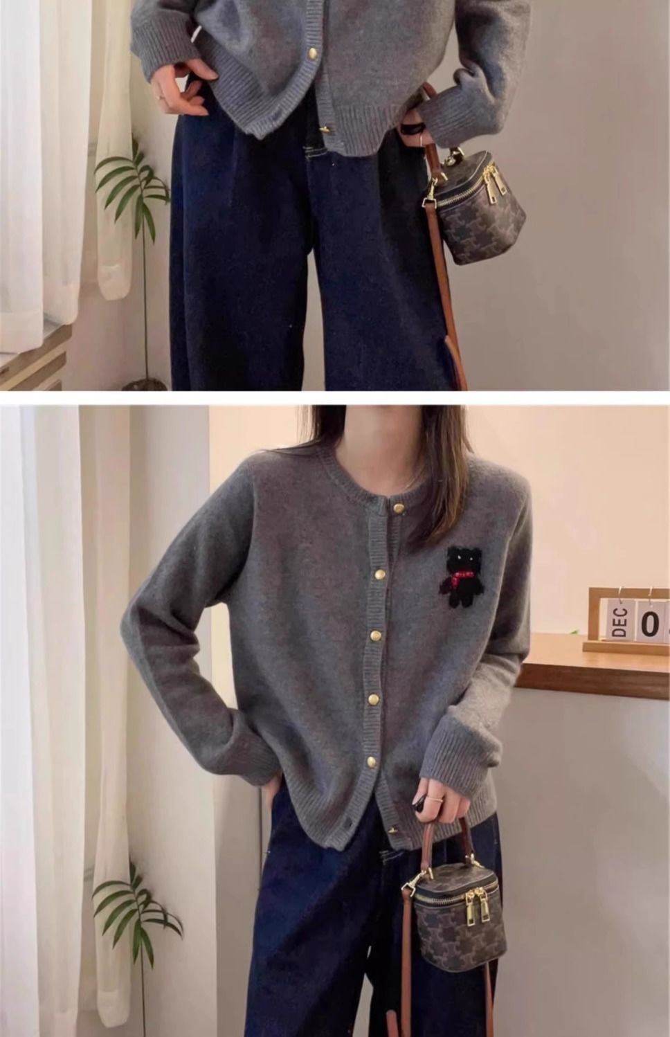 韓版百搭圓領紅色毛衣外套小熊針織開衫