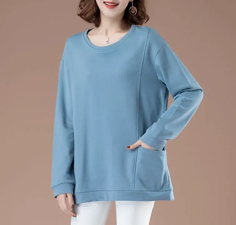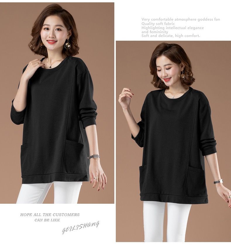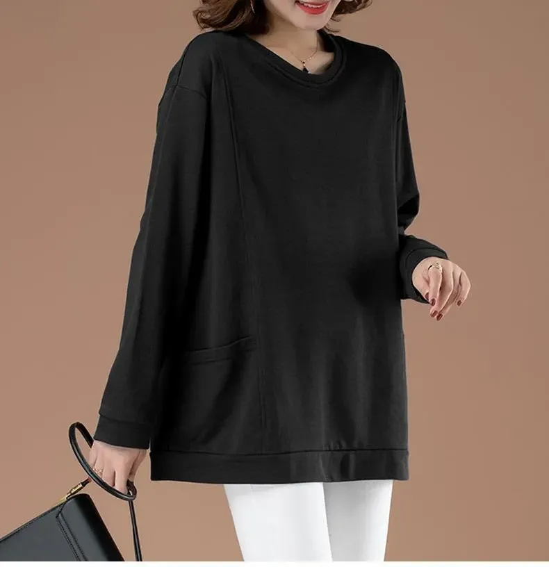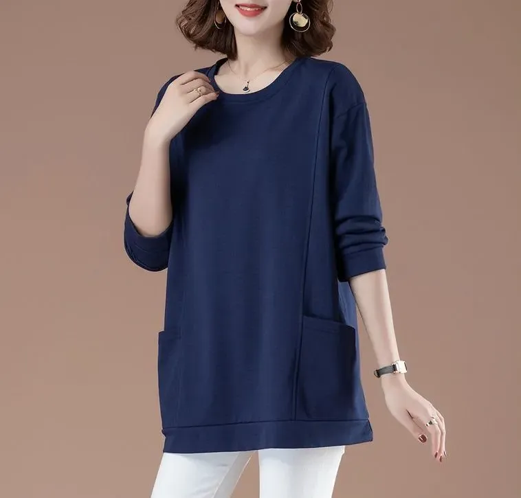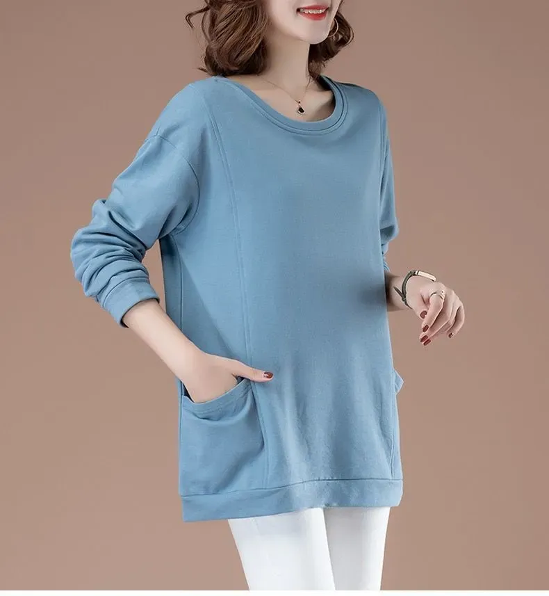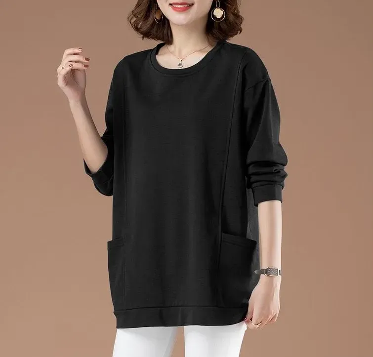 百搭休閒中長款圓領印花大口袋長袖