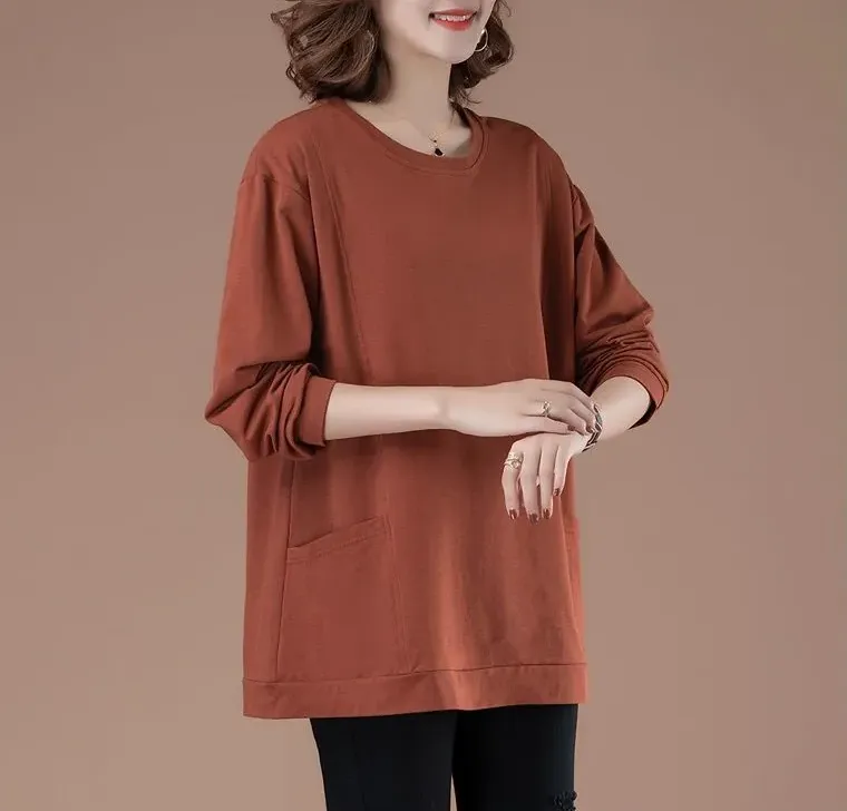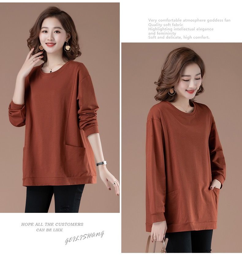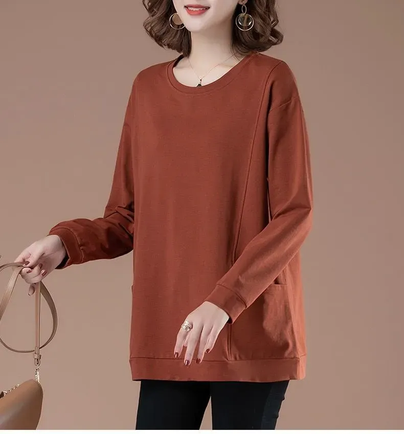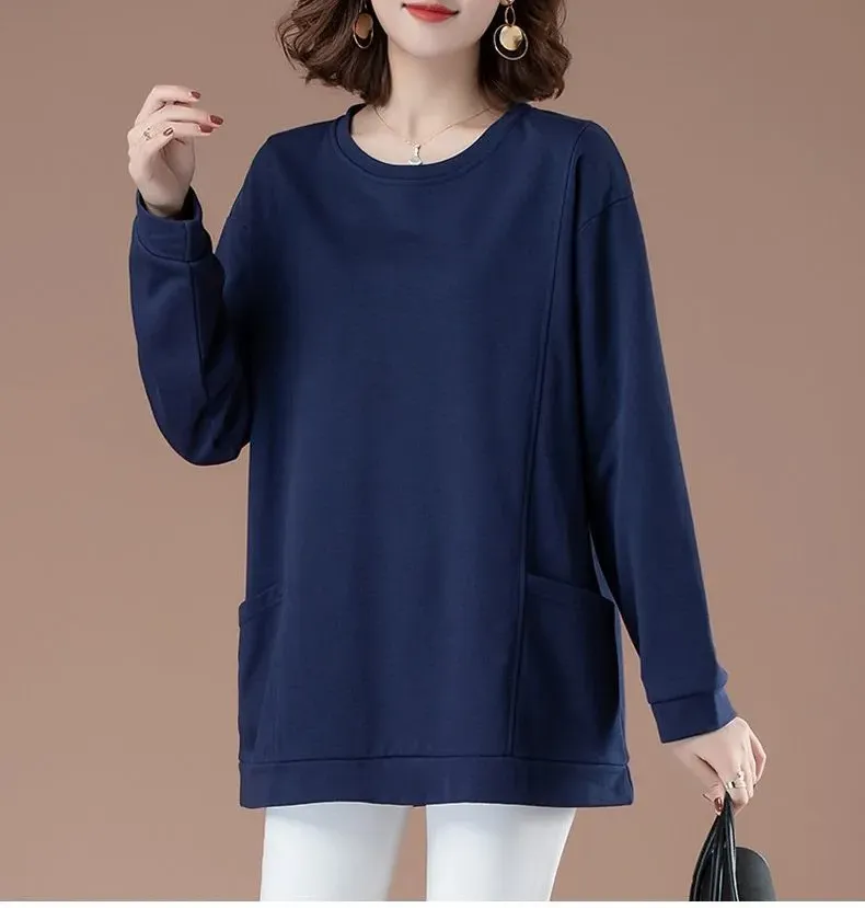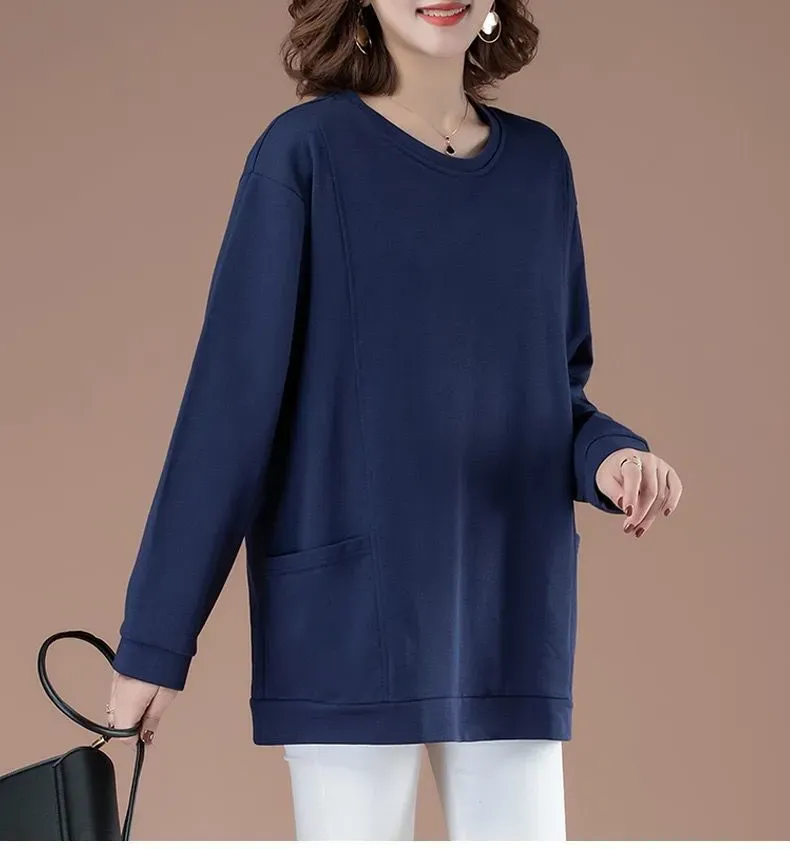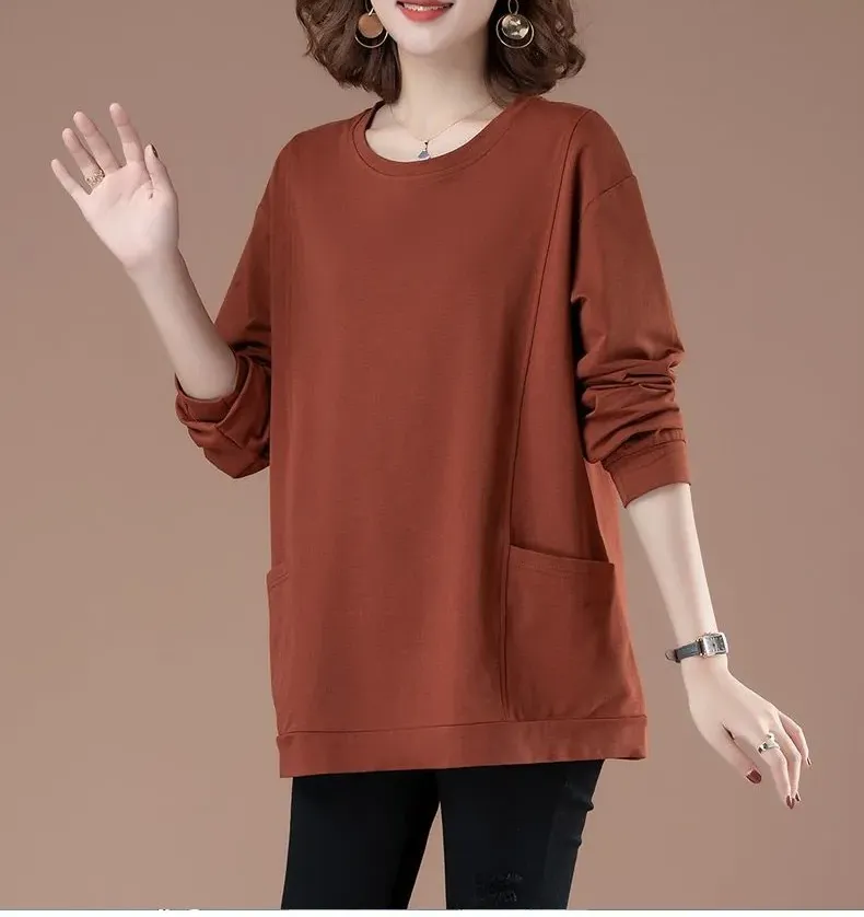百搭休閒中長款圓領印花大口袋長袖