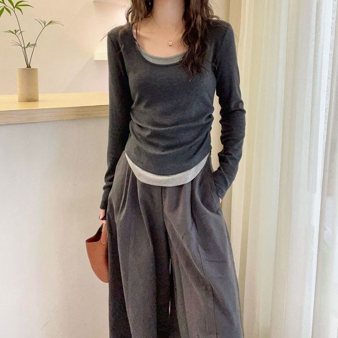 假兩件正肩修身顯瘦拼接撞色長袖T恤-Cicimode