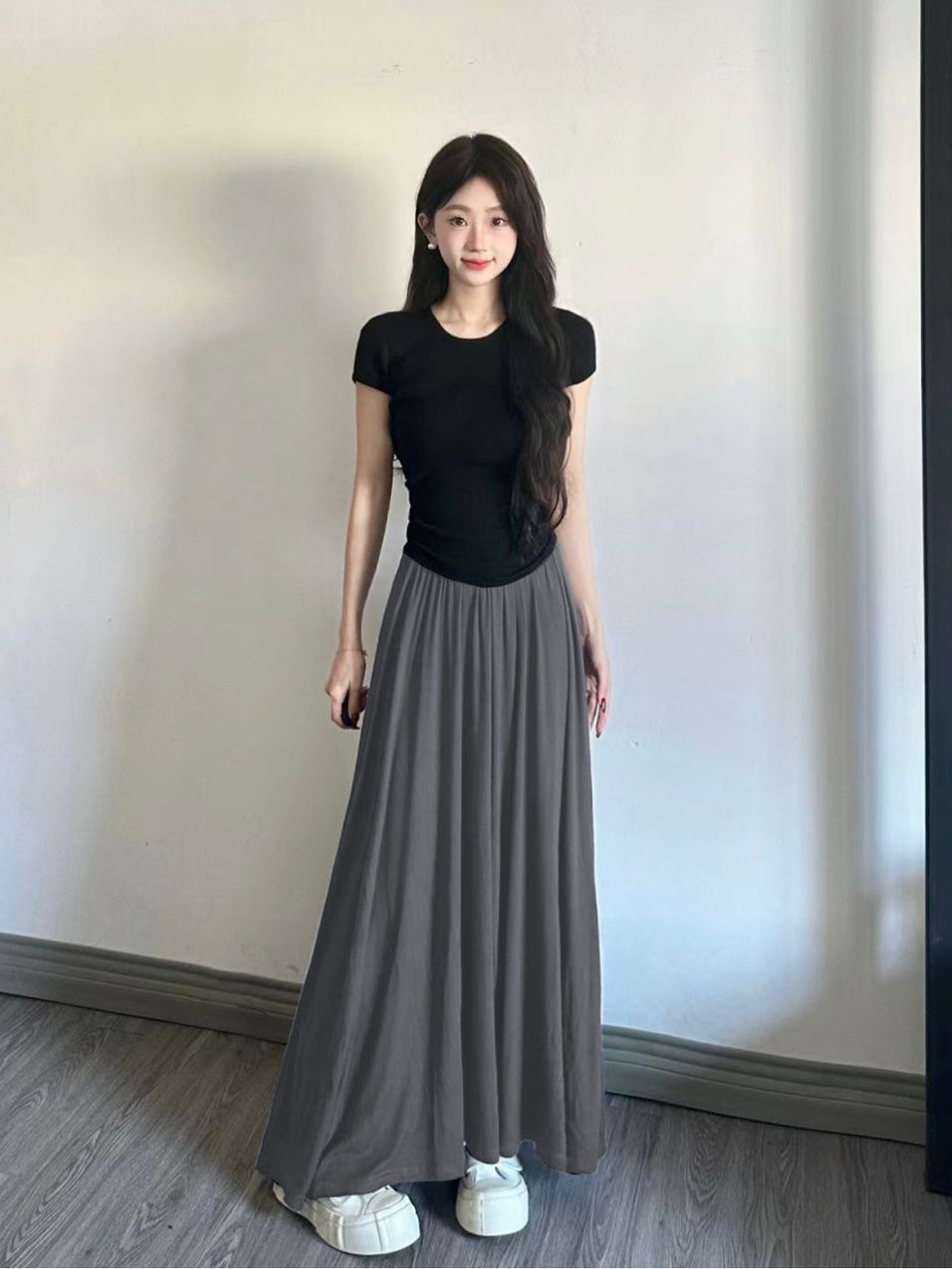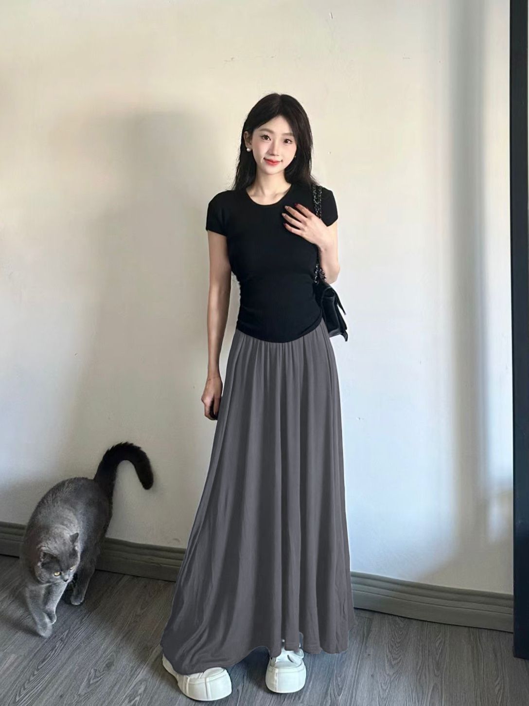 【單件/套裝】法式慵懶風修身短袖T恤+a字高腰半身長裙兩件套裝-Cicimode
