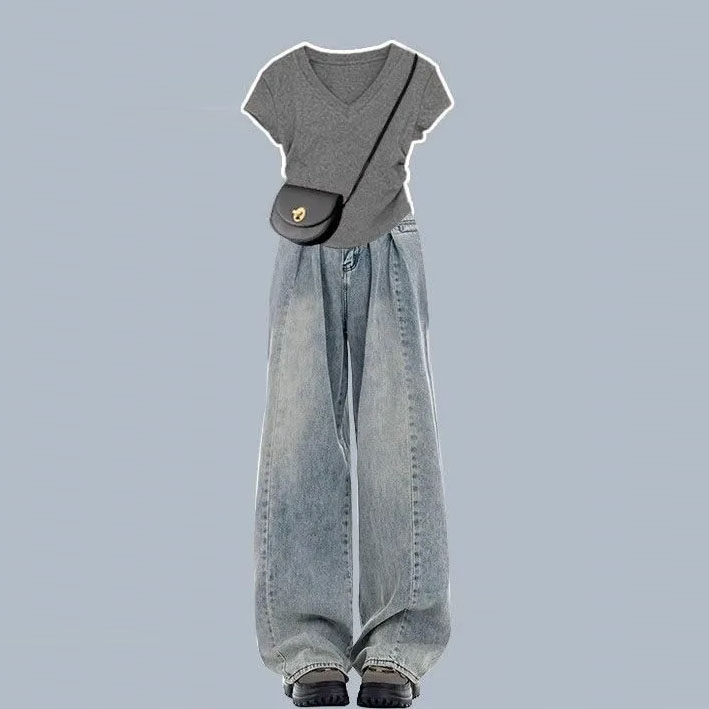 【套装】韓系甜酷V領短袖T恤 +美式復古高腰牛仔褲兩件套裝-Cicimode