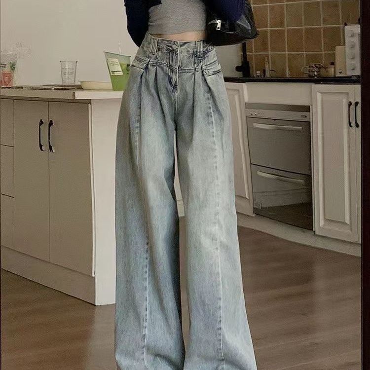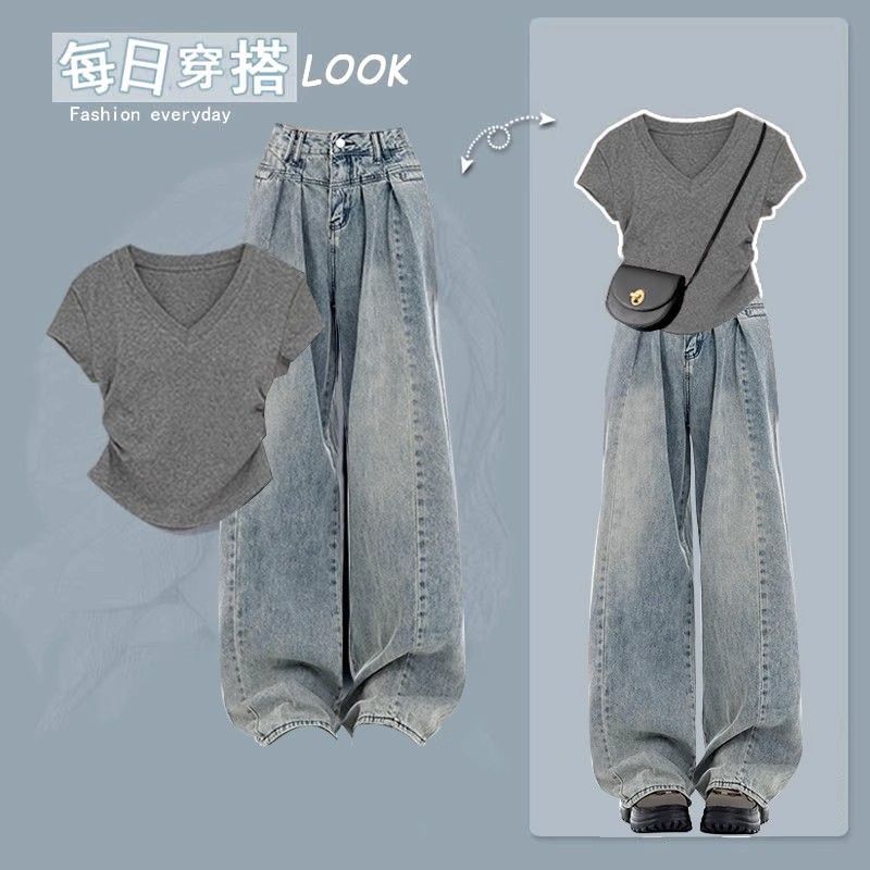 【套装】韓系甜酷V領短袖T恤 +美式復古高腰牛仔褲兩件套裝
