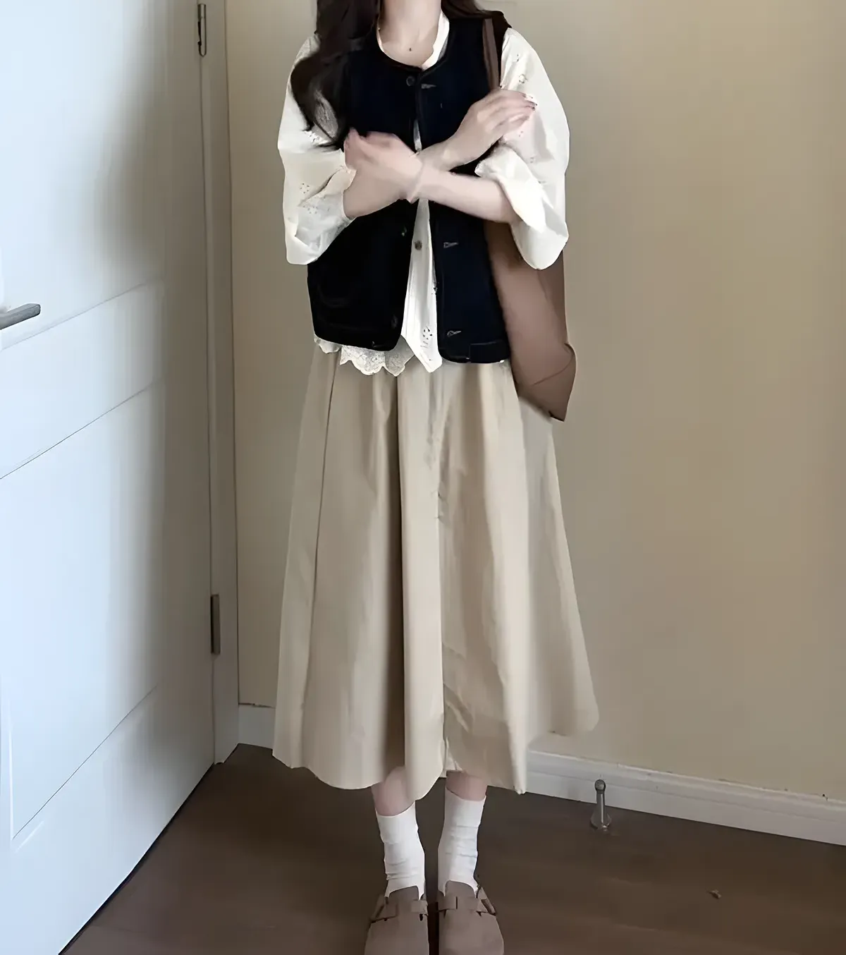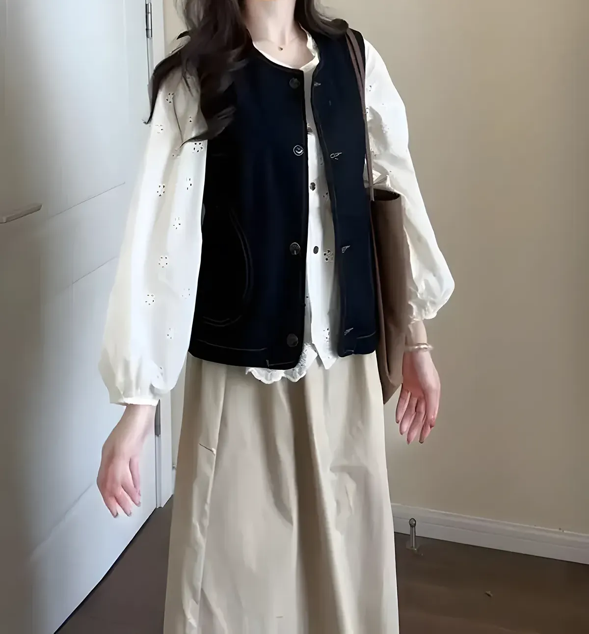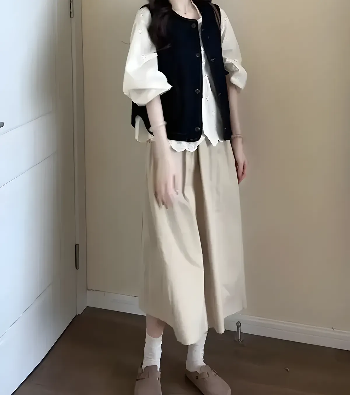 【單件/套裝】法式學院風牛仔開衫馬甲++長袖襯衫+茶歇半身裙三件套-Cicimode