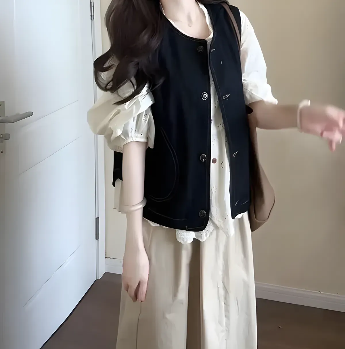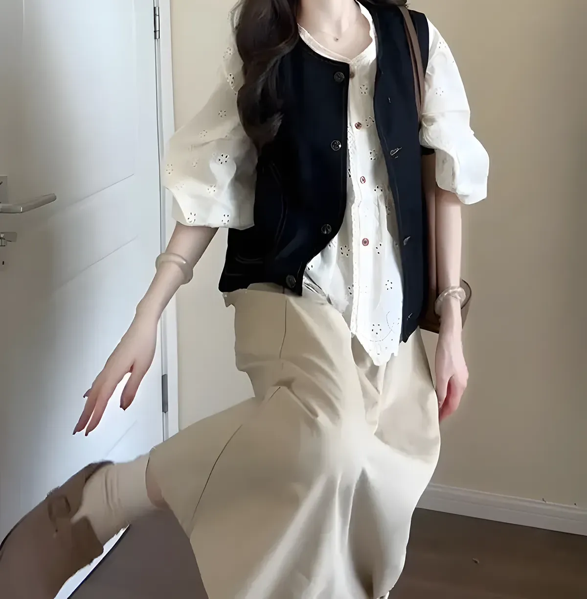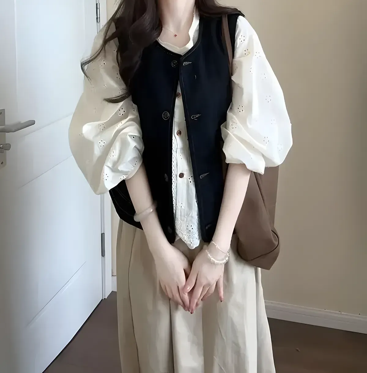 【單件/套裝】法式學院風牛仔開衫馬甲++長袖襯衫+茶歇半身裙三件套