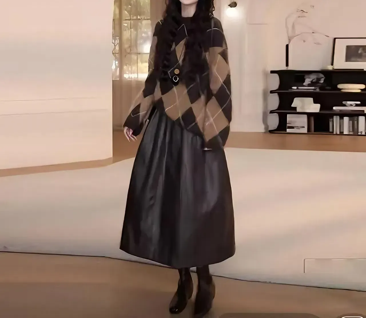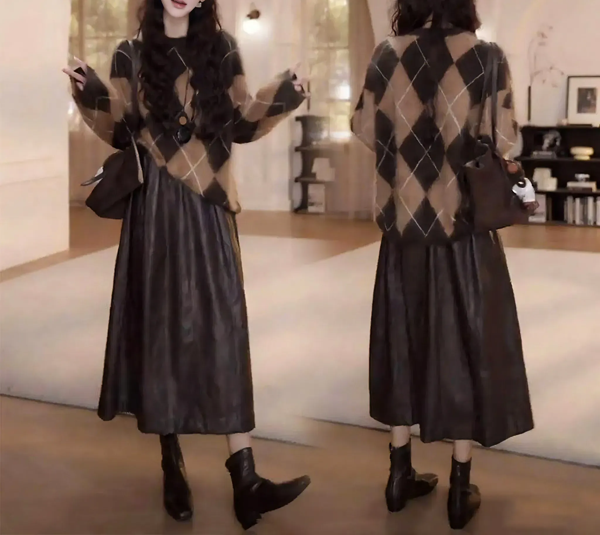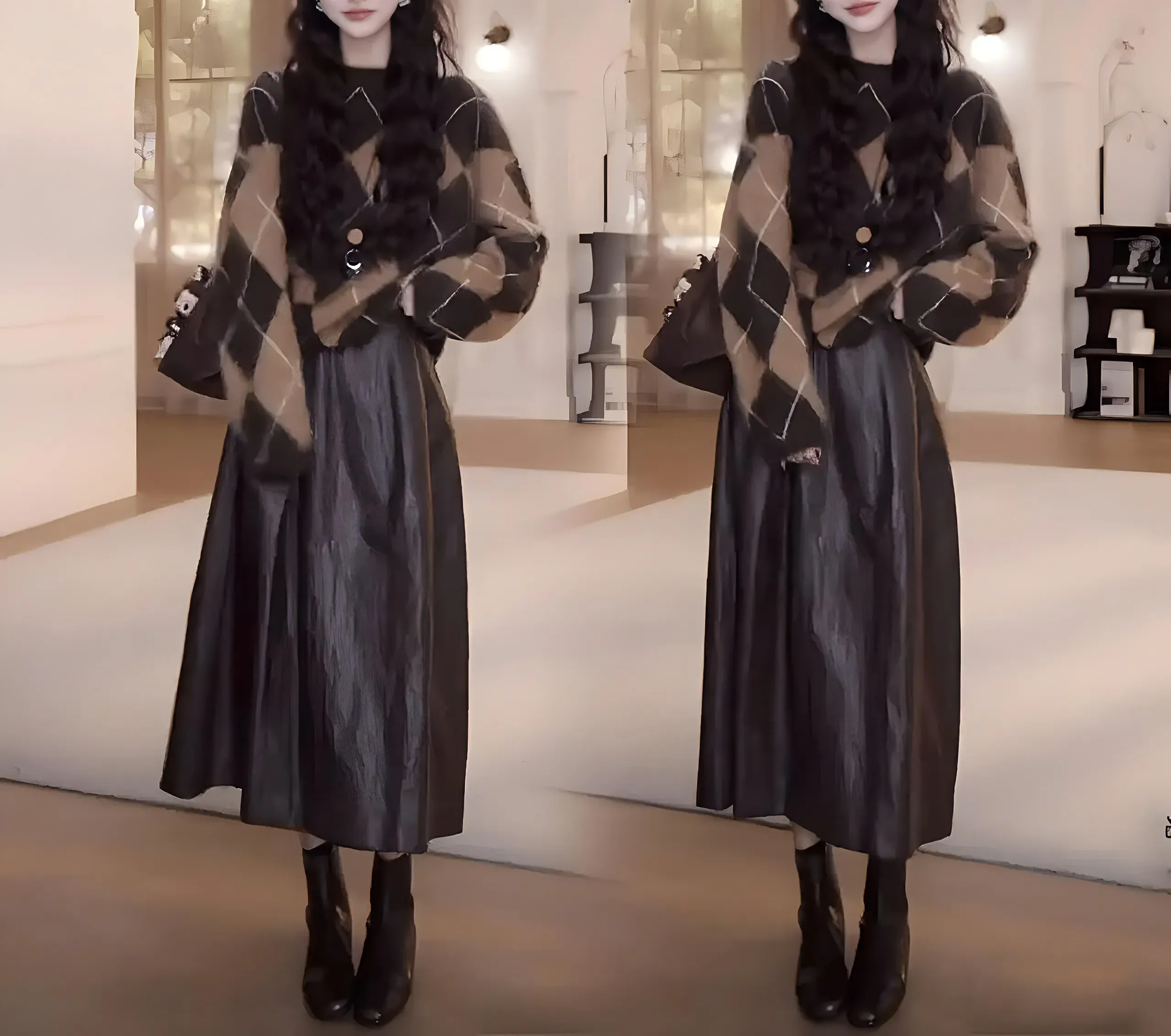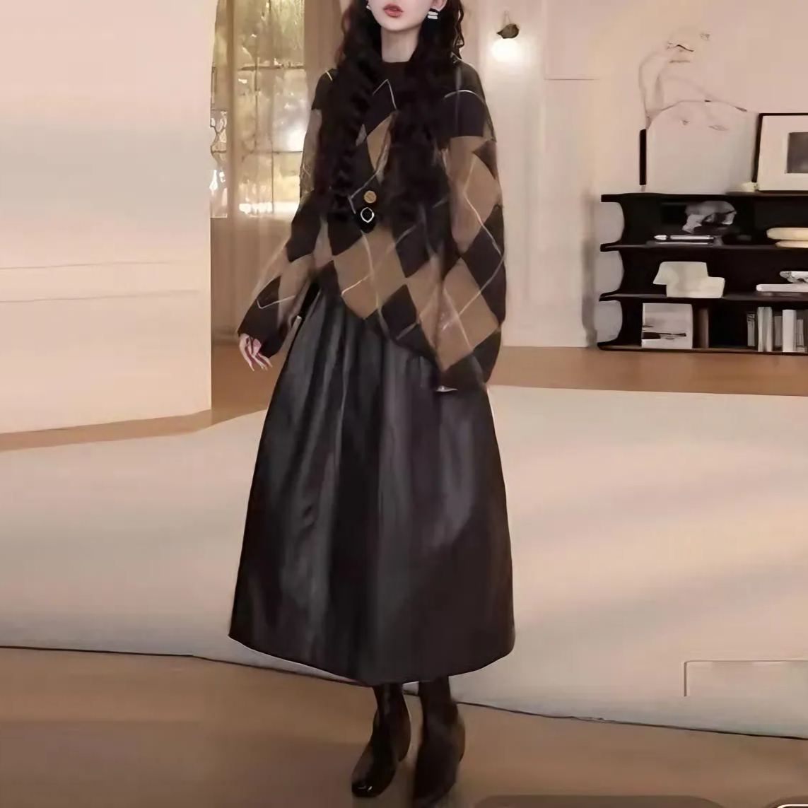 【兩件套】咖色毛衣+咖色半身皮裙
