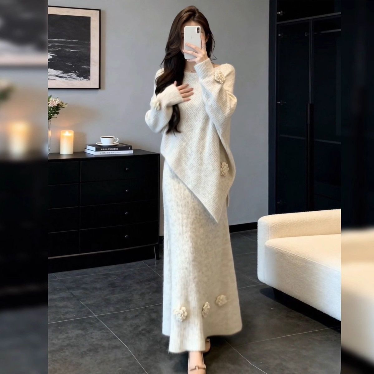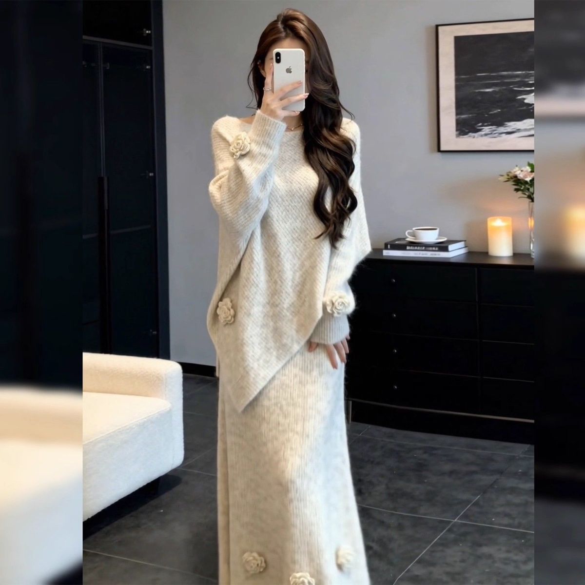 【整套】韓系溫柔風時尚氣質針織毛衣+高腰半身裙兩件套裝