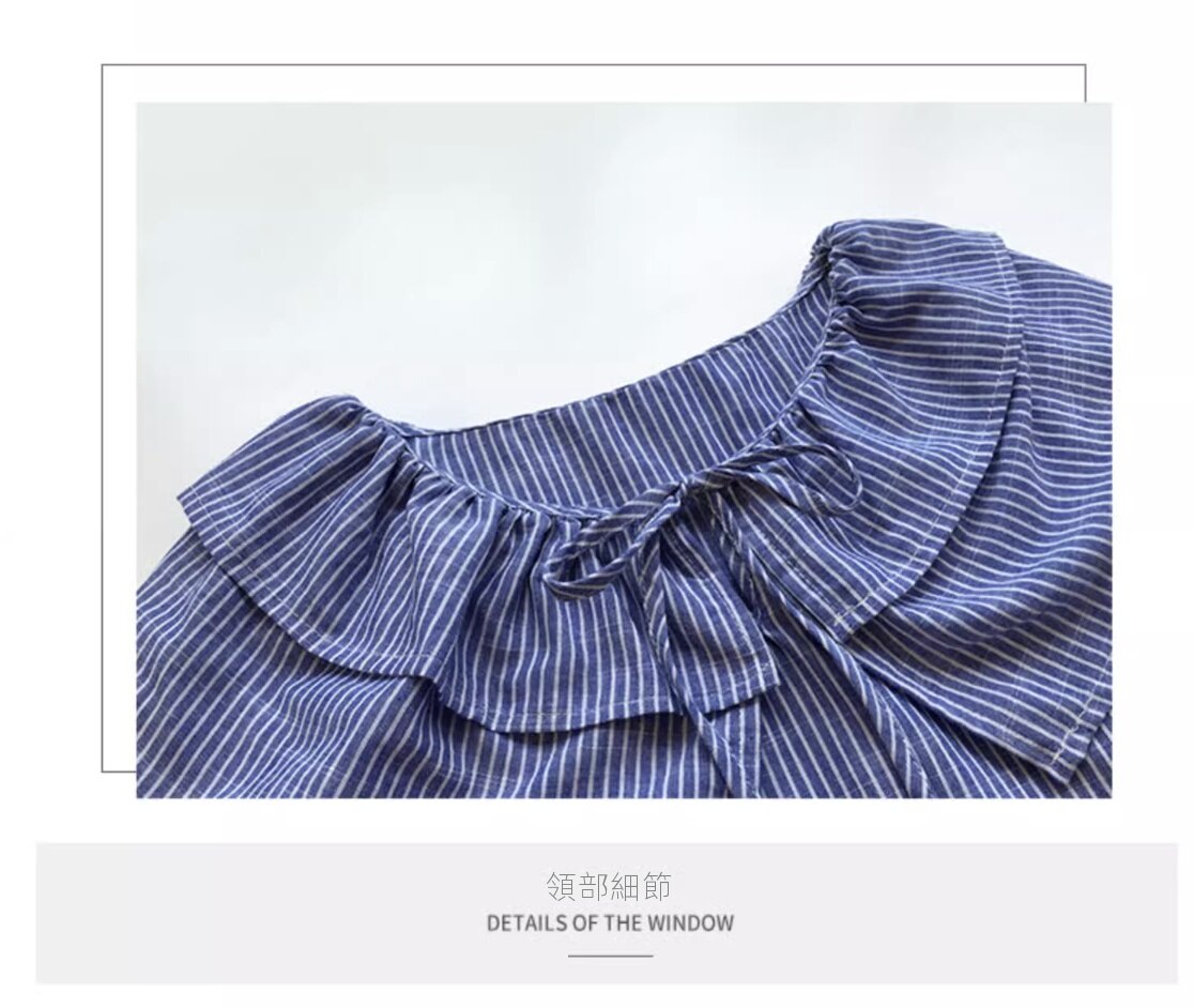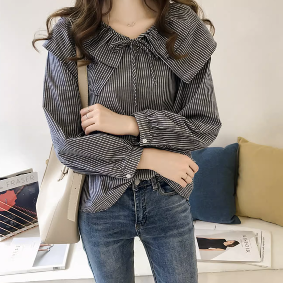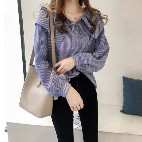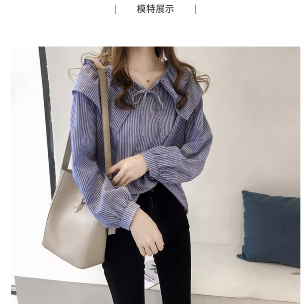 韓版chic休閒寬鬆娃娃領蝴蝶結溫柔風條紋襯衫