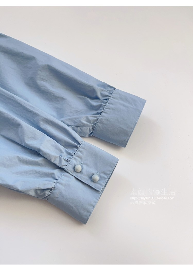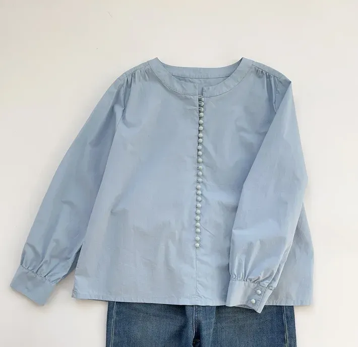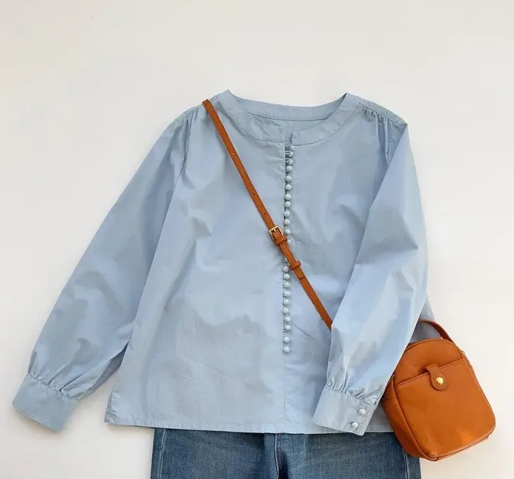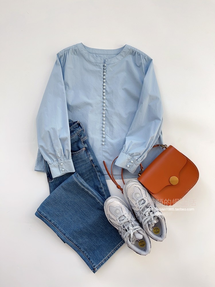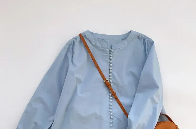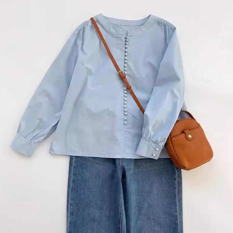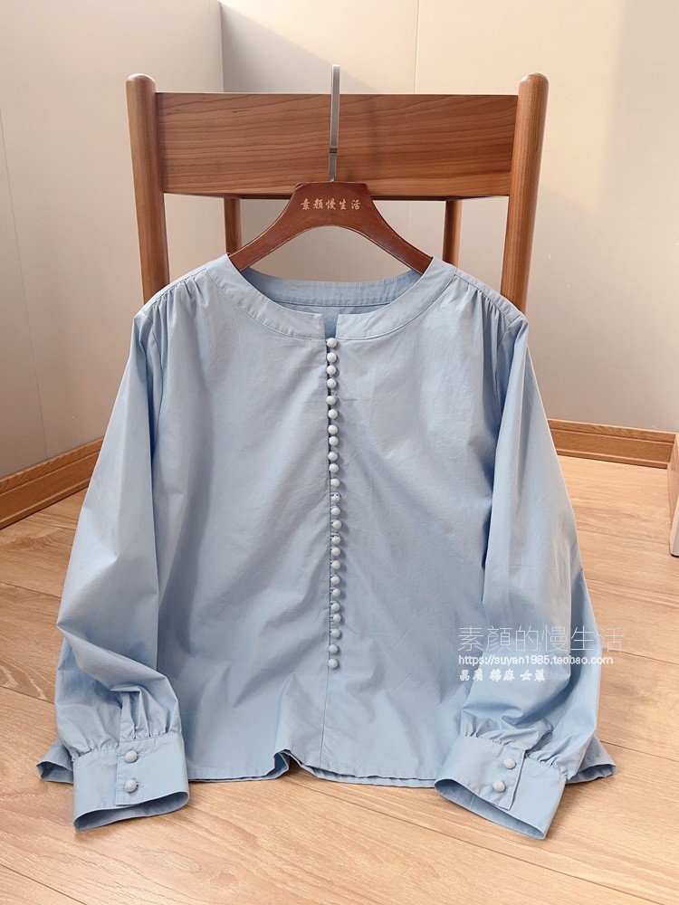 韓系霧霾藍圓領小眾棉質排扣襯衫