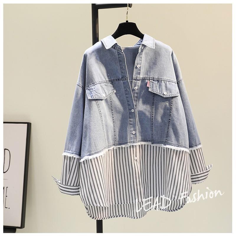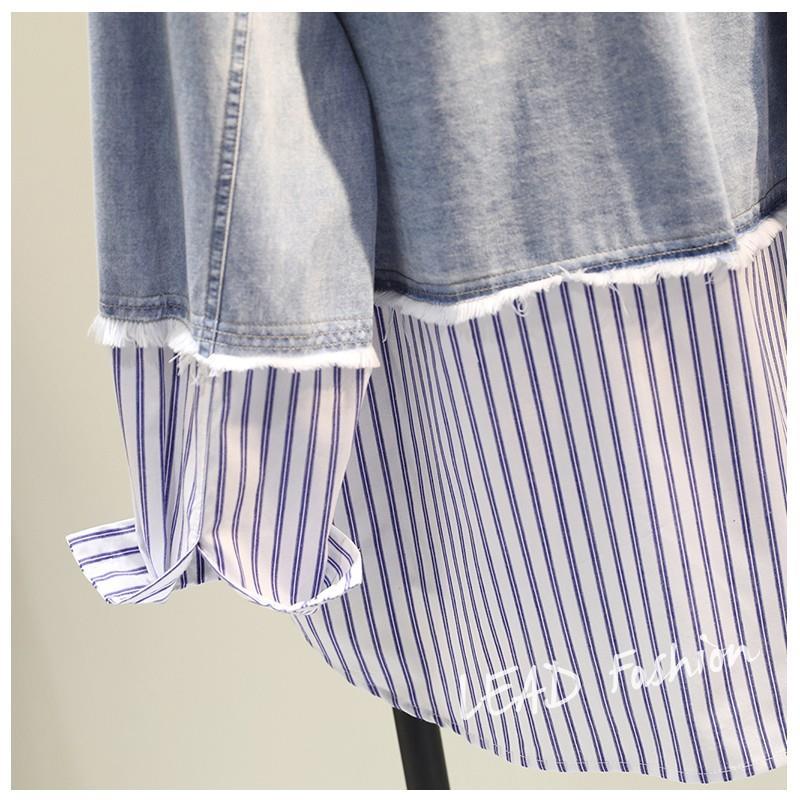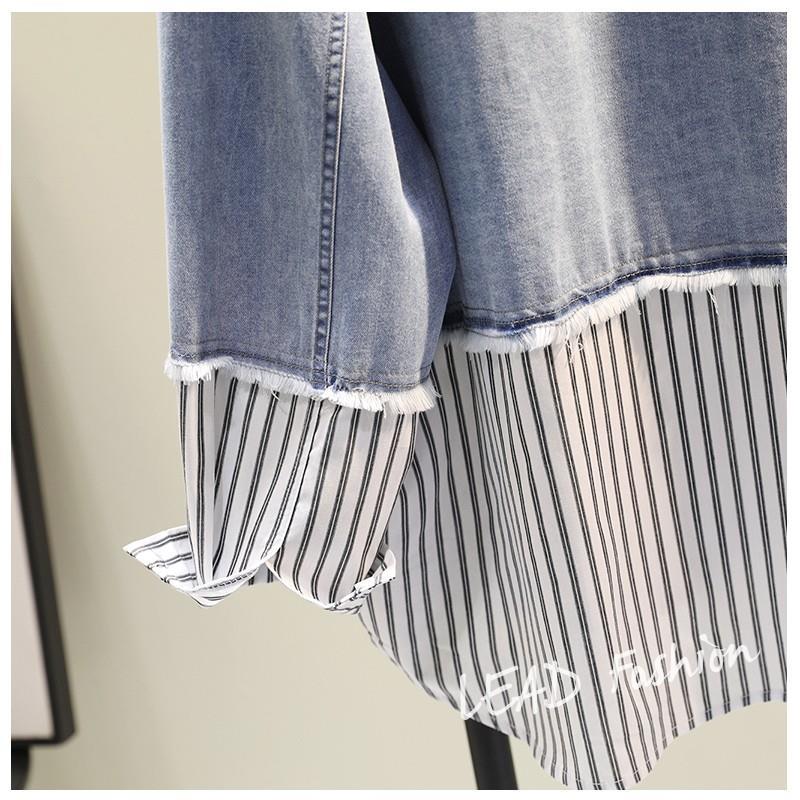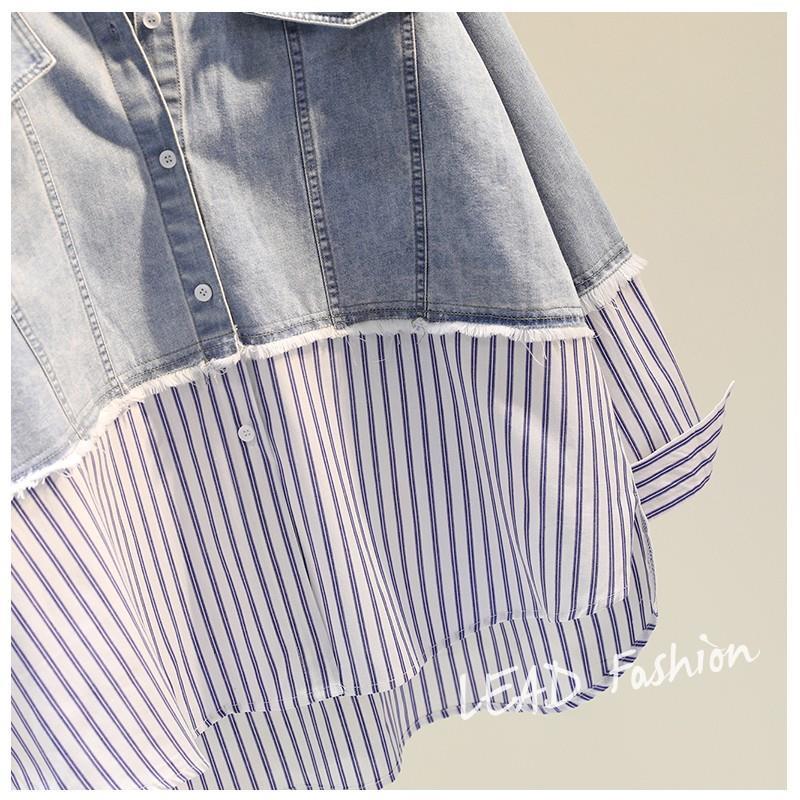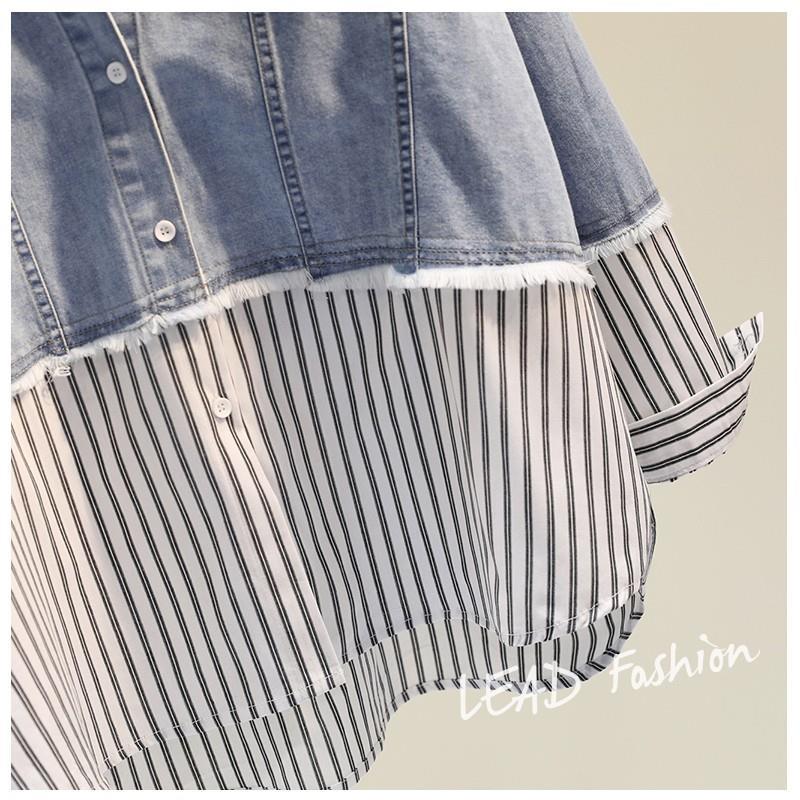 時尚百搭假兩件牛仔拼接豎條紋襯衫
