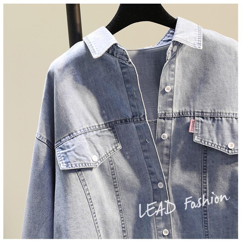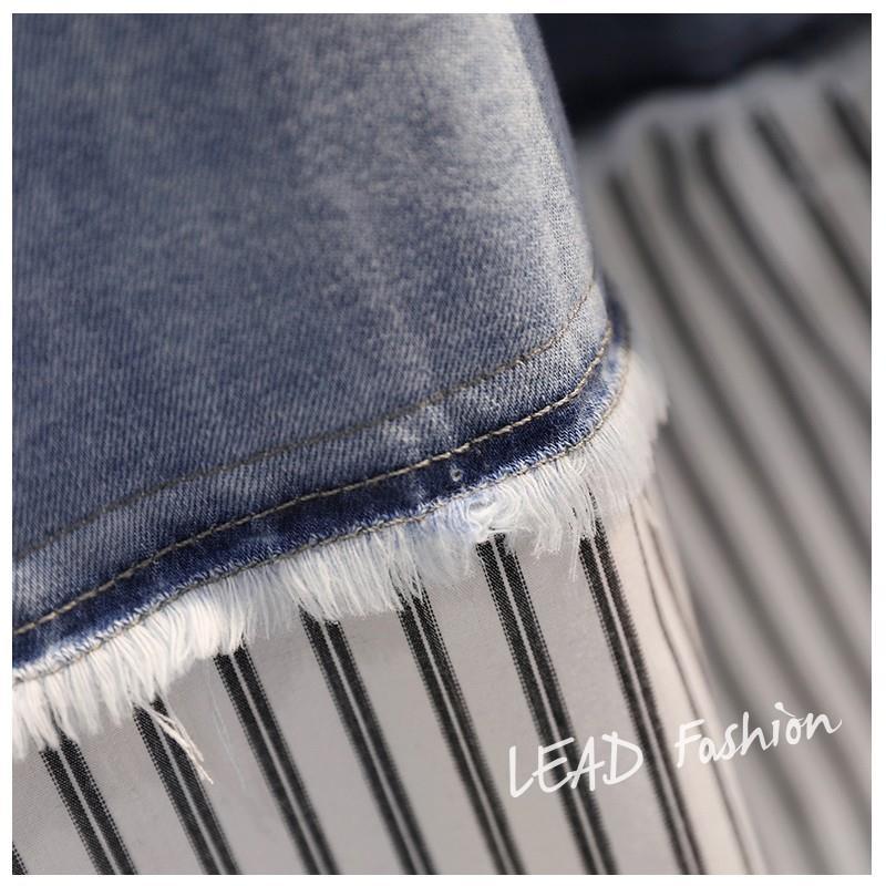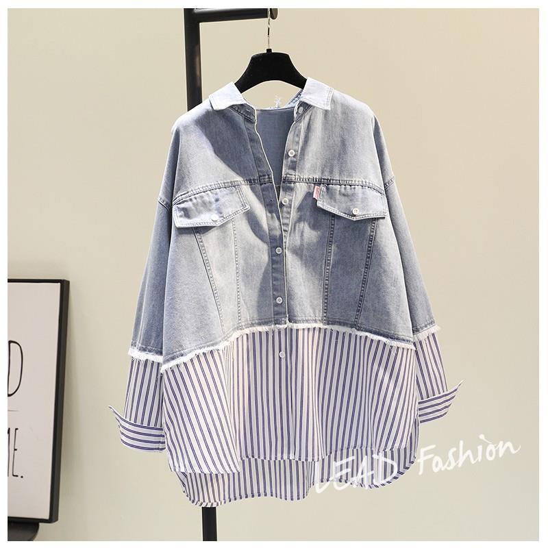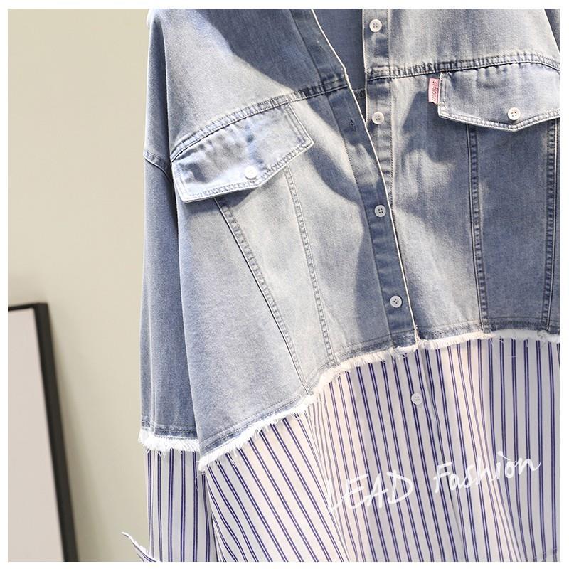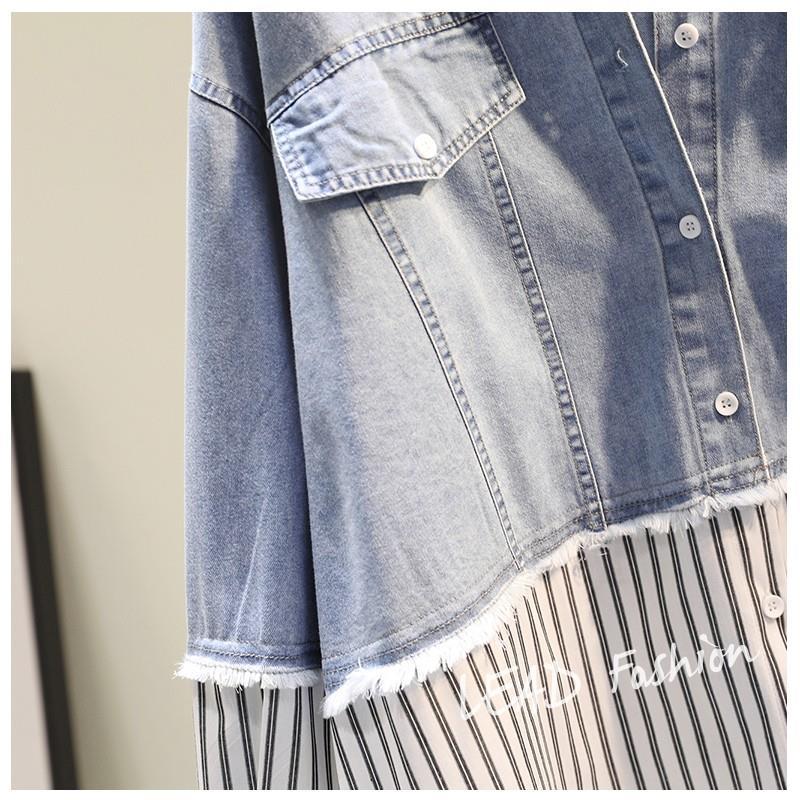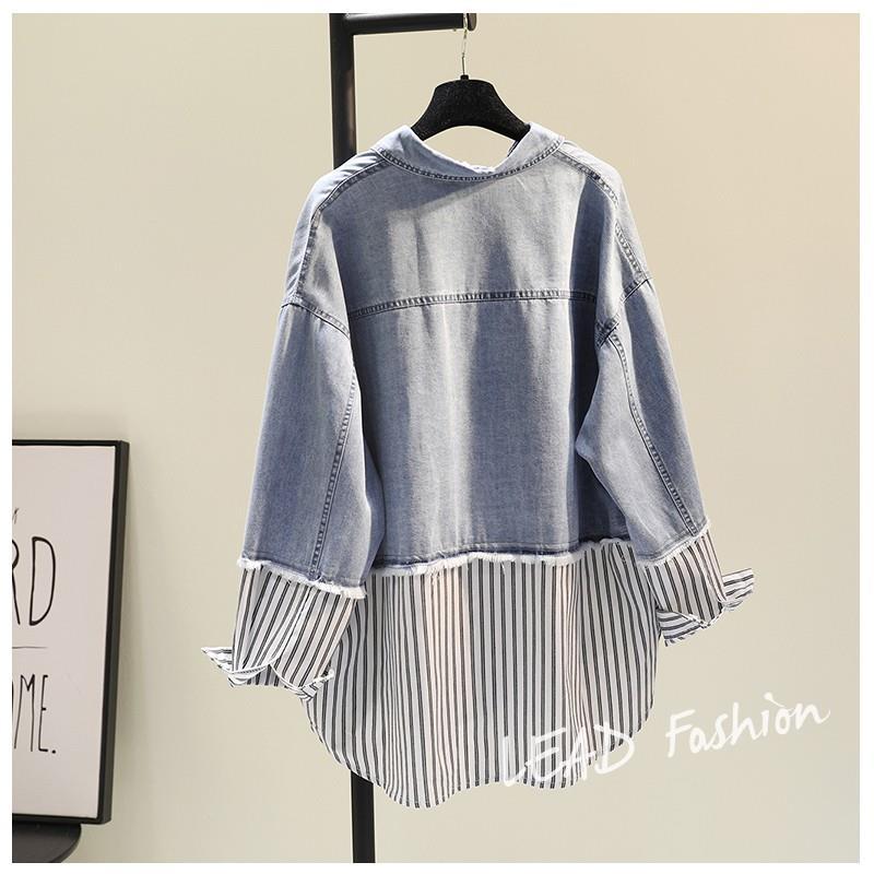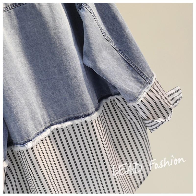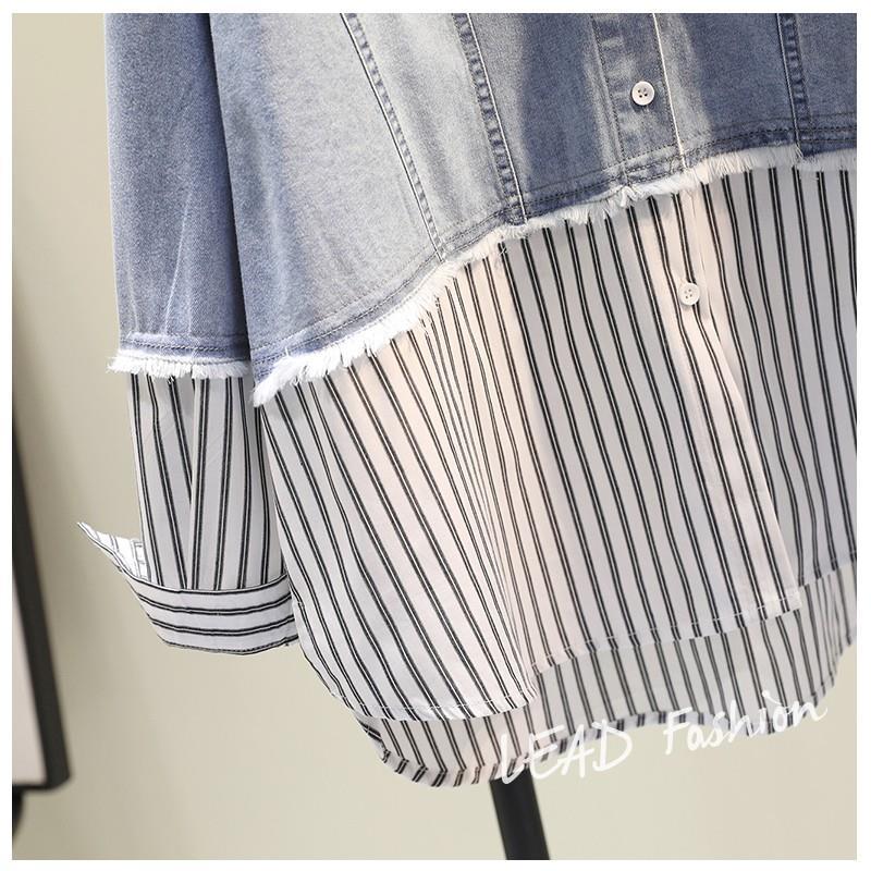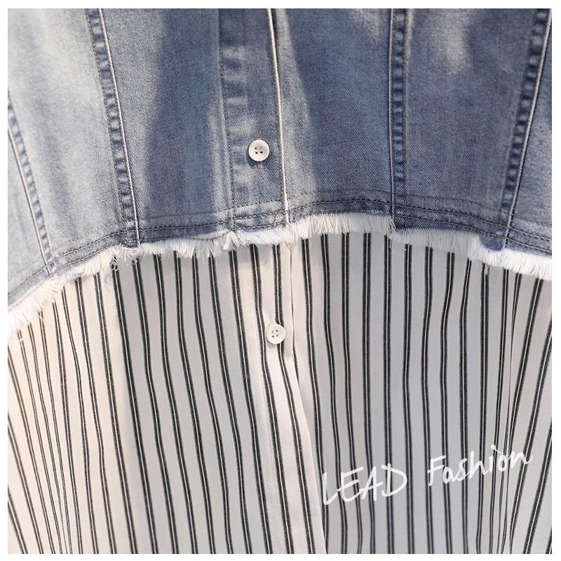 時尚百搭假兩件牛仔拼接豎條紋襯衫-Cicimode