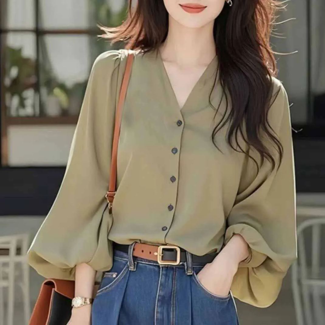 法式氣質漂亮超好看V領雪紡襯衫