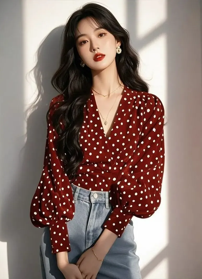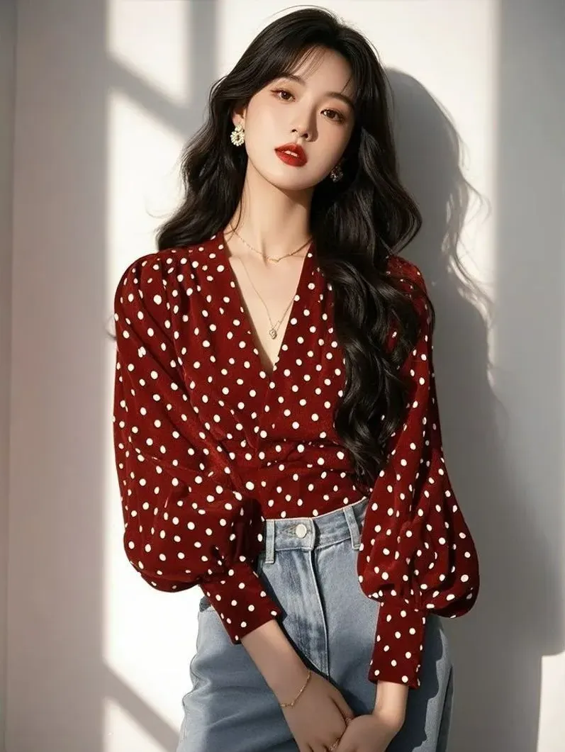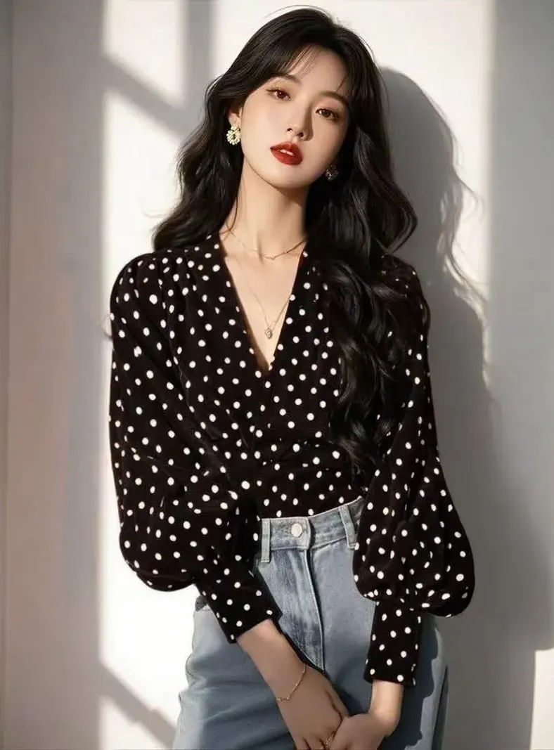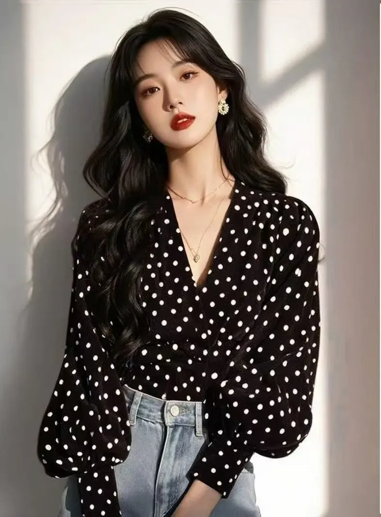 波點法式小眾設計別緻氣質燈籠袖襯衫