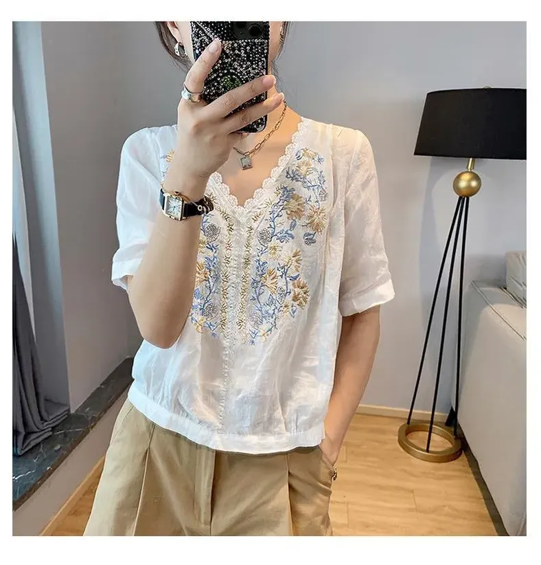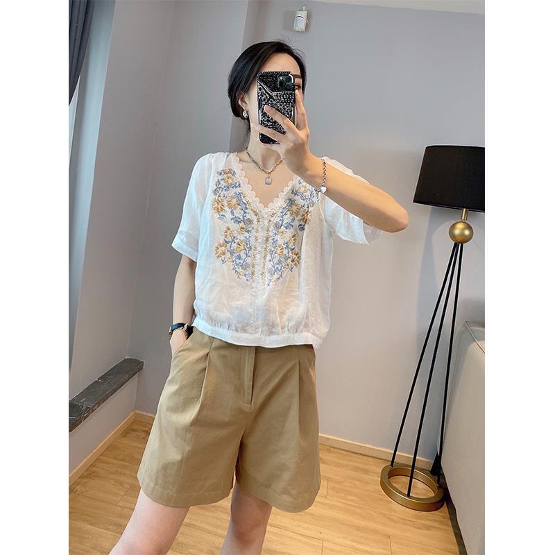 百搭休閒氣質白色蕾絲碎花V領短袖襯衫