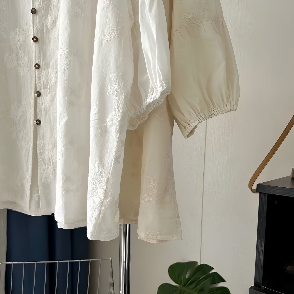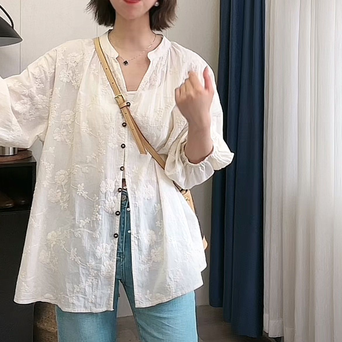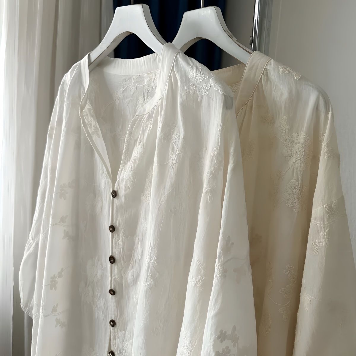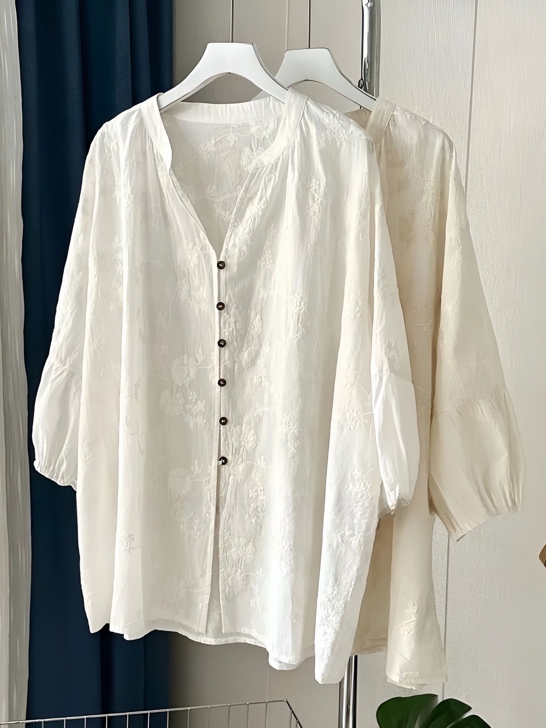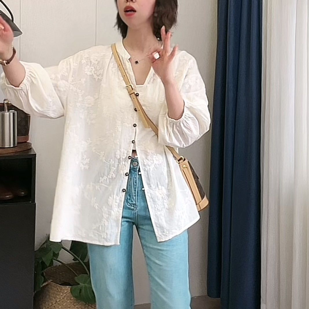 提花刺繡棉質百搭防曬寬鬆七分袖中長款開衫襯衫