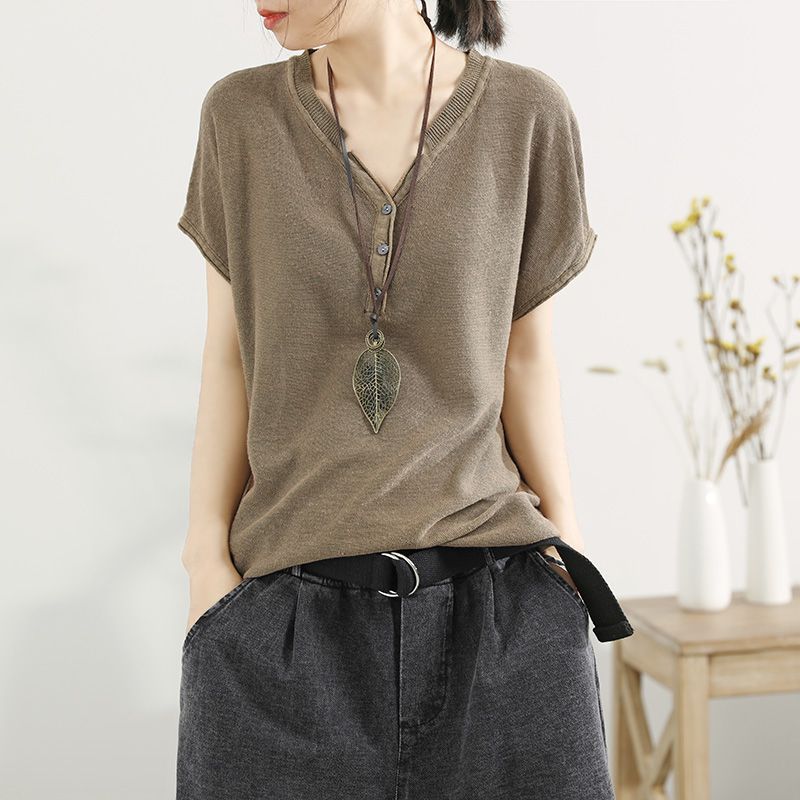 冰絲針織V領韓版套頭薄款打底寬鬆短袖