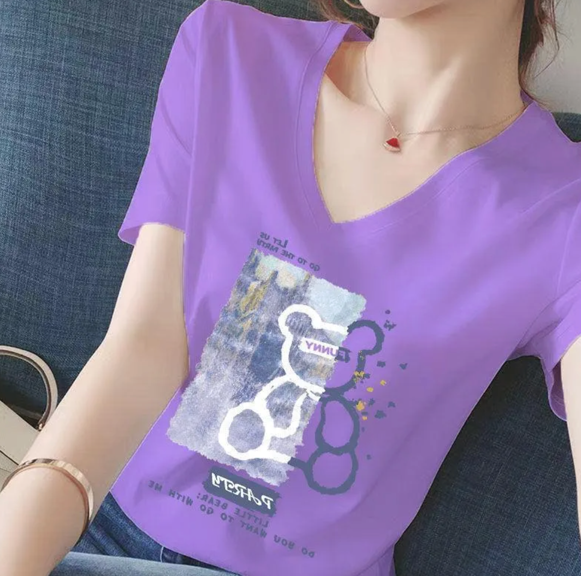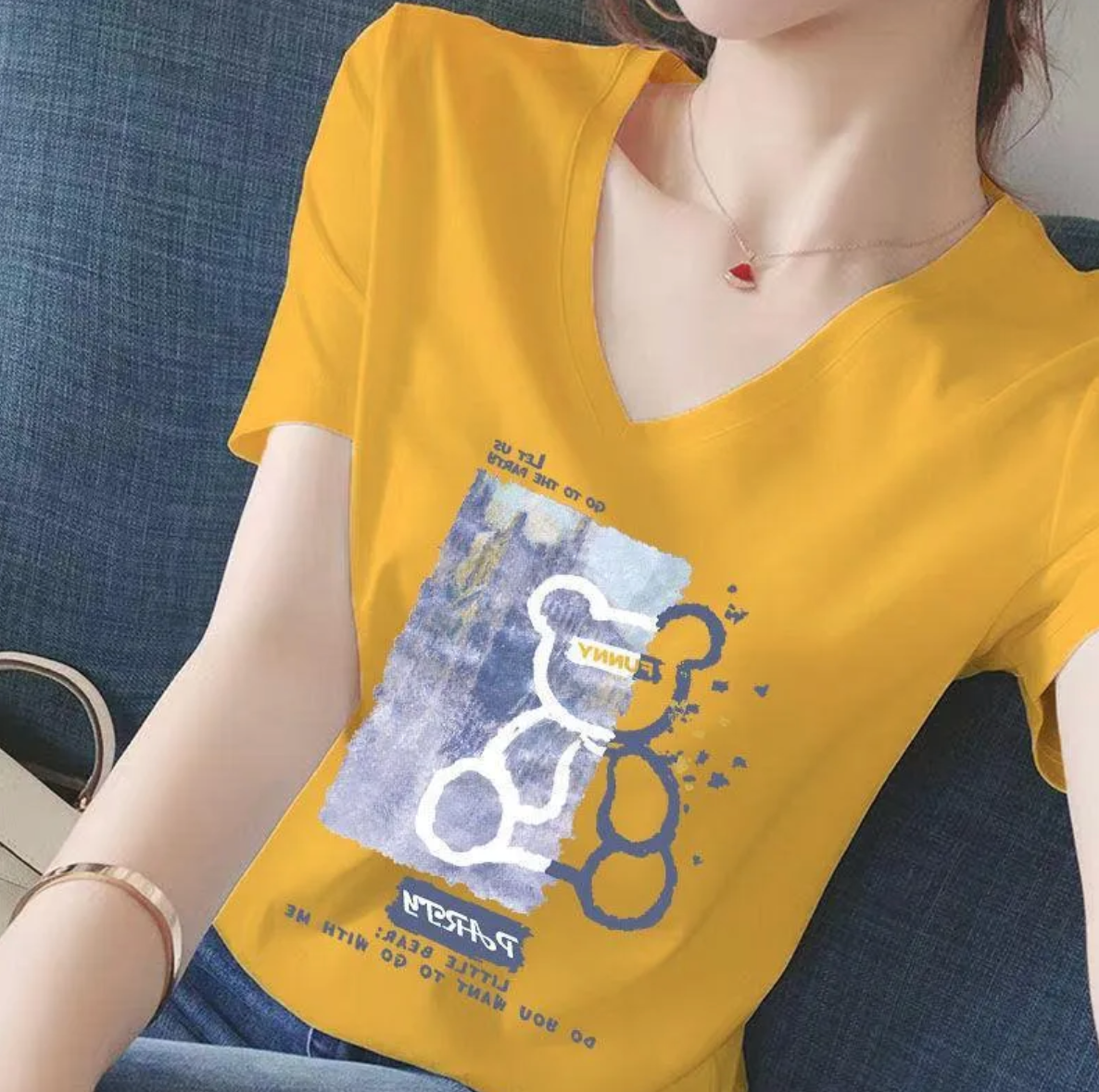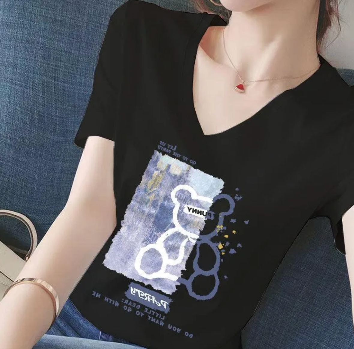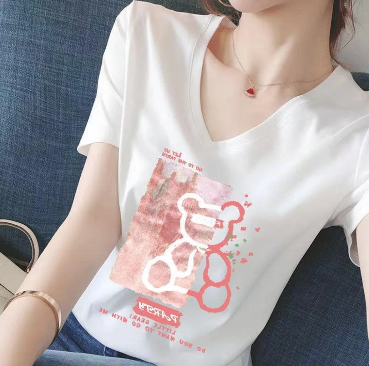 V領卡通熊韓版純棉百搭短袖T恤-Cicimode