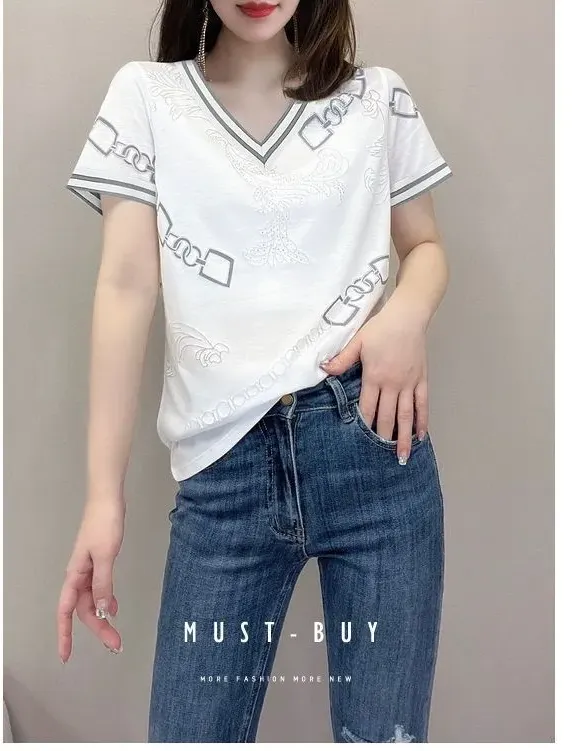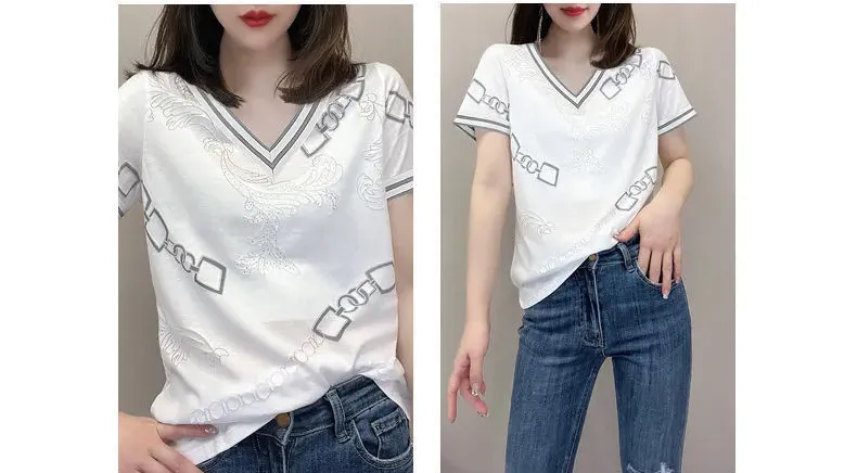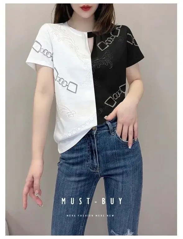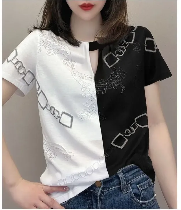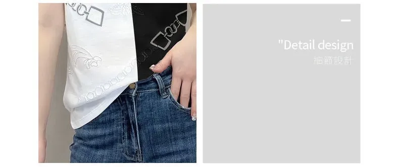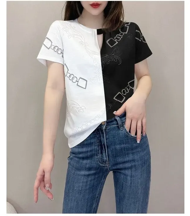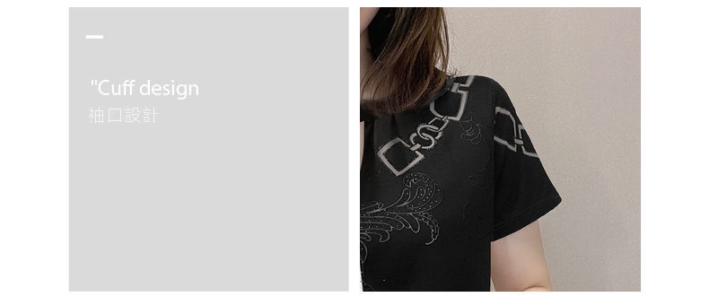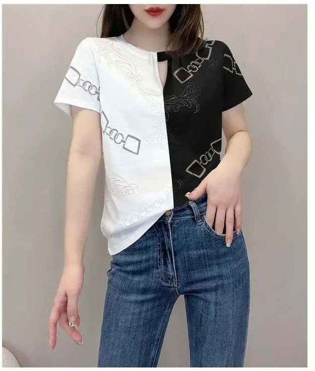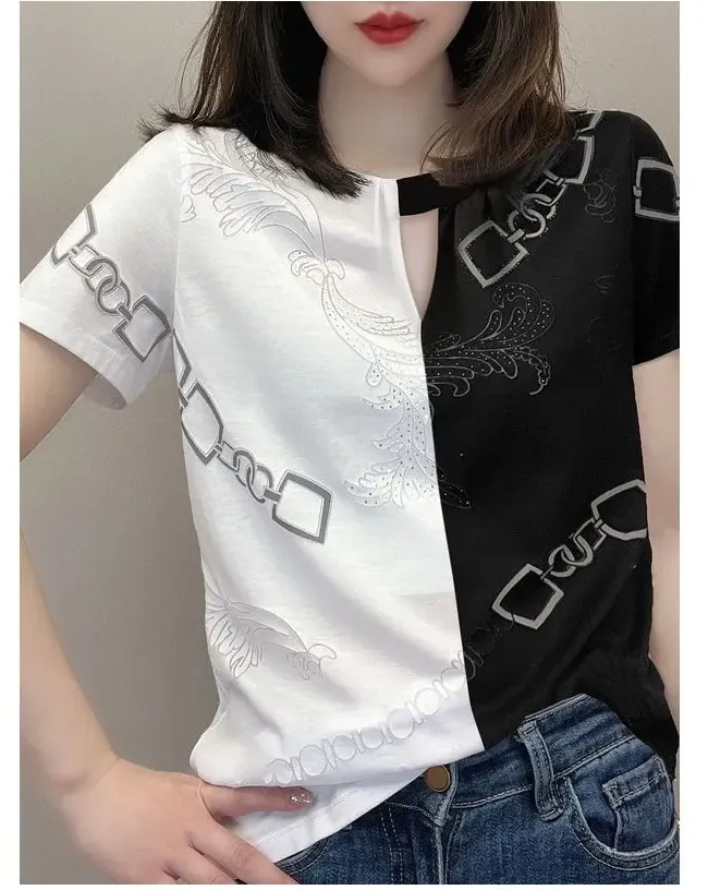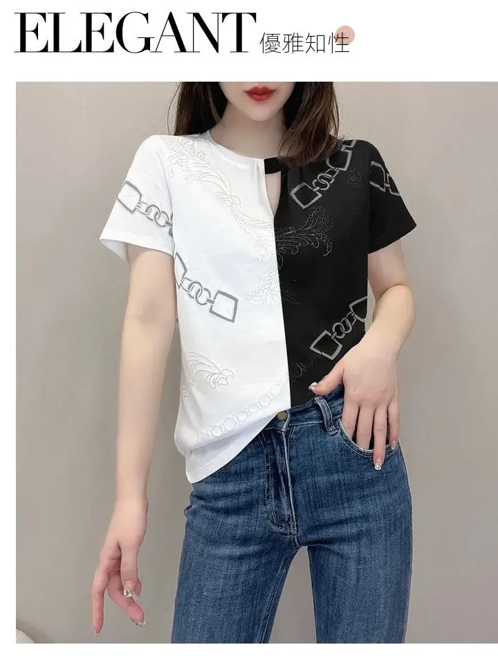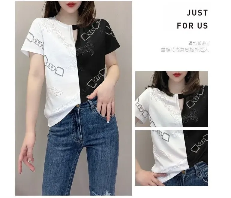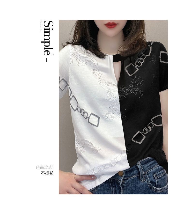 休閒設計感拼色短款印花圓領短袖