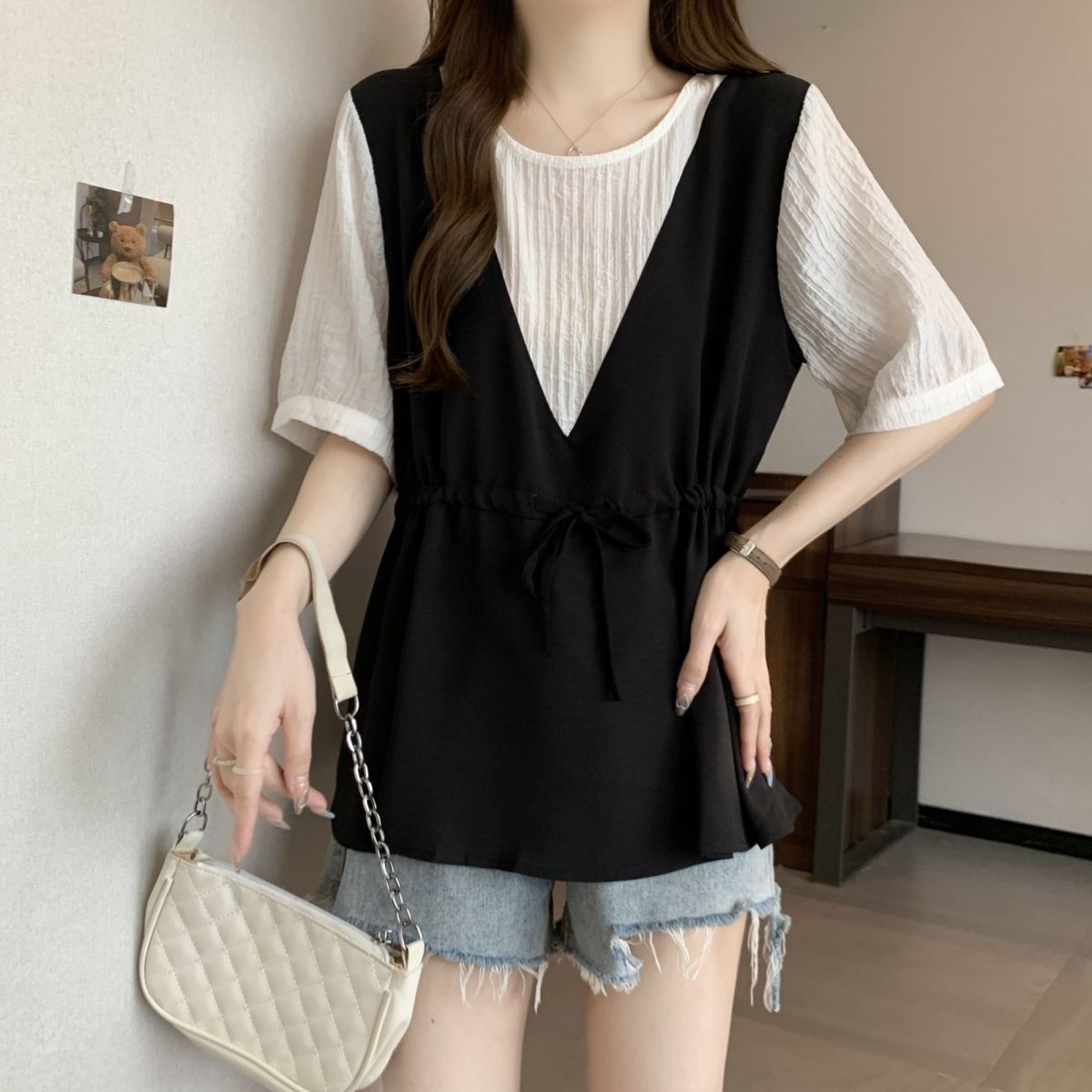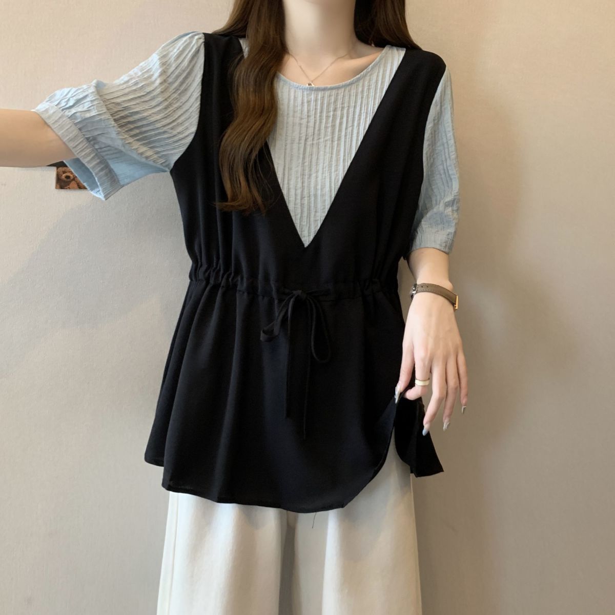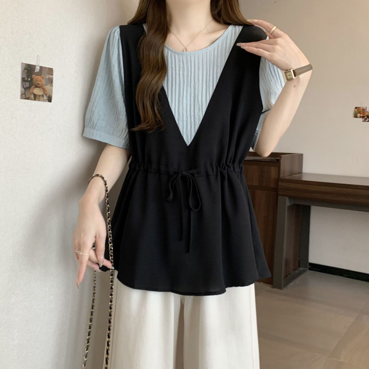 韓版假兩件設計感撞色收腰系帶顯瘦短袖
