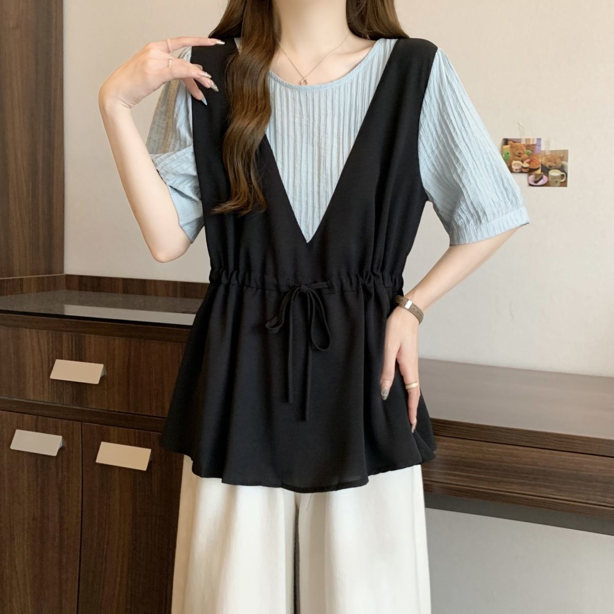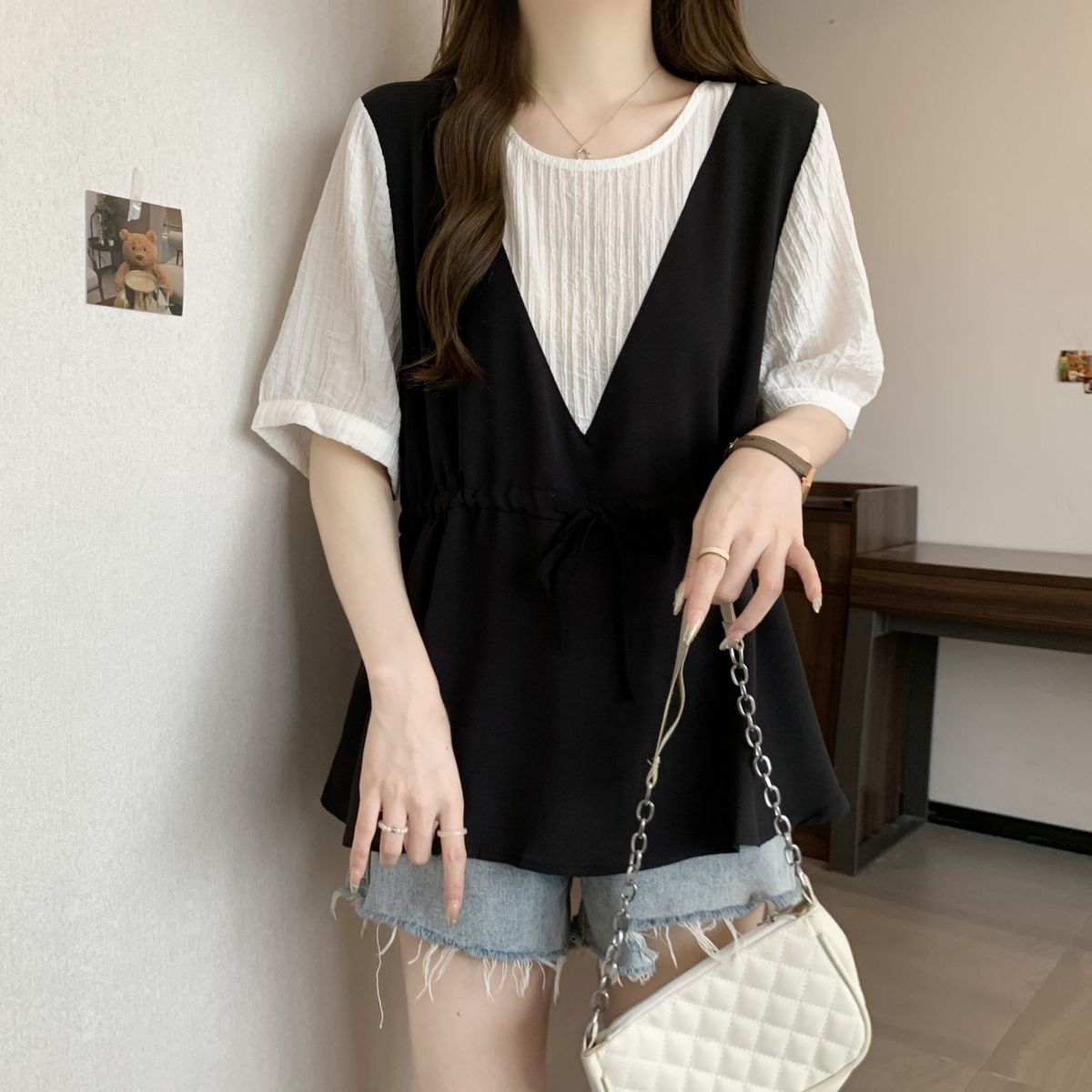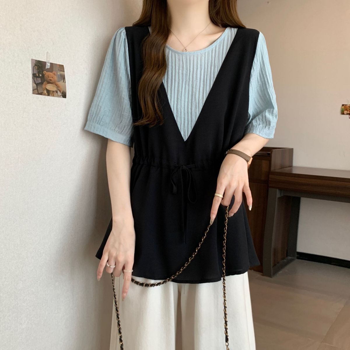 韓版假兩件設計感撞色收腰系帶顯瘦短袖