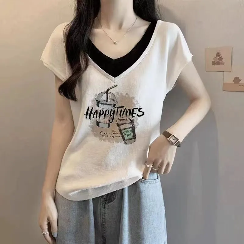 純棉多款式洋氣寬鬆大碼顯瘦V領假兩件短袖T恤