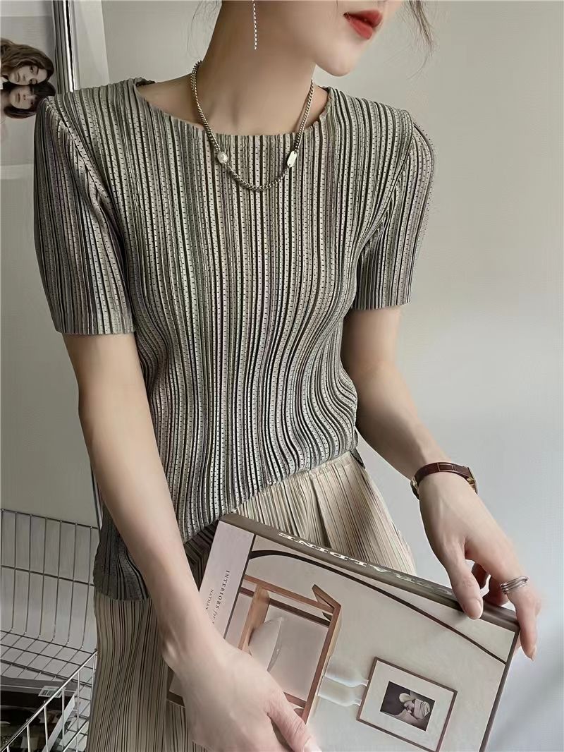壓褶氣質薄款彈力圓領百搭修身短袖T恤
